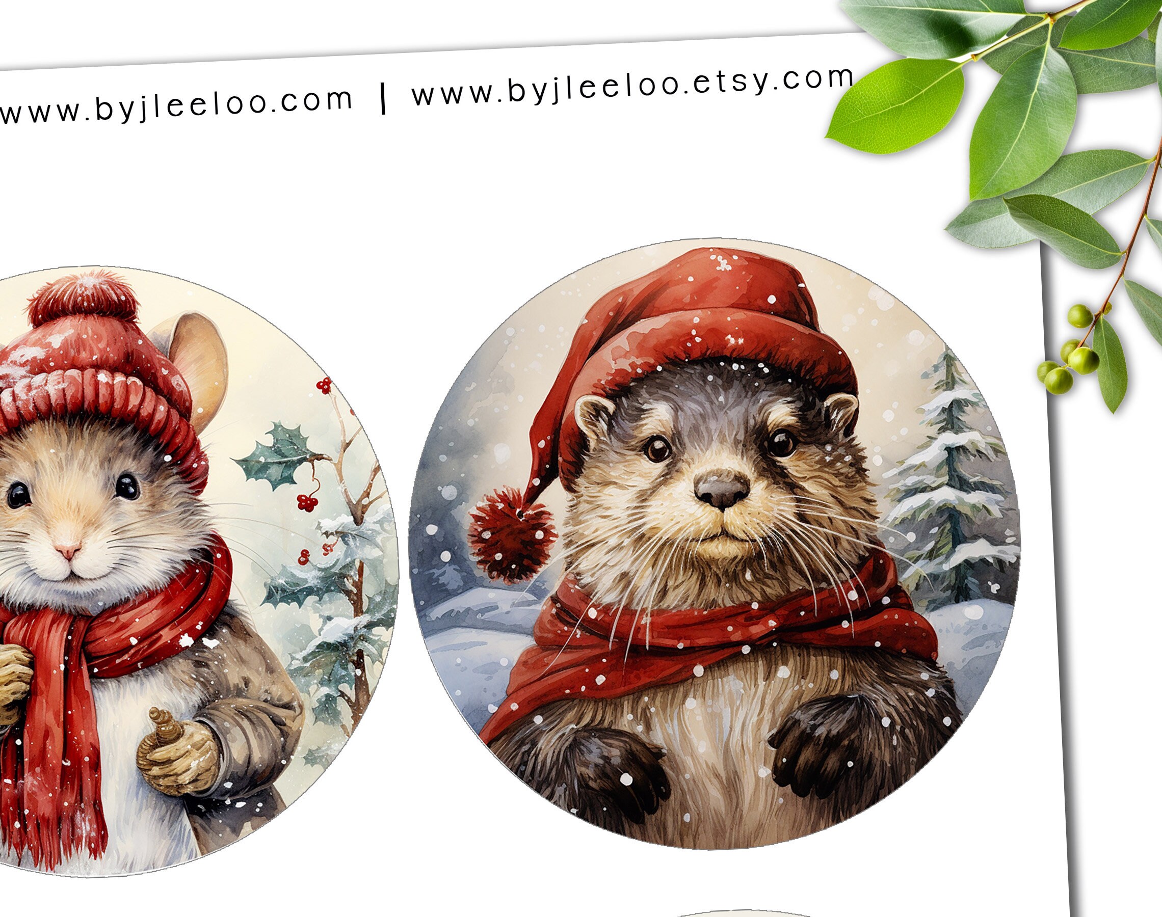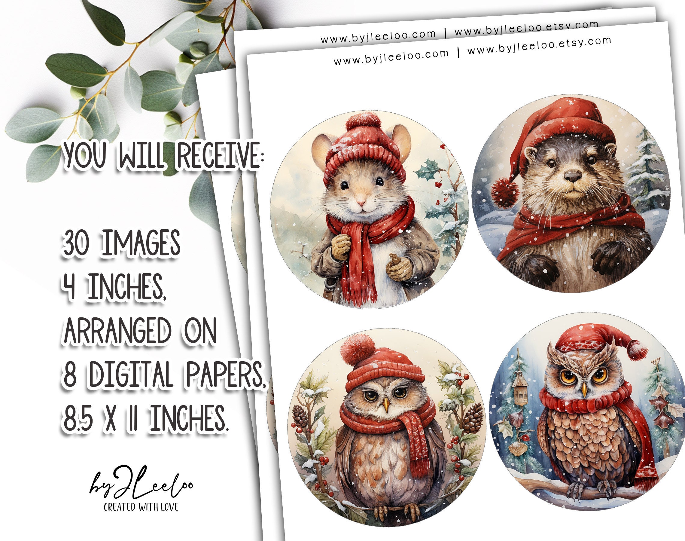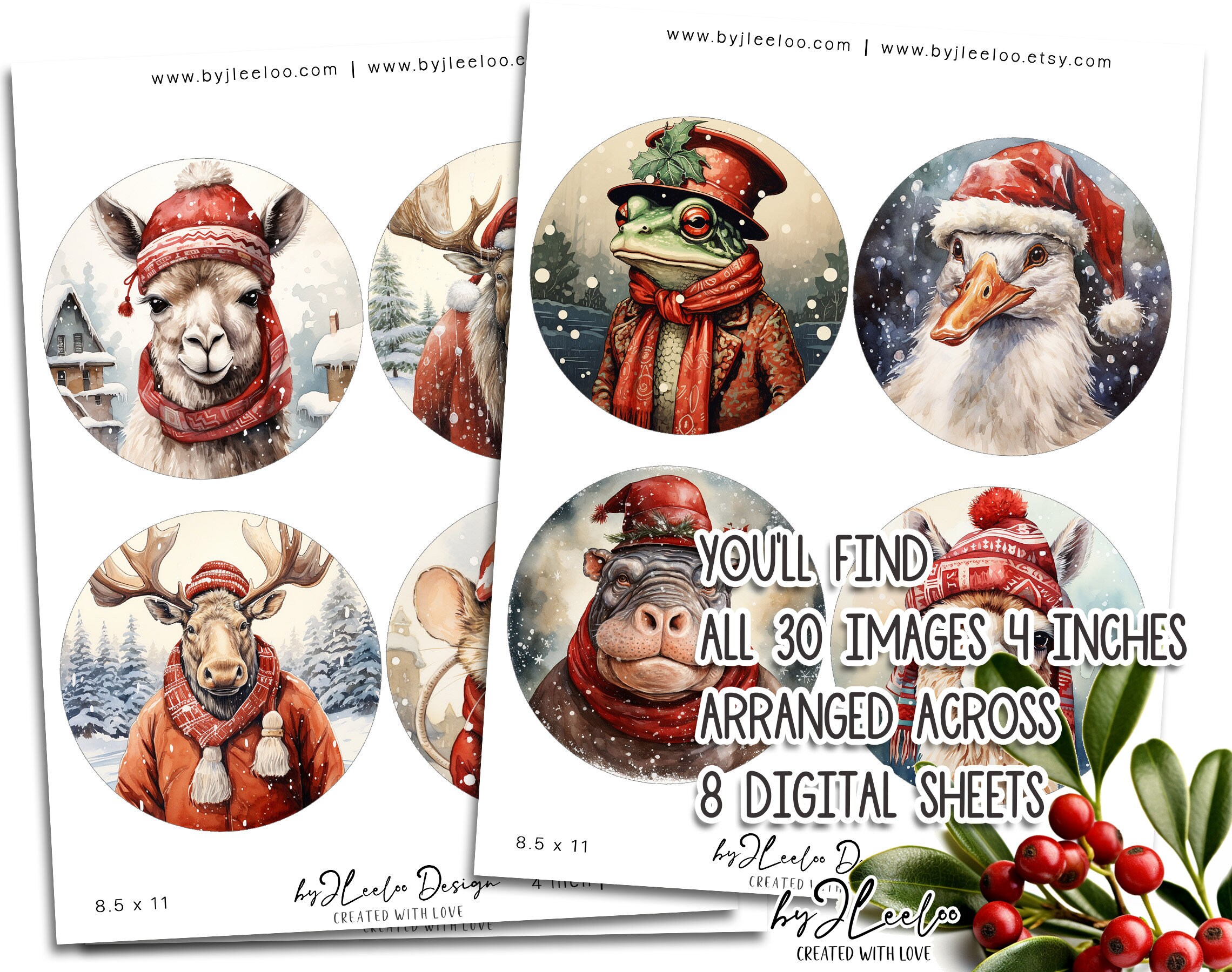 Transform your creative projects into winter wonderlands with our enchanting set of 30 circular illustrations. Delightful animals, adorned in vibrant red Santa Claus hats and scarves, come to life in a Christmas snowscape, radiating a festive atmosphere reminiscent of the cottagepunk aesthetic.