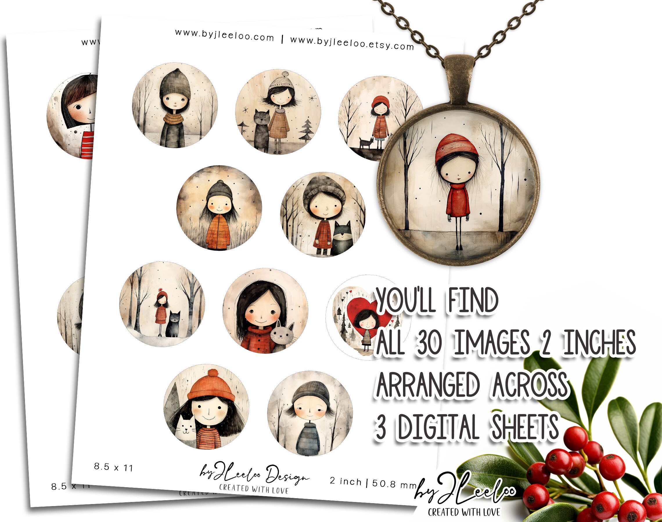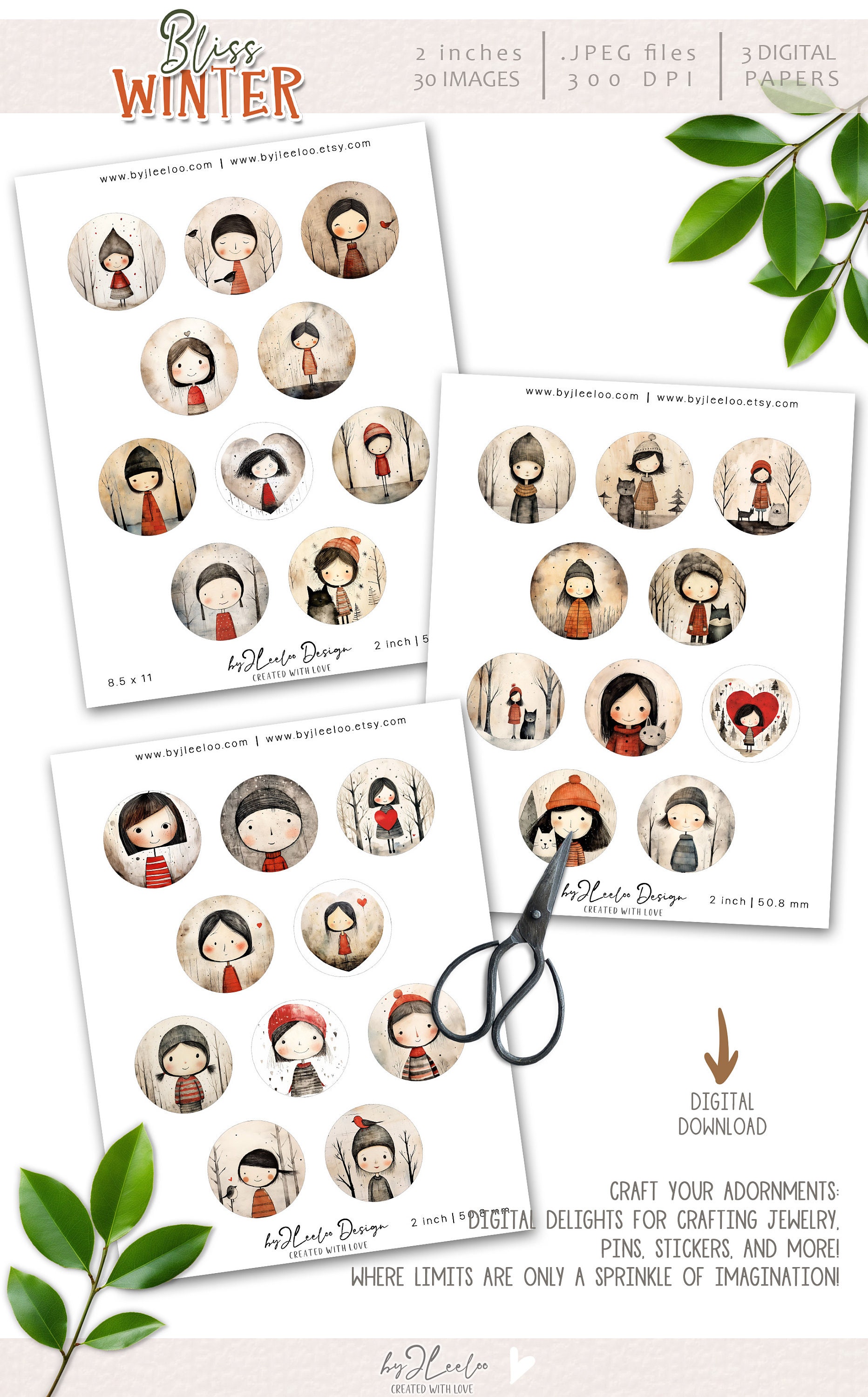 WINTER BLISS 2 inch printable Christmas | Holidays supplies round pendants charms glass cabochon magnet | journal scrapbooking craft | tn700
