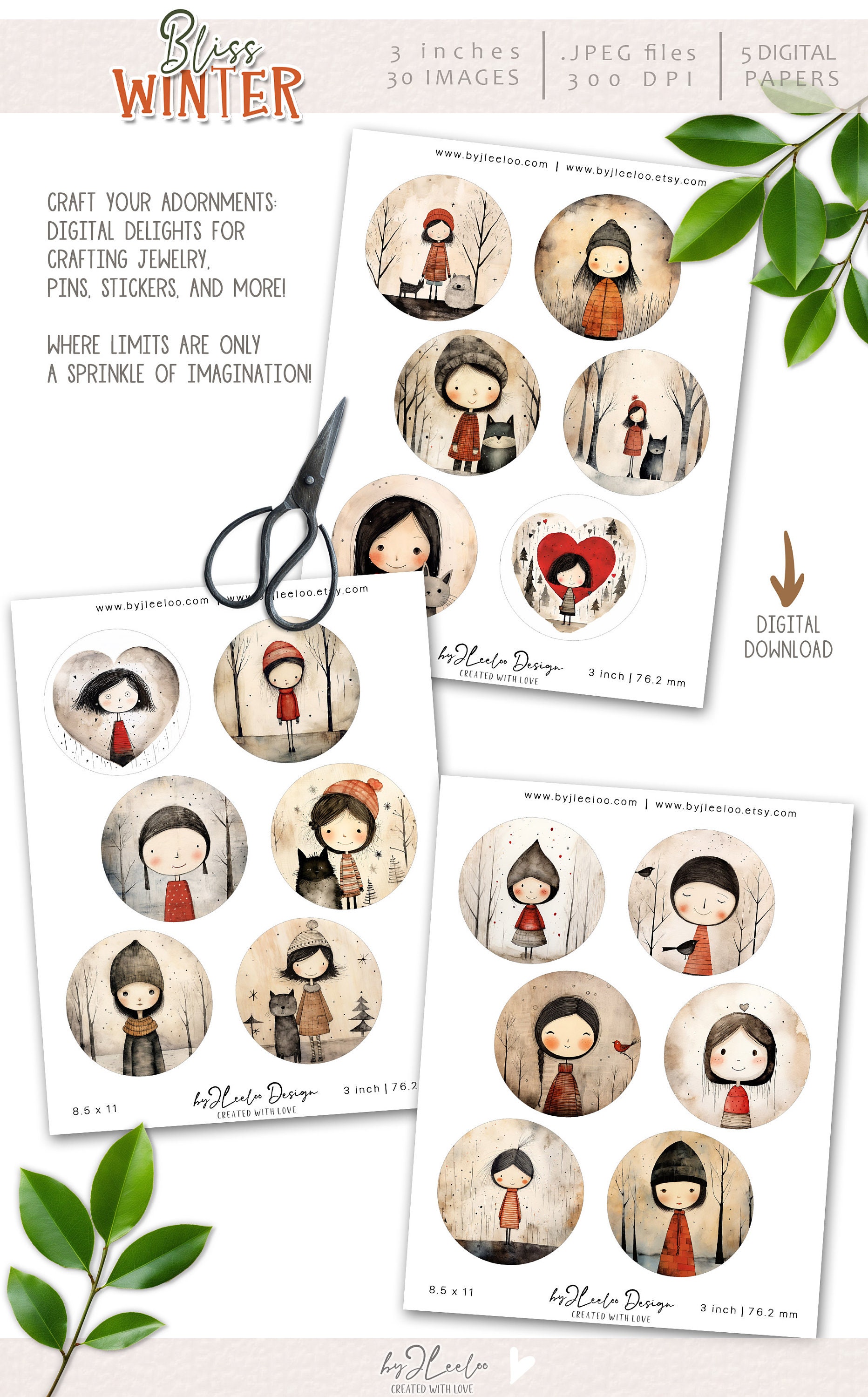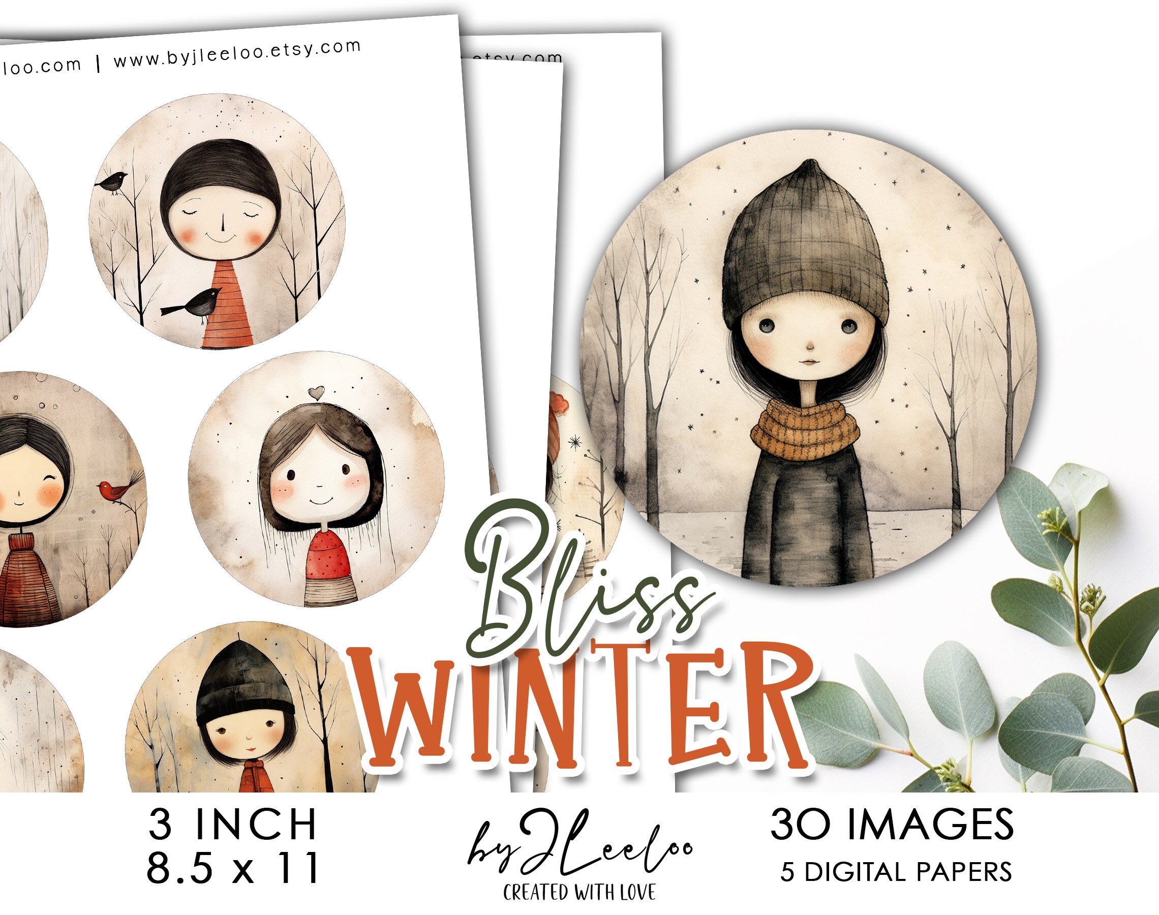 WINTER BLISS 3 inch printable Christmas | Holidays supplies round pendant charm glass cabochon magnet | journal scrapbooking craft | tn702