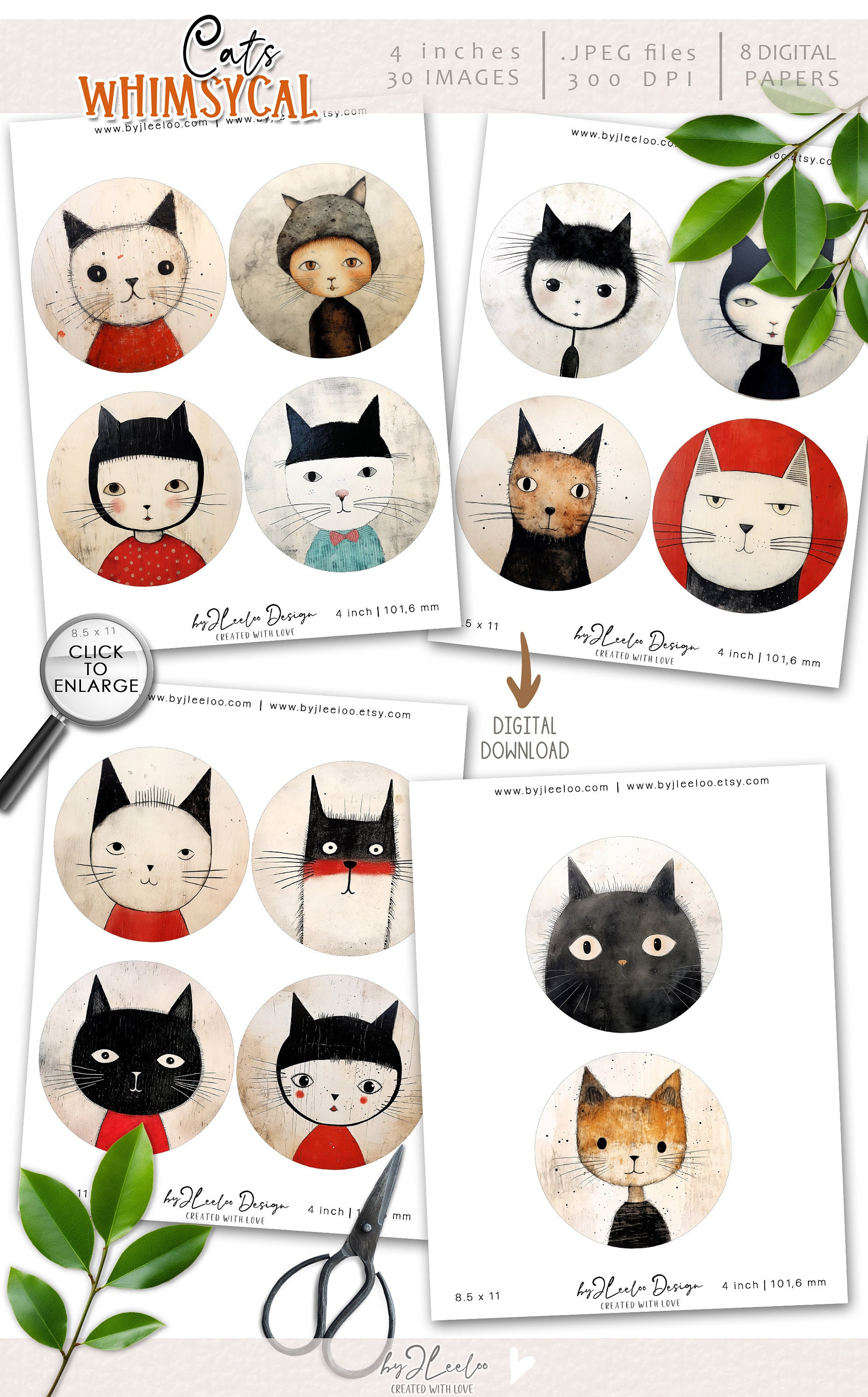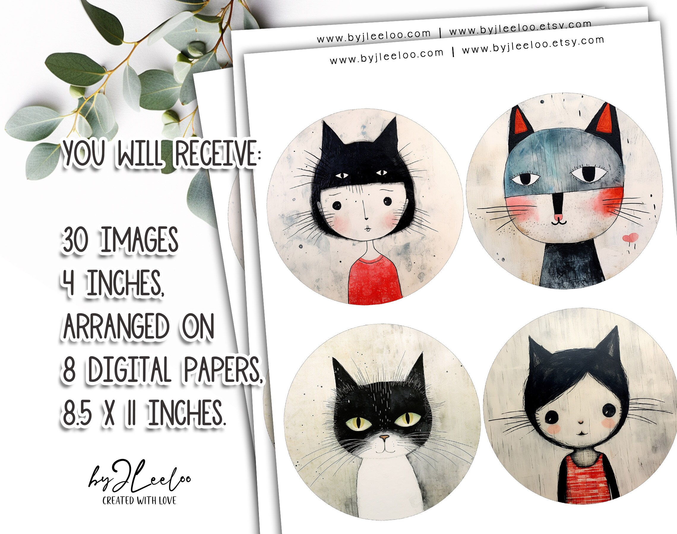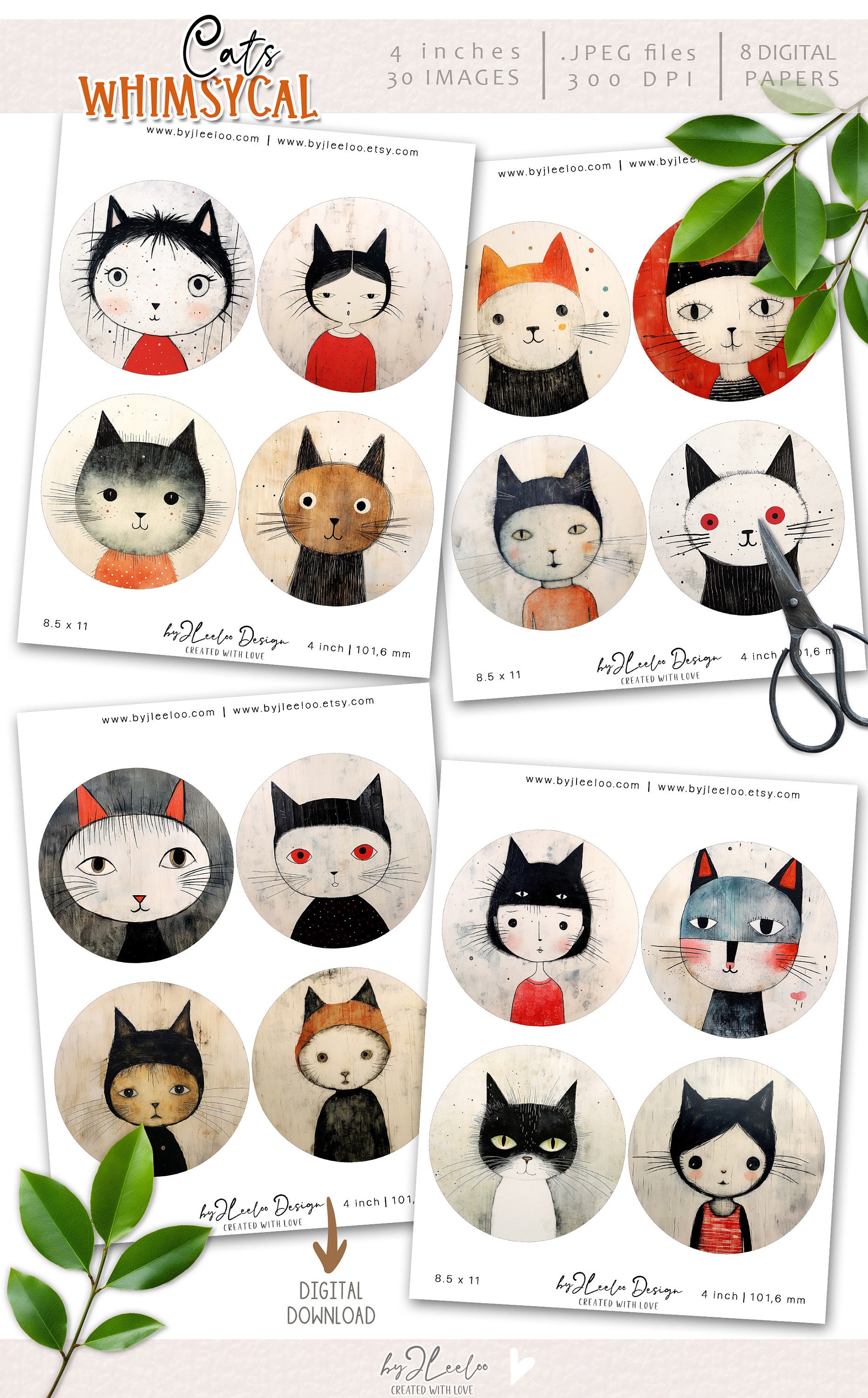 WHIMSICAL CATS 4 inch printable | supplies round pendant sticker charms glass cabochon magnet | ornaments journal scrapbooking craft | tn709