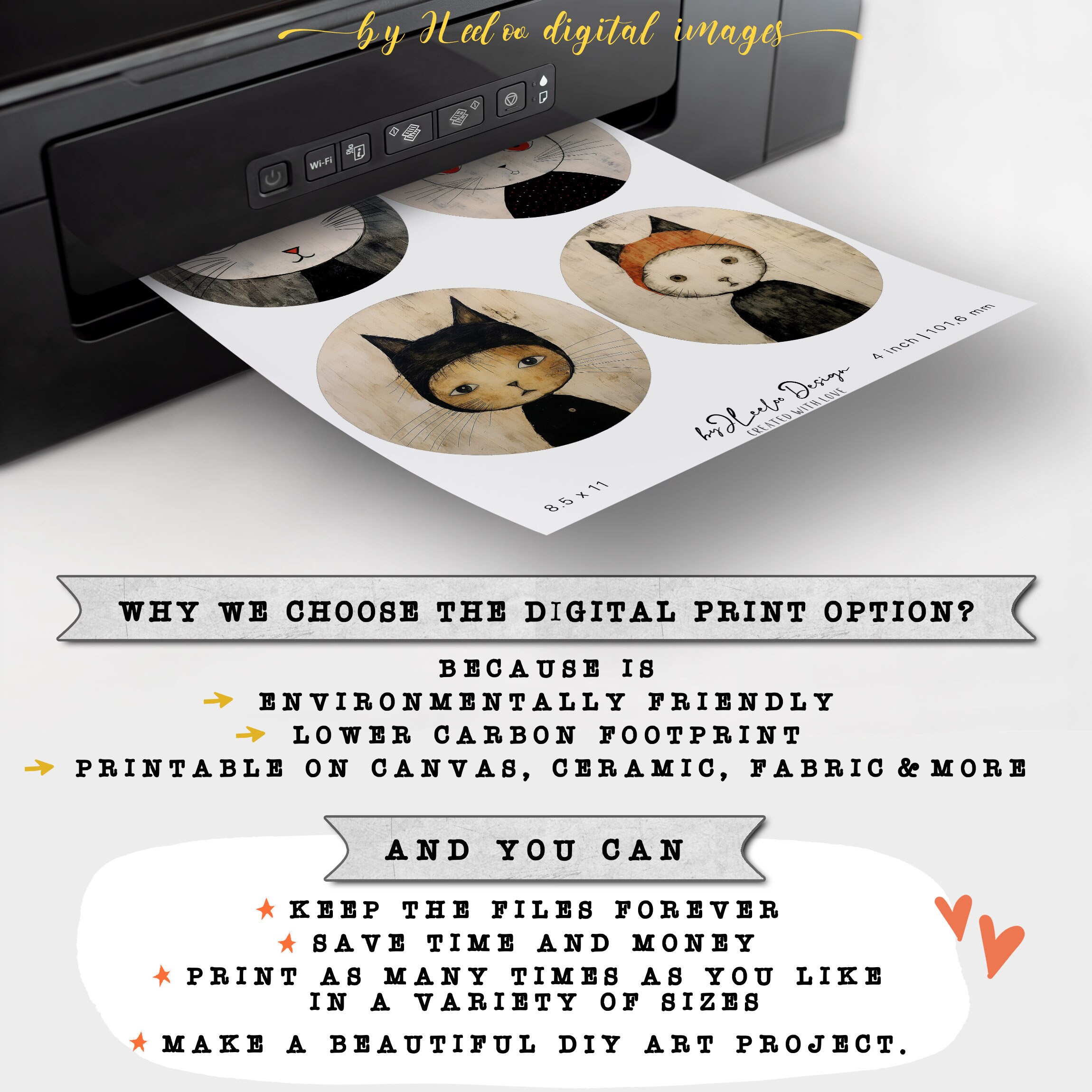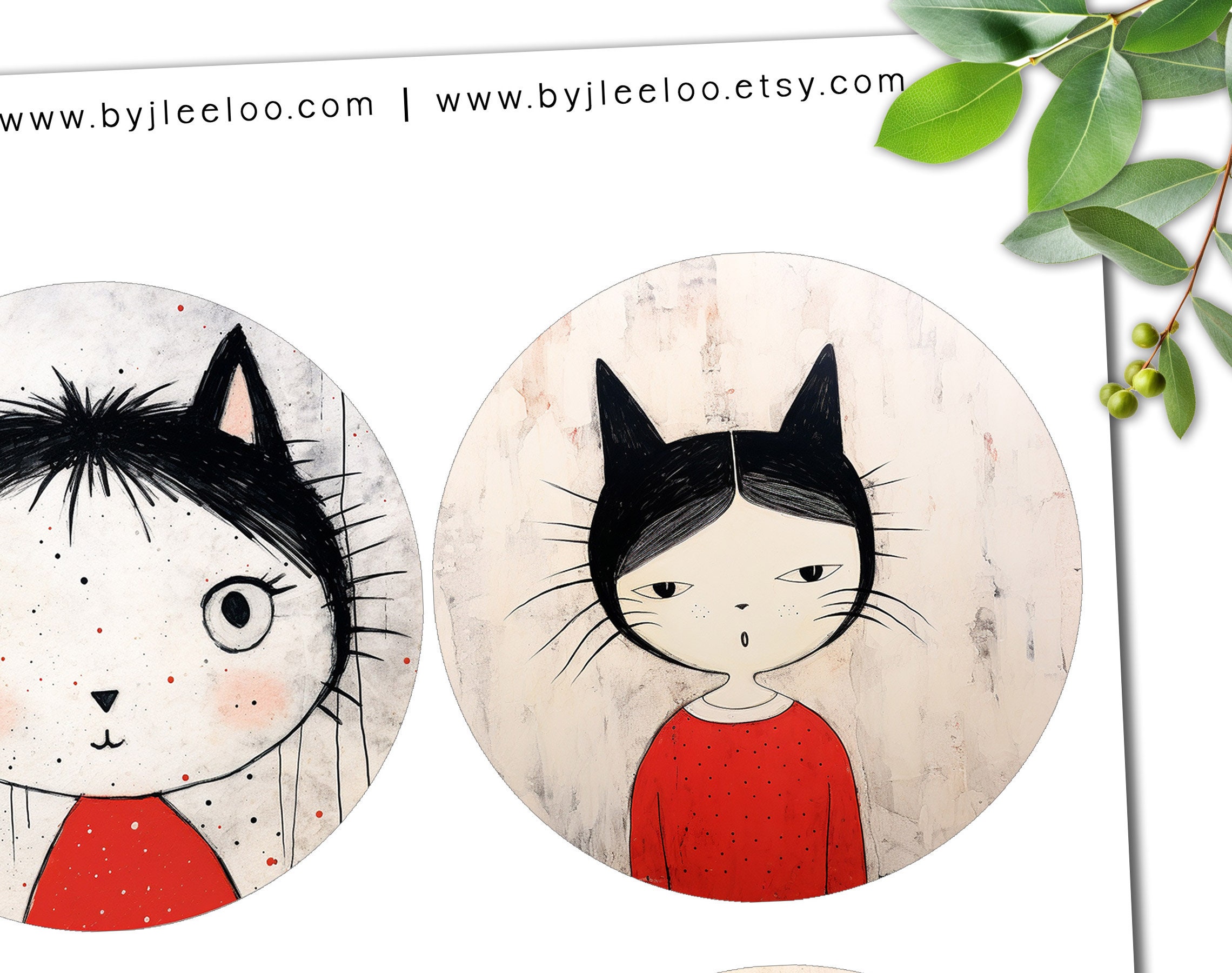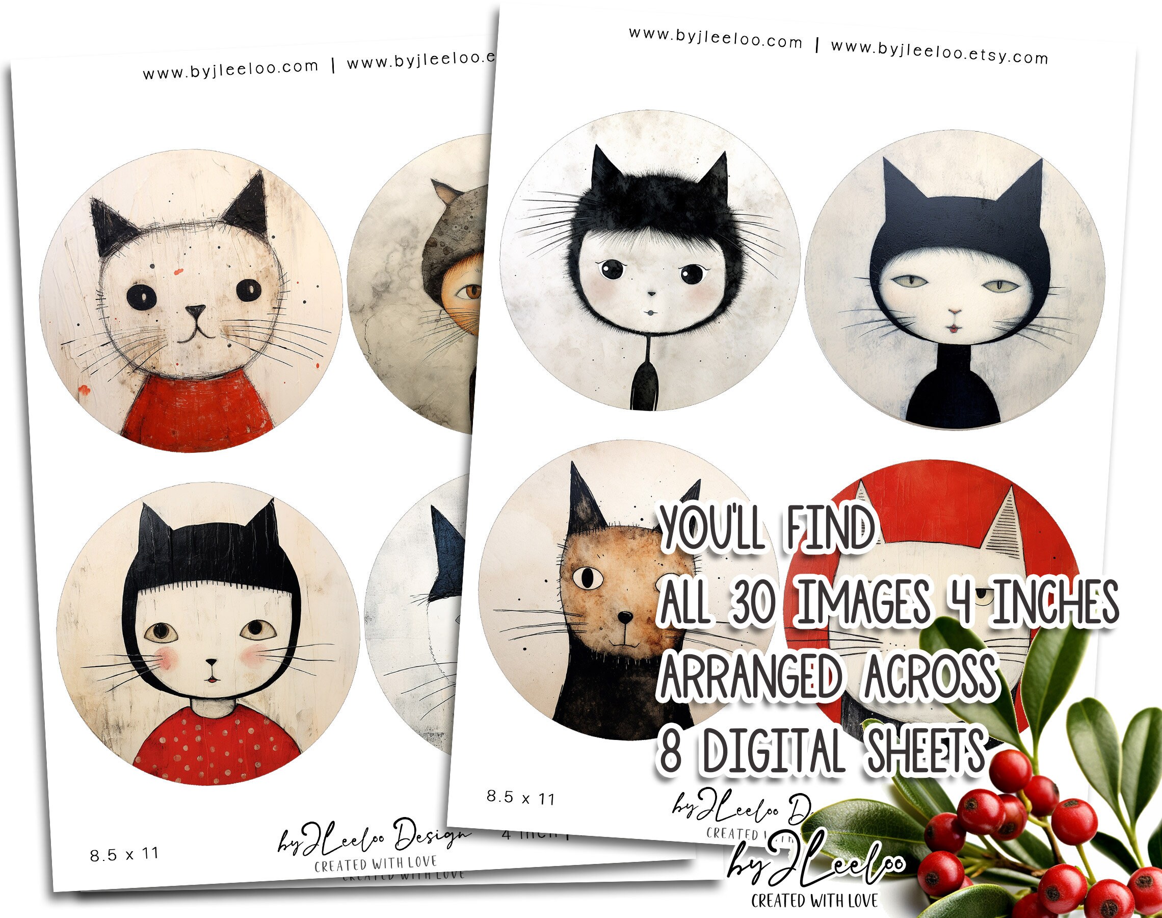 WHIMSICAL CATS 4 inch printable | supplies round pendant sticker charms glass cabochon magnet | ornaments journal scrapbooking craft | tn709