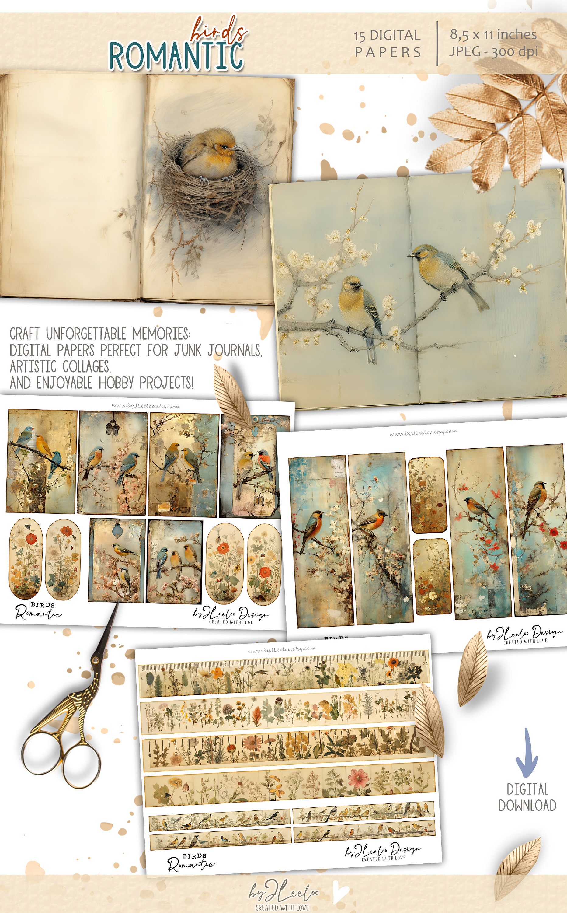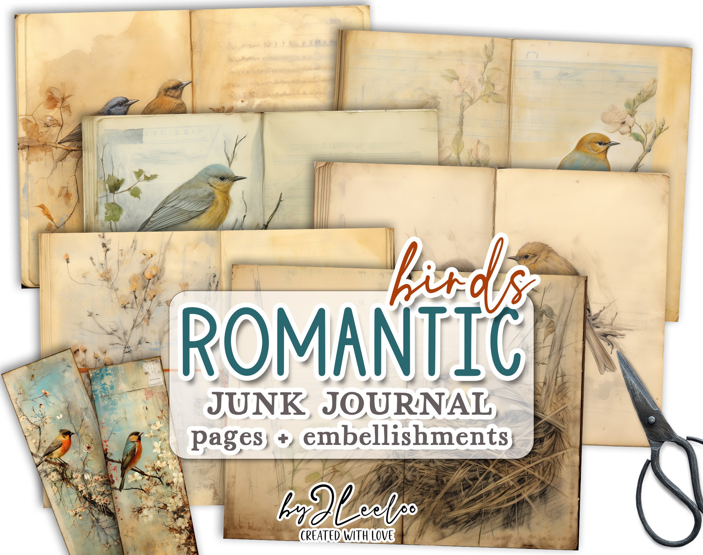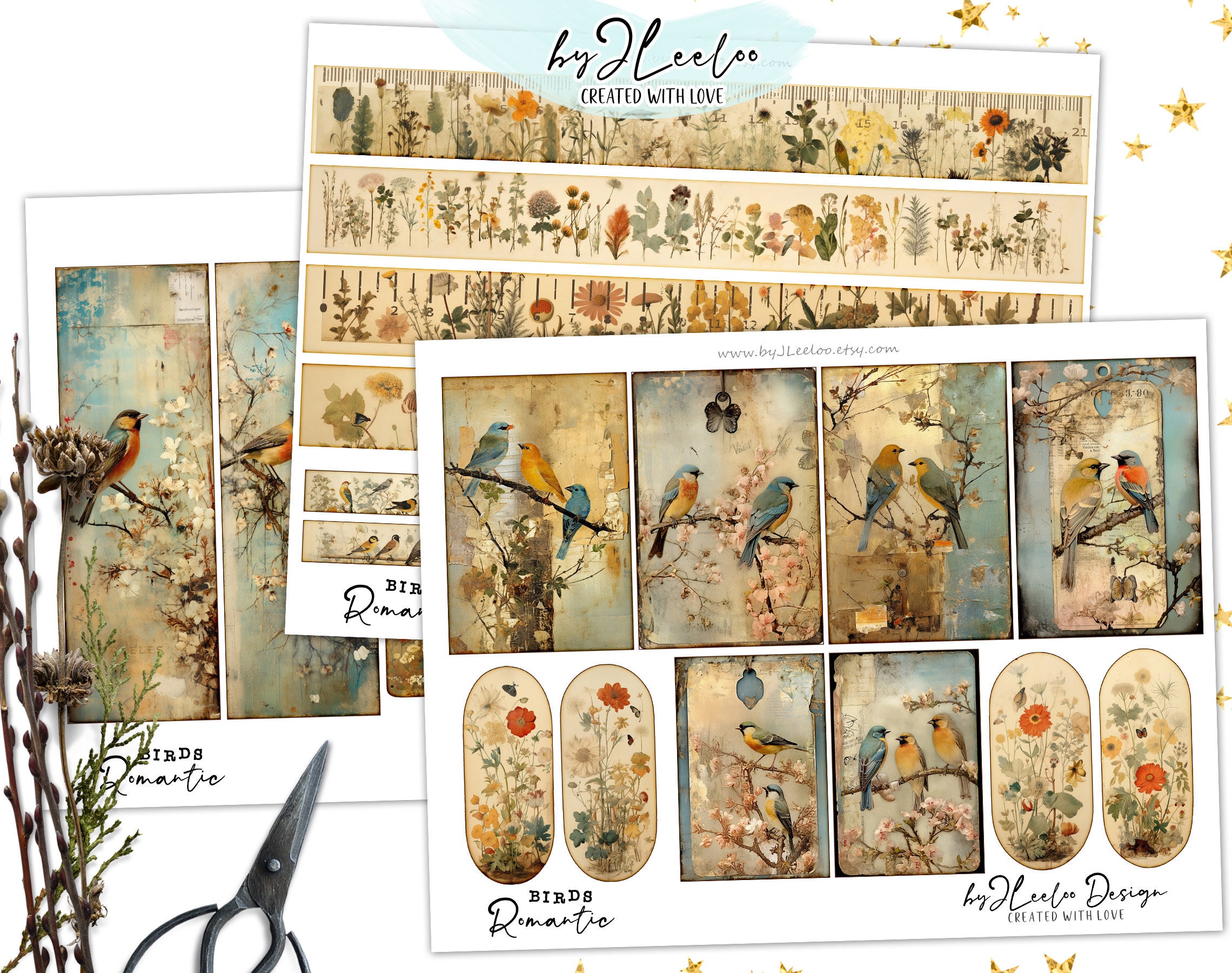 ROMANTIC BIRDS junk journal printable | half pages tag Mixed Media supplies | Birds hand-drawn vintage card making collage art diary | pp681