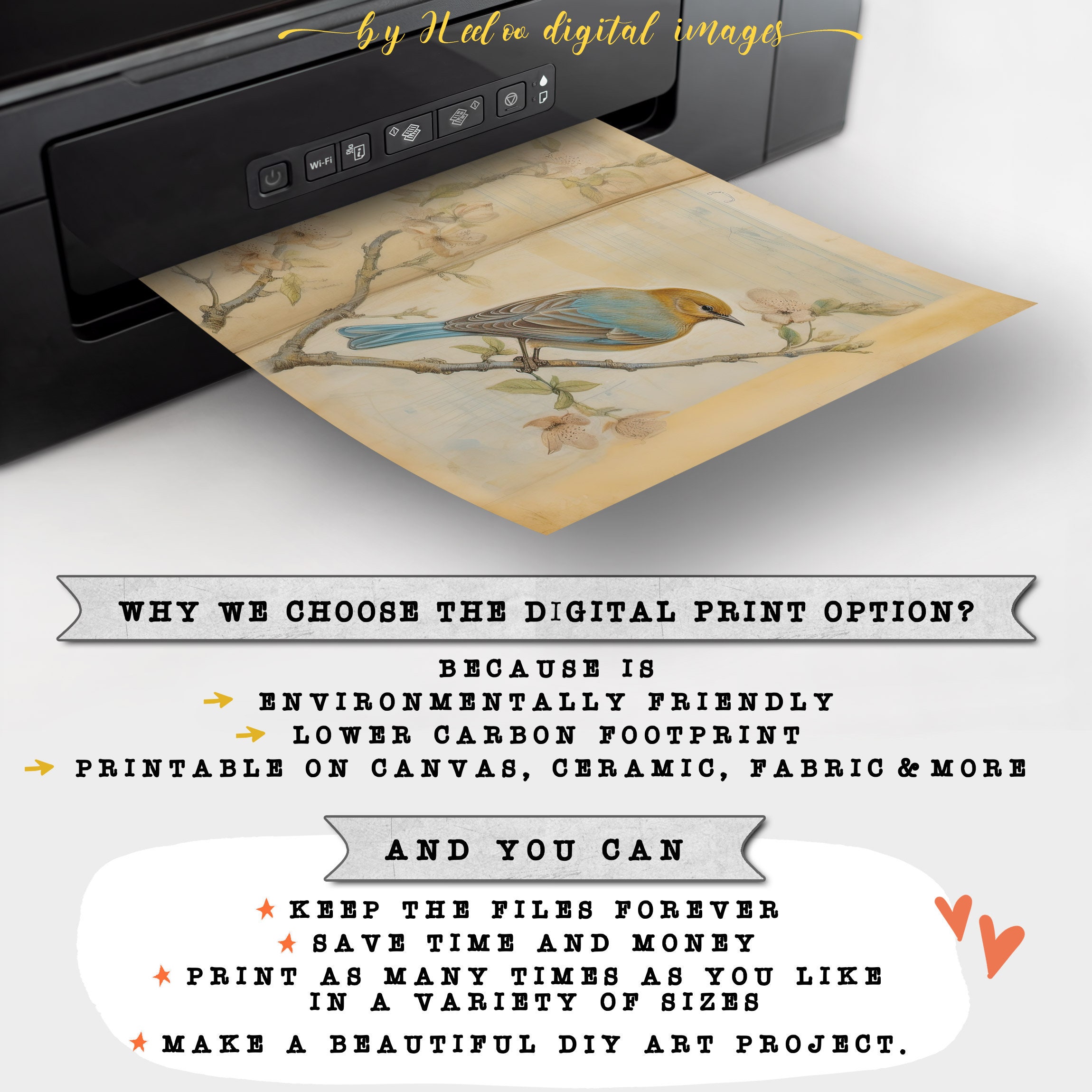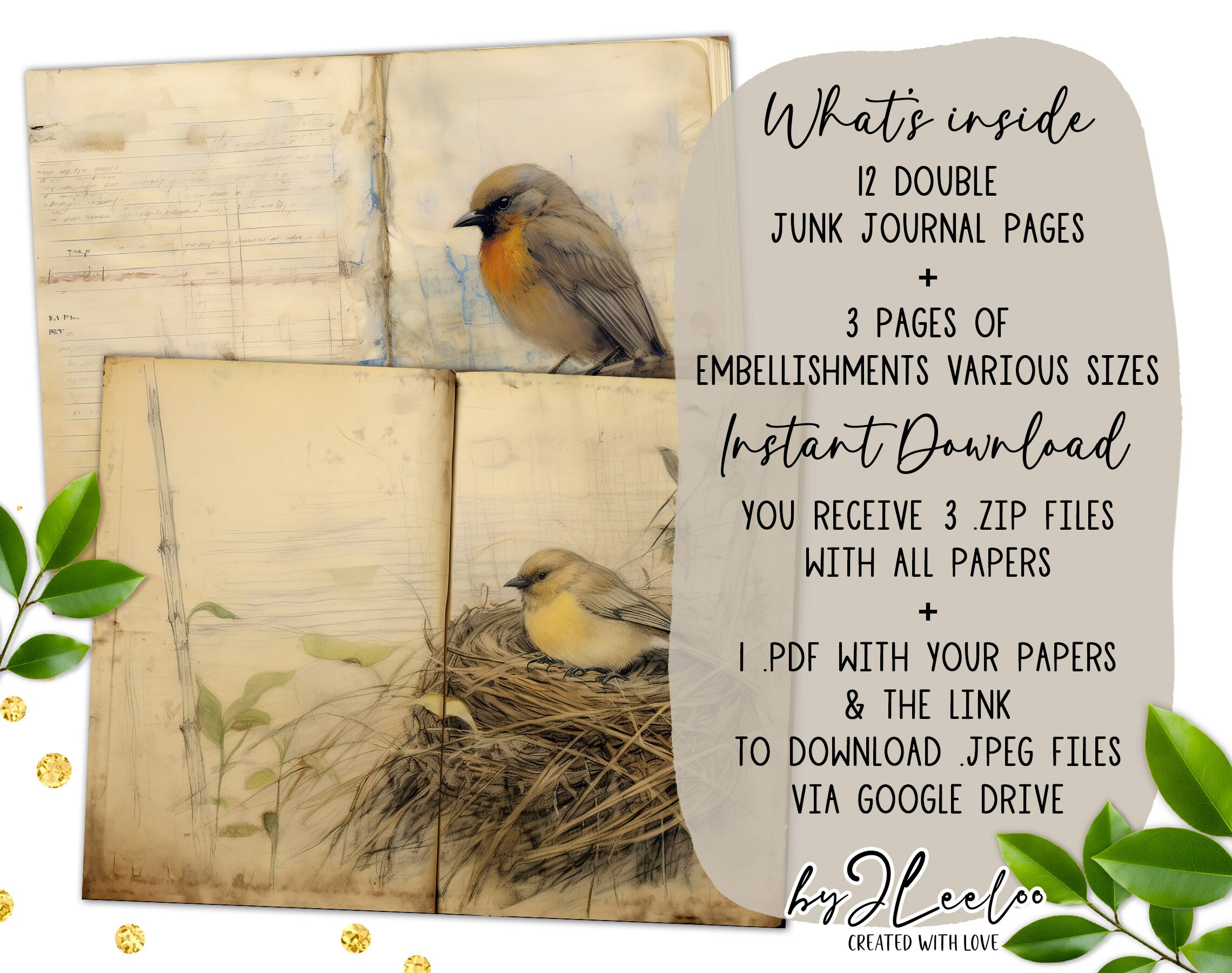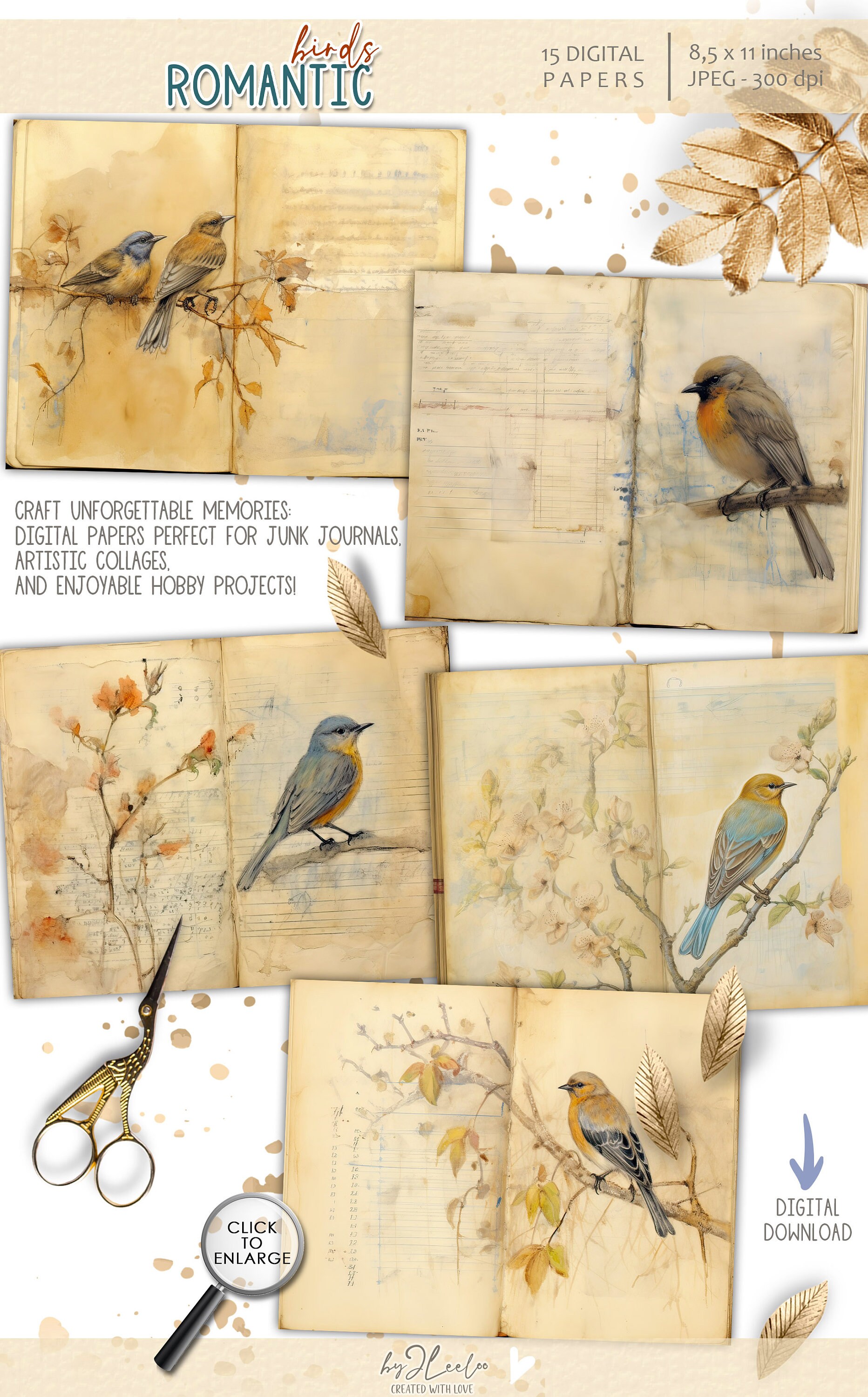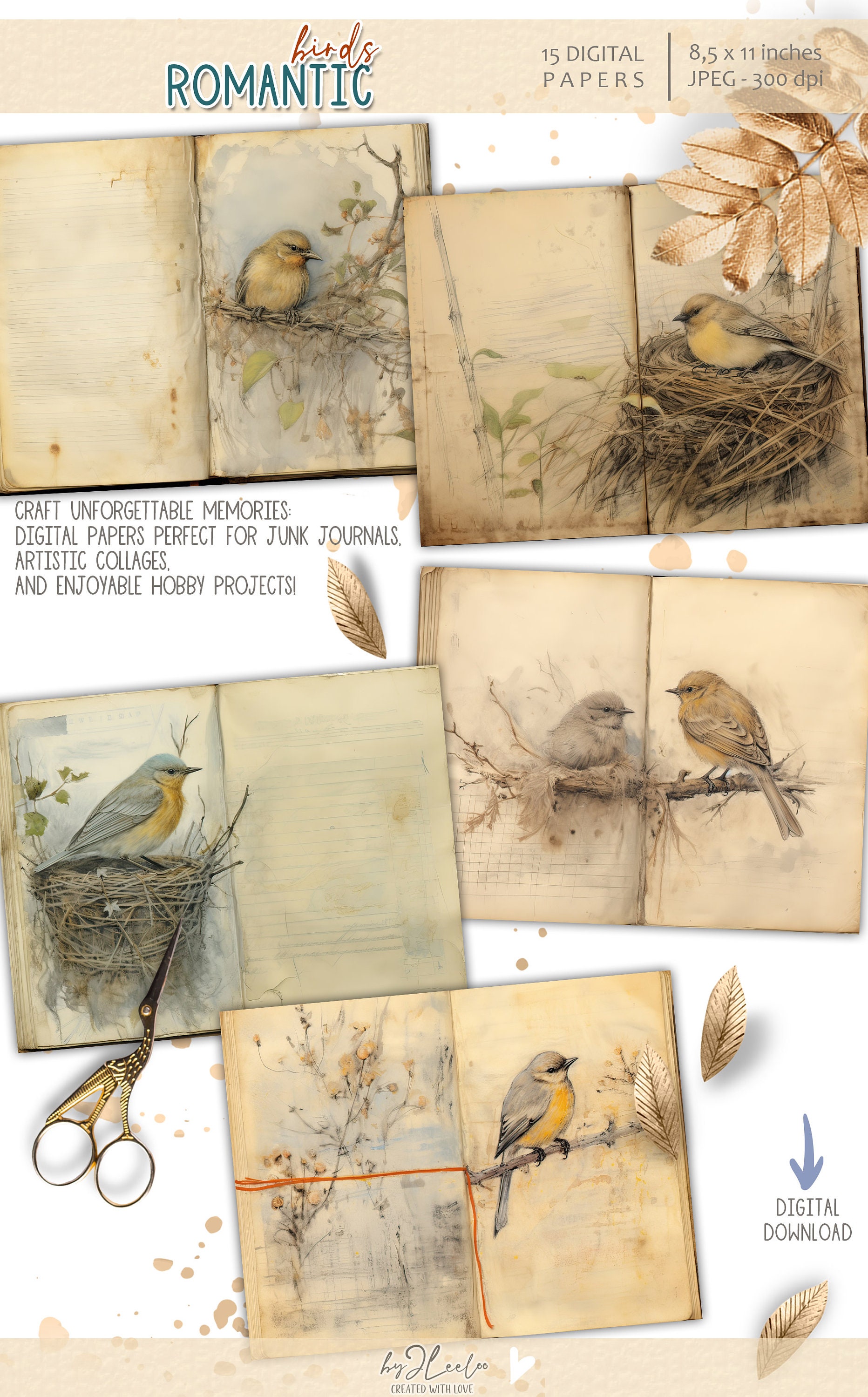 ROMANTIC BIRDS junk journal printable | half pages tag Mixed Media supplies | Birds hand-drawn vintage card making collage art diary | pp681