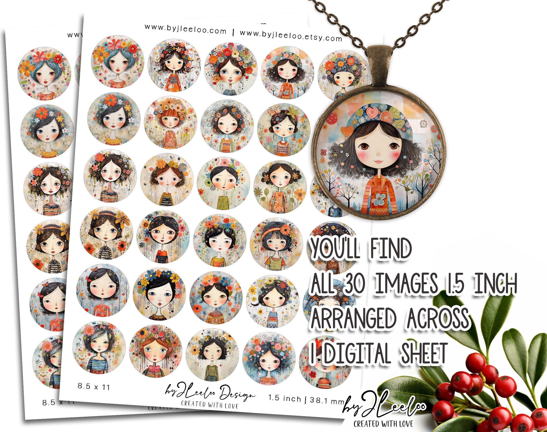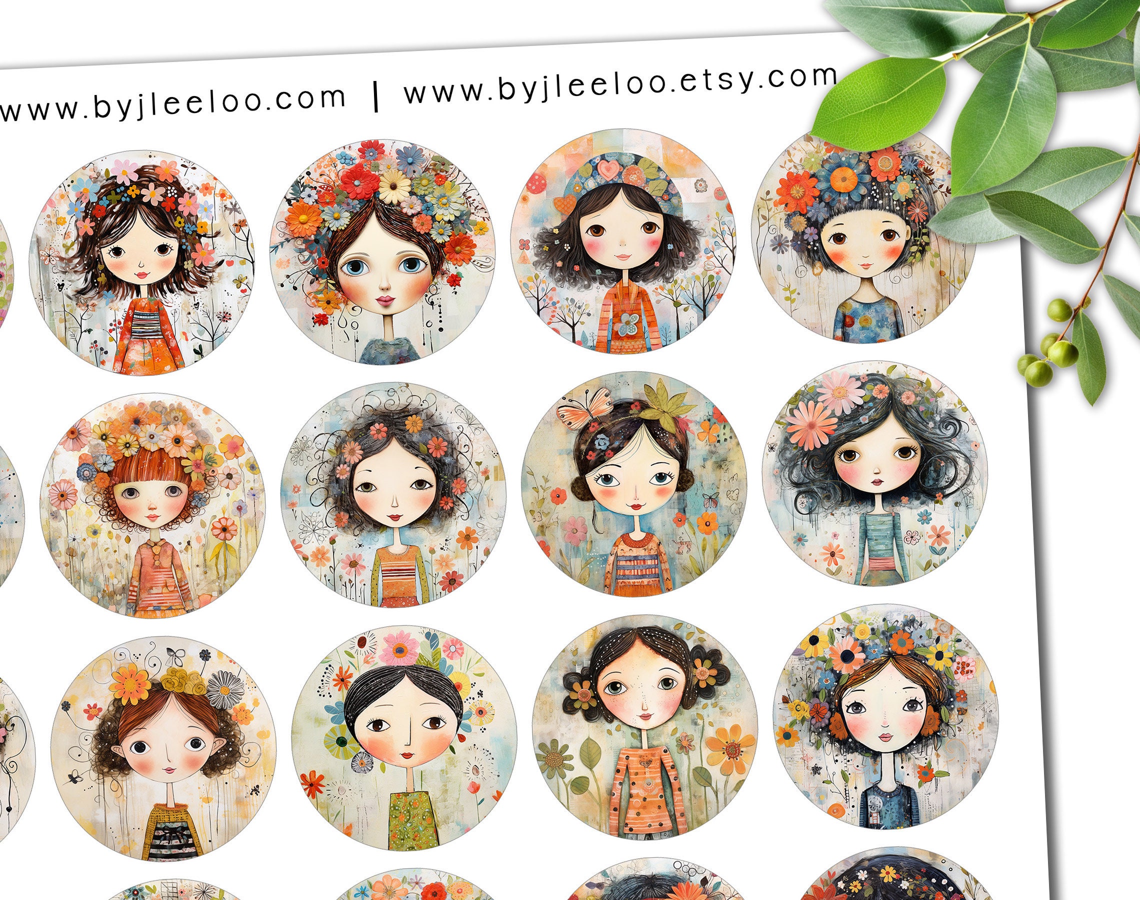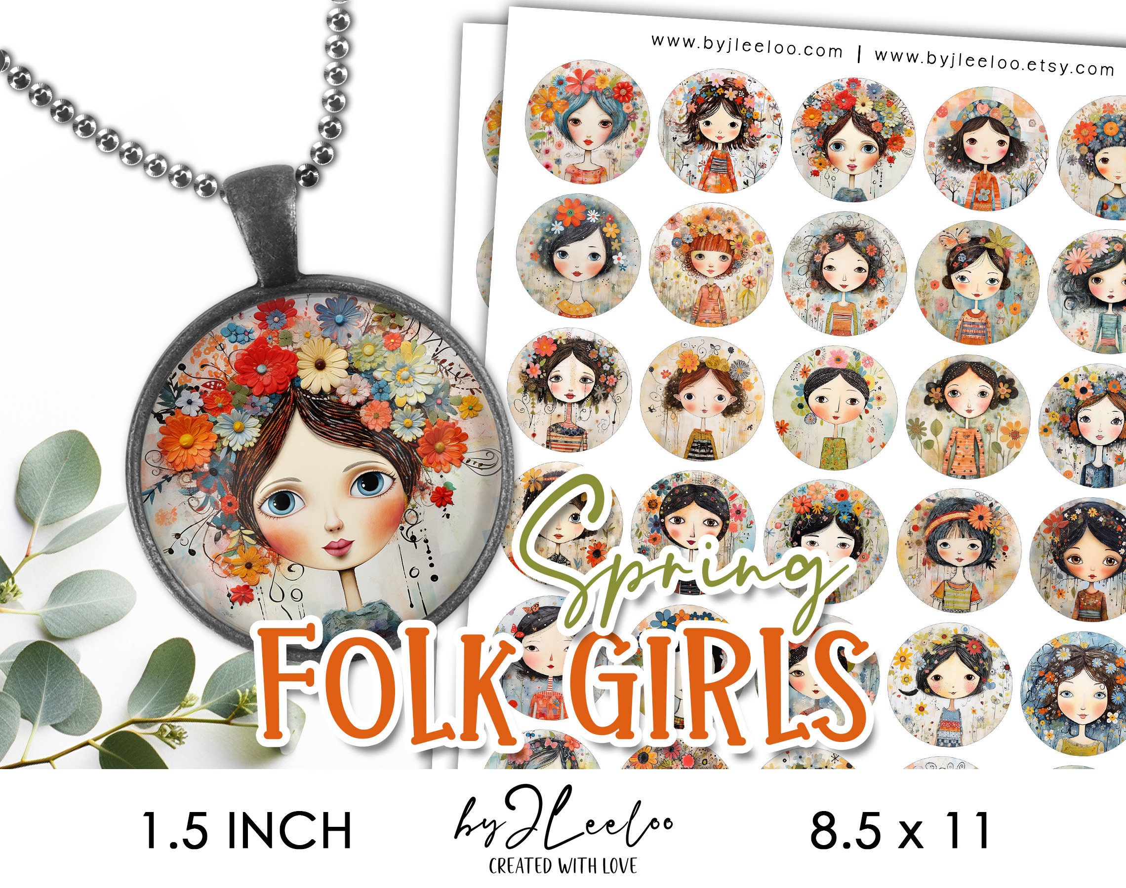 SPRING FOLK girls 1.5 inch printable illustration | digital supplies round pendant bezel trays glass cabochon mounting cameo setting | tn717