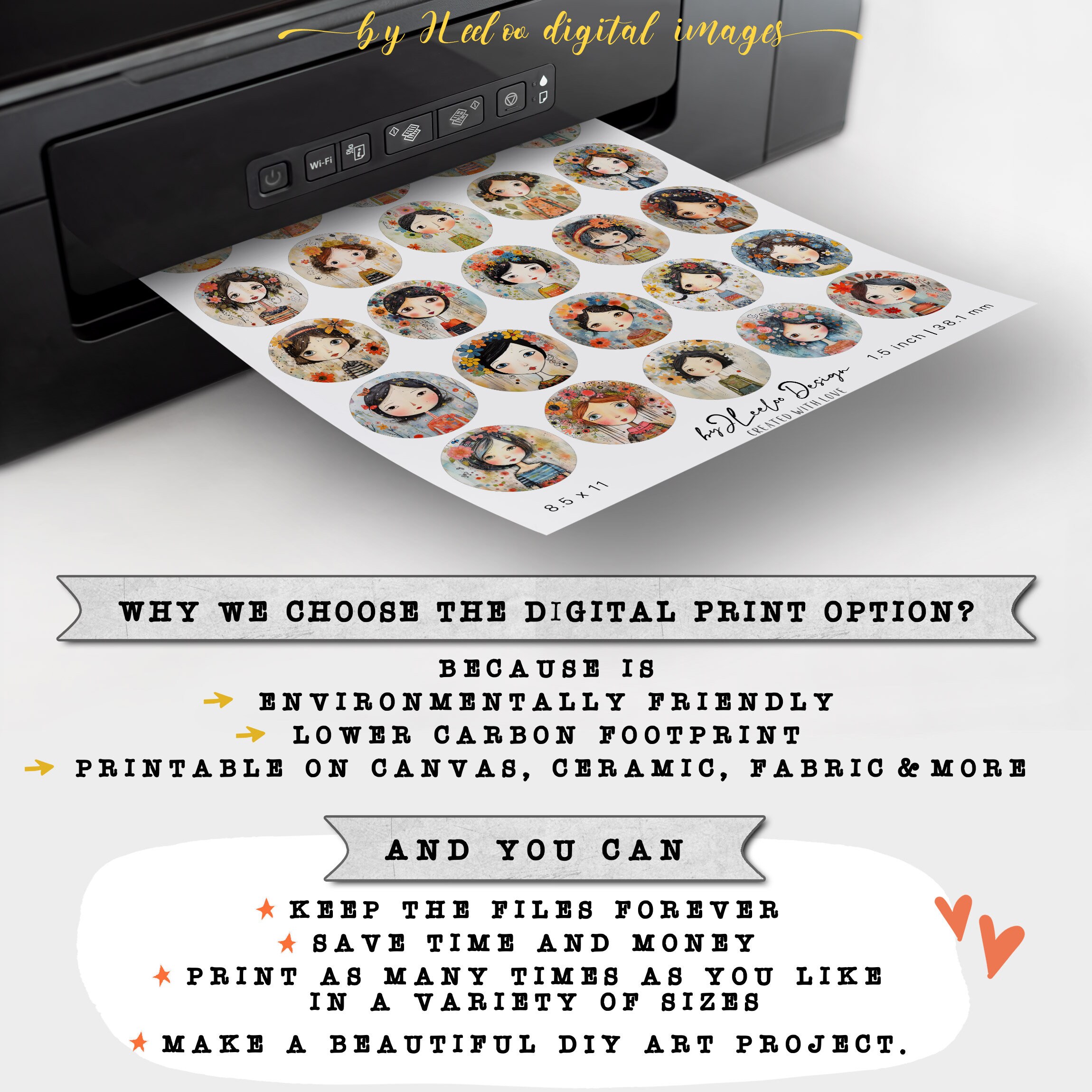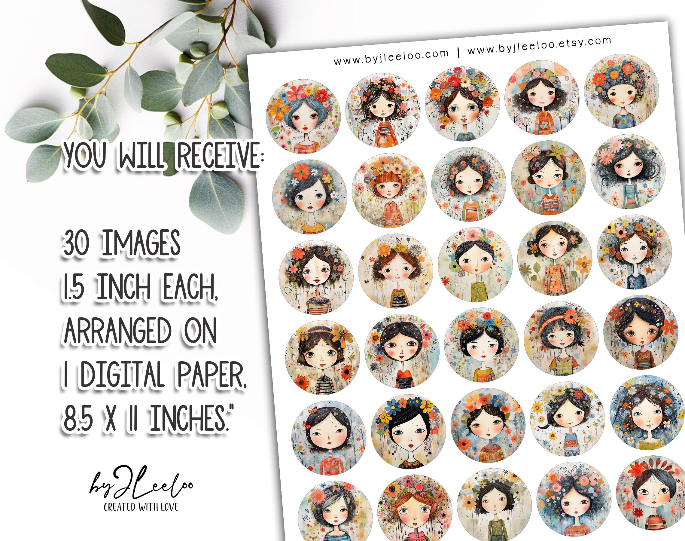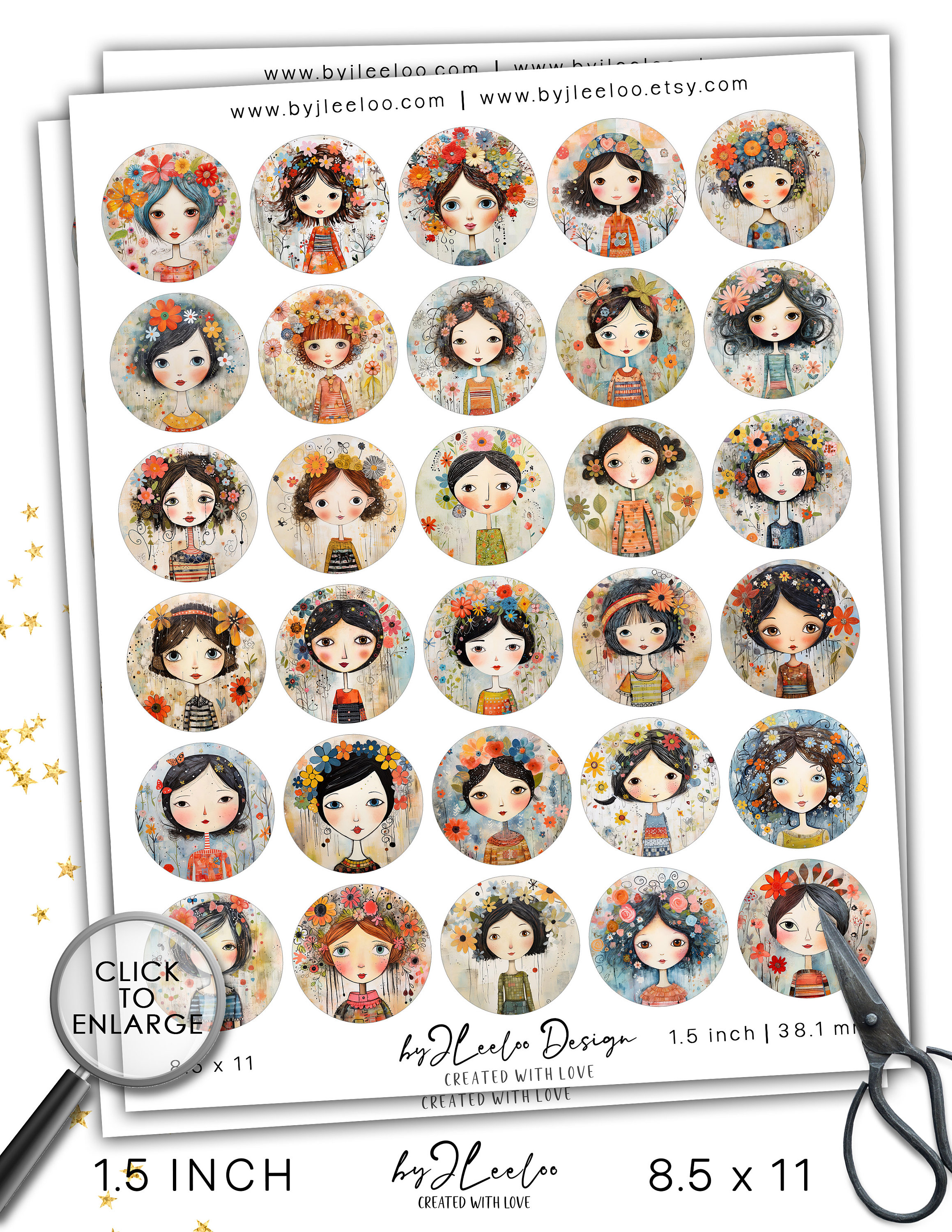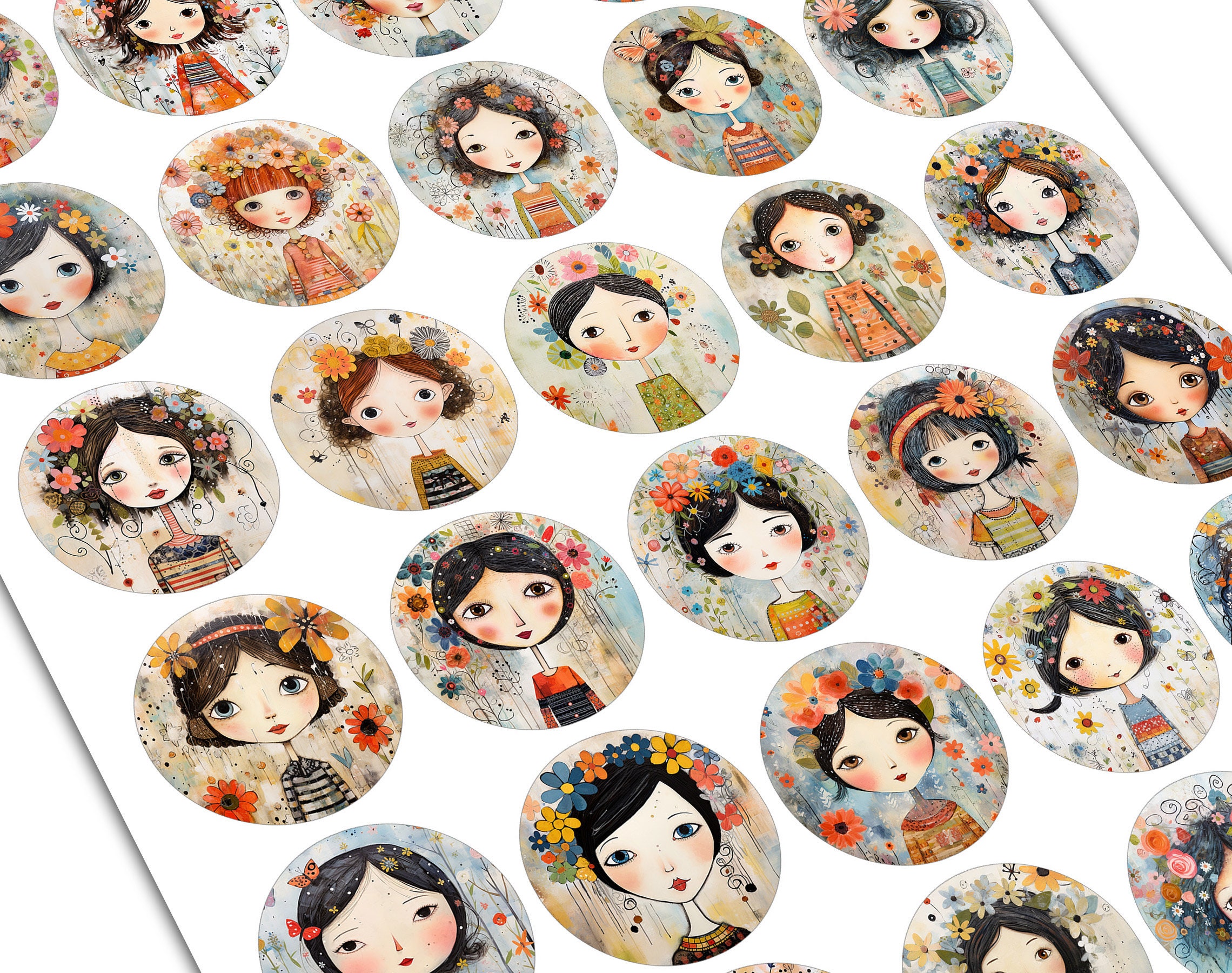 SPRING FOLK girls 1.5 inch printable illustration | digital supplies round pendant bezel trays glass cabochon mounting cameo setting | tn717
