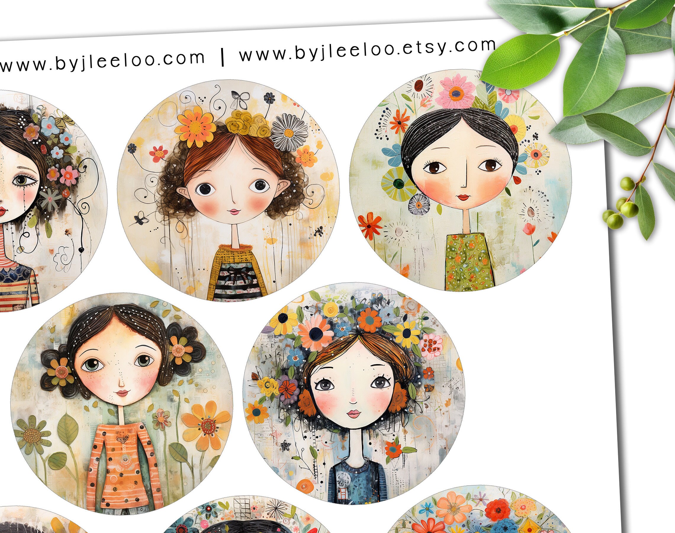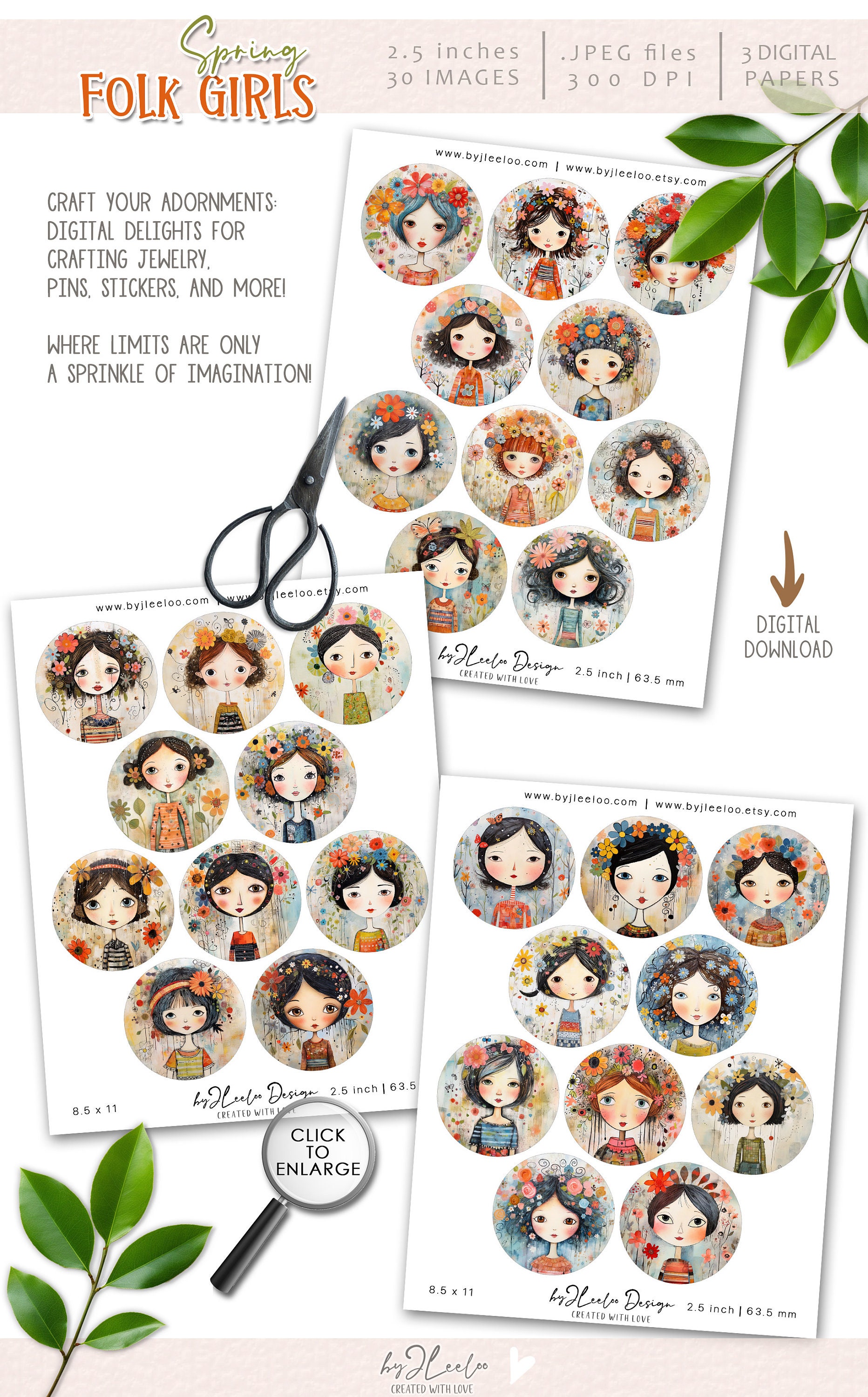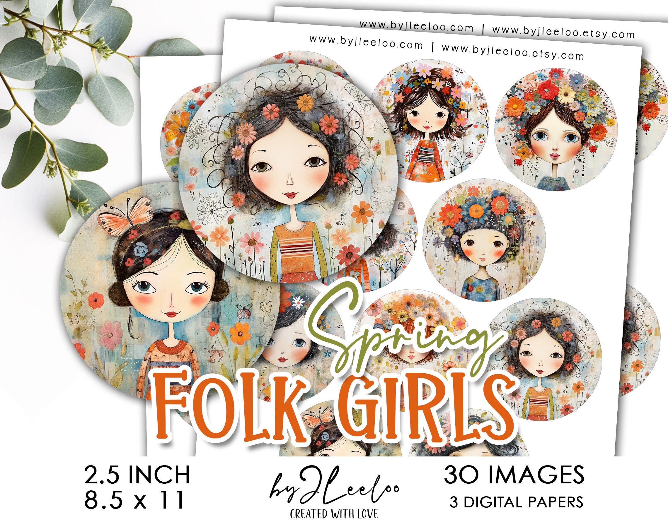 SPRING FOLK girls 2.5 inch printable craft supplies round pendant | Magnets bezel trays glass cabochon mountings cameo bottle caps | tn719