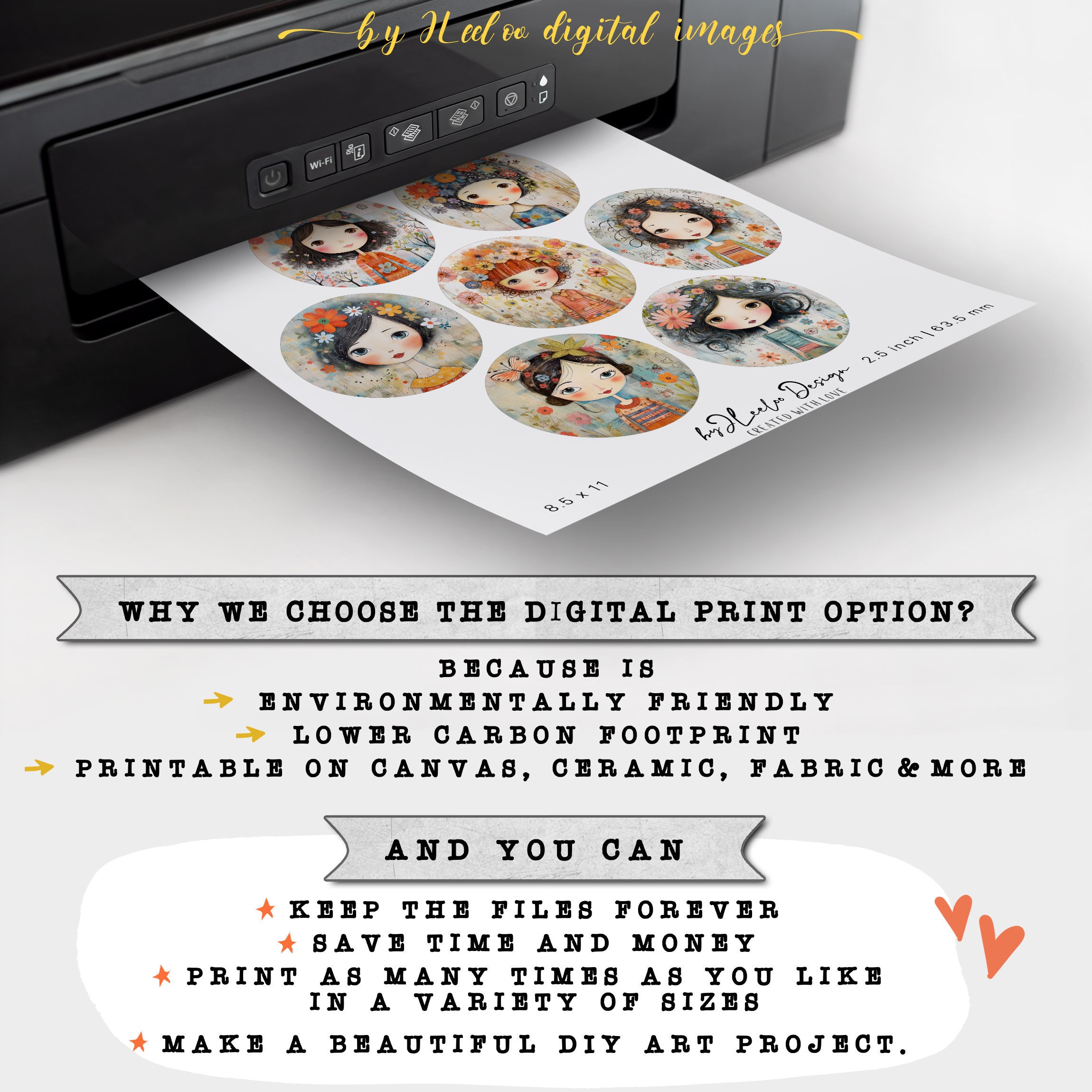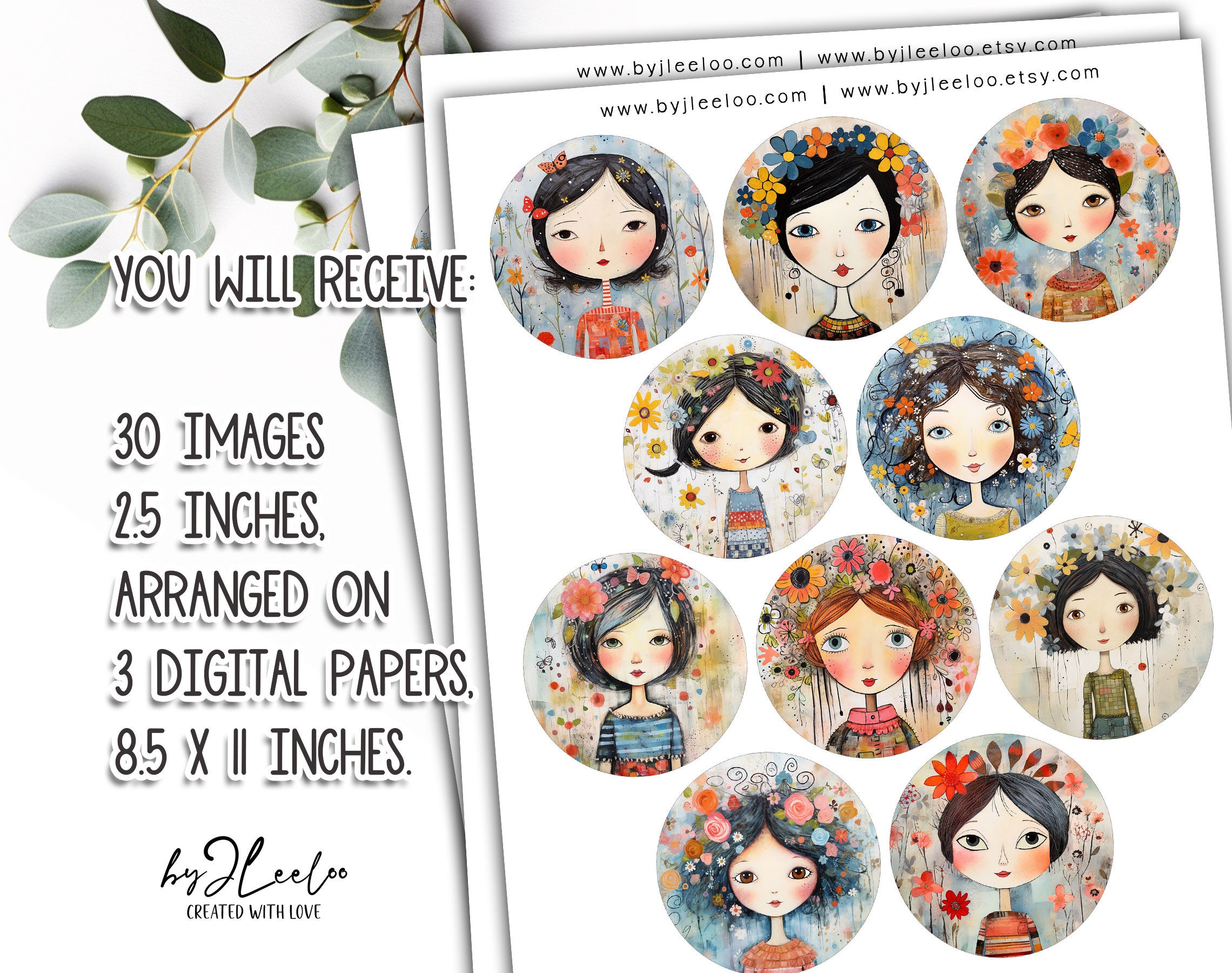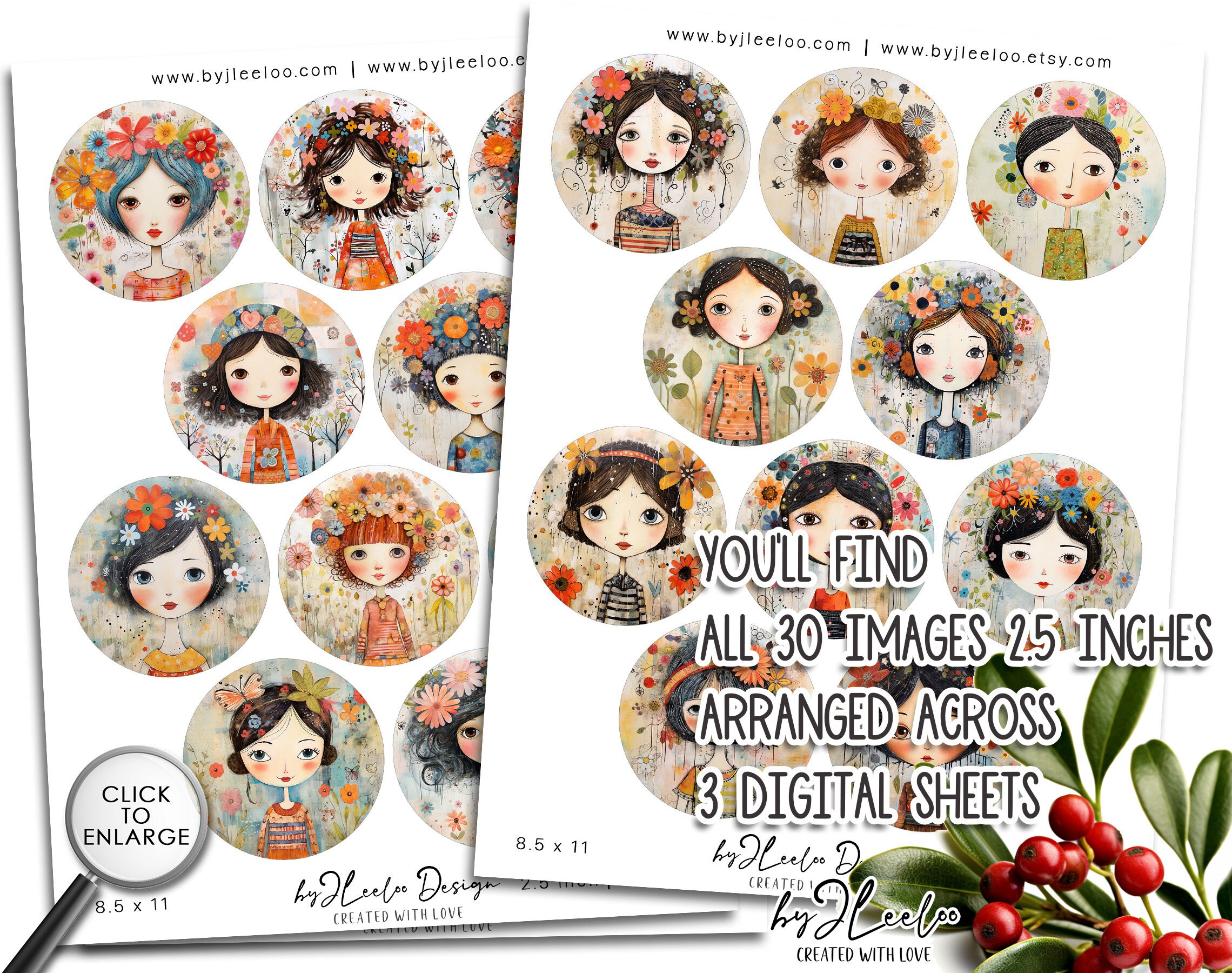 SPRING FOLK girls 2.5 inch printable craft supplies round pendant | Magnets bezel trays glass cabochon mountings cameo bottle caps | tn719