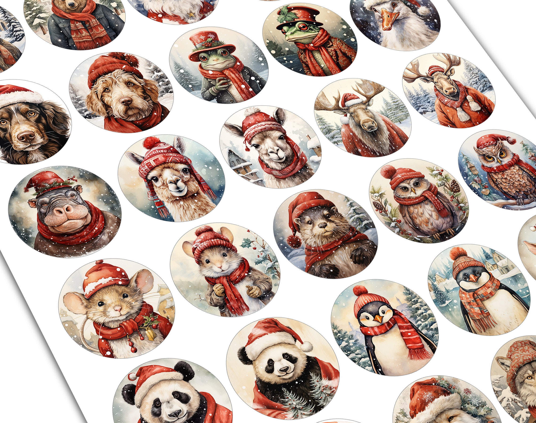 Charming Holiday Treasures: Round illustrations showcasing delightful animals adorned in red Santa Claus hats and scarves, set in a Christmas snowscape radiating a festive atmosphere reminiscent the cottagepunk!