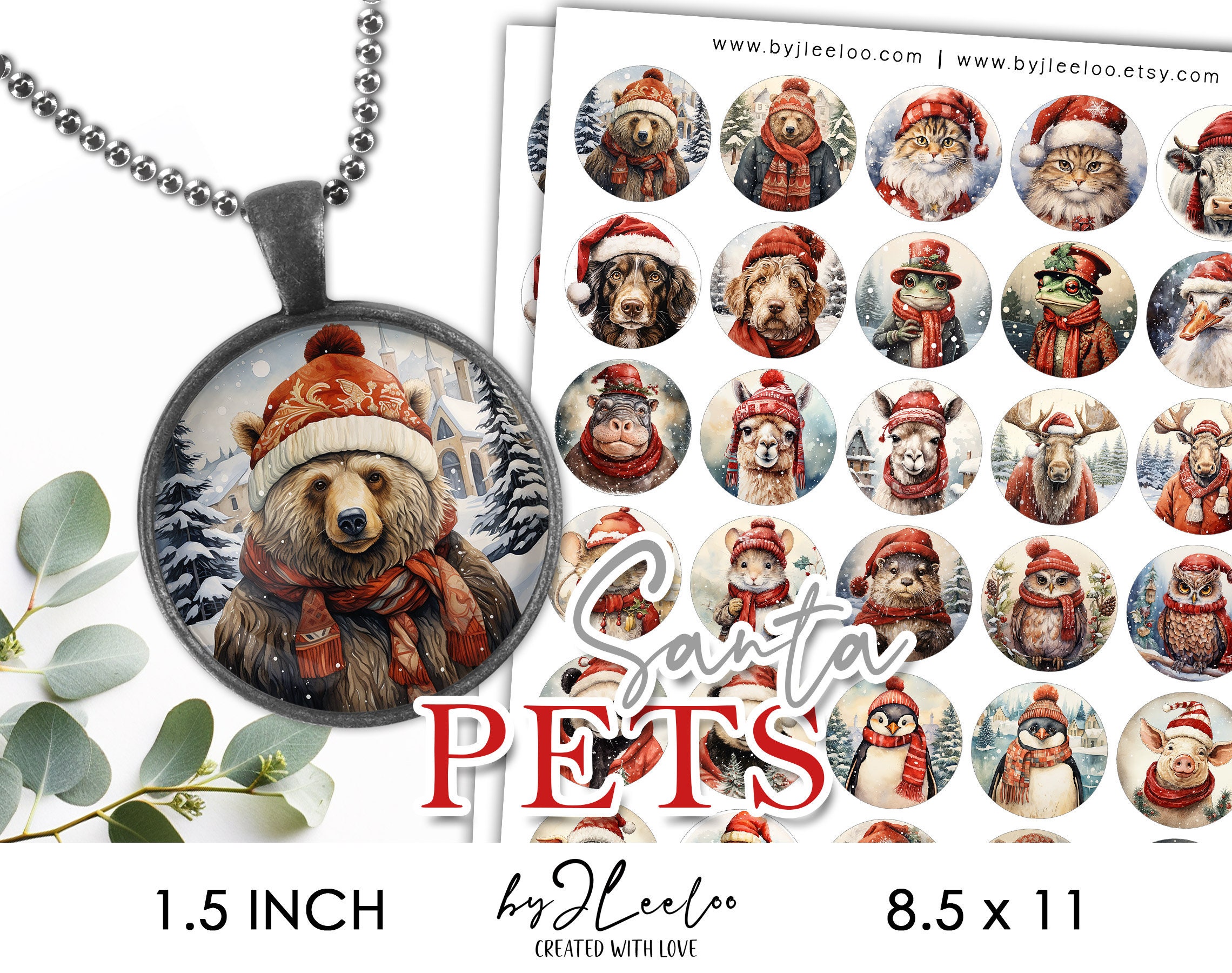SANTA PETS 1.5 inch printable Christmas holidays | supplies round pendants, bezel trays, glass cabochon mountings, cameo settings | tn681