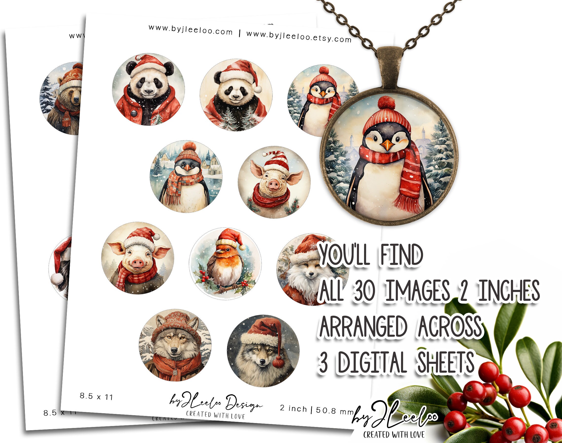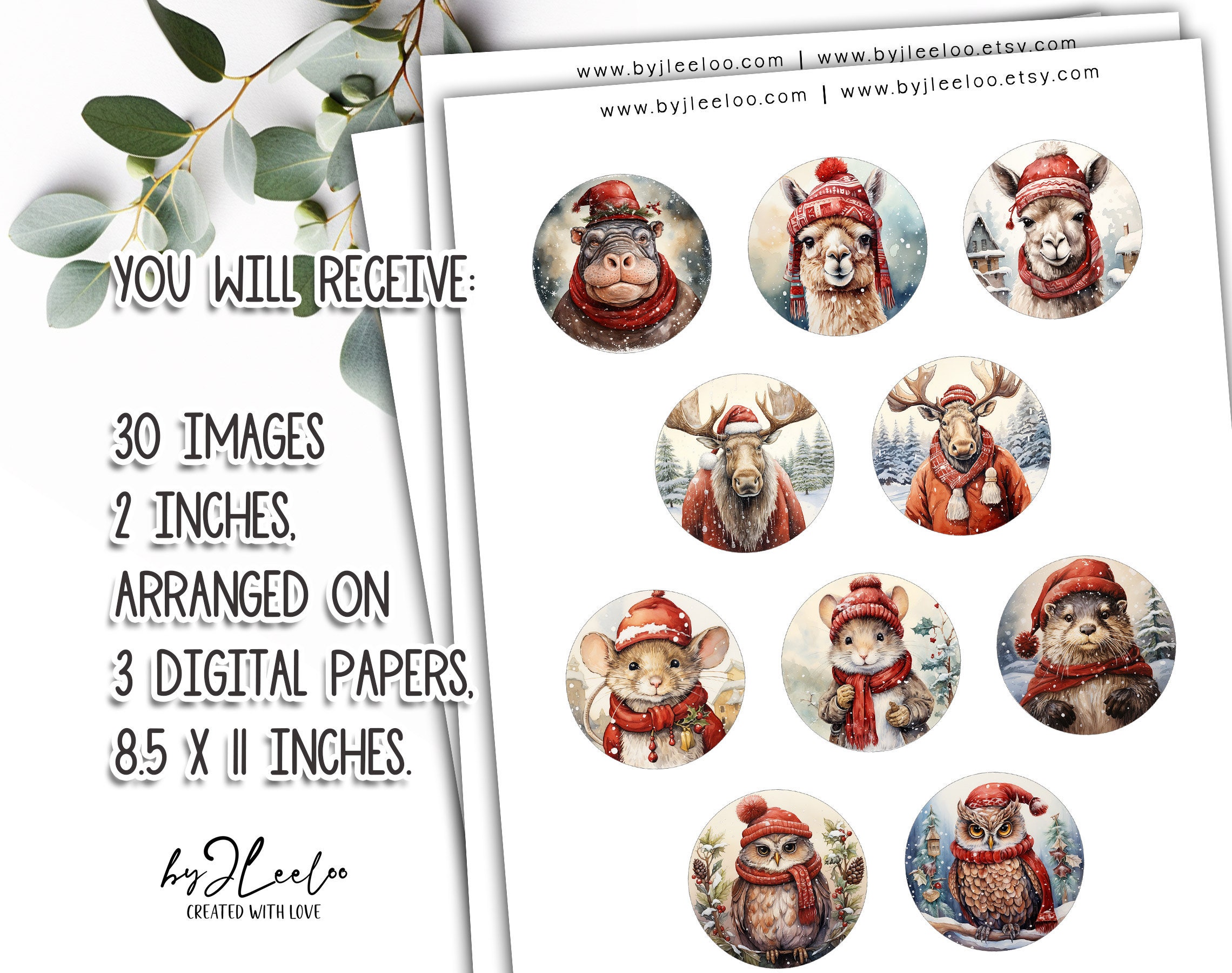 Charming Holiday Treasures: Round illustrations showcasing delightful animals adorned in red Santa Claus hats and scarves, set in a Christmas snowscape radiating a festive atmosphere reminiscent the cottagepunk!