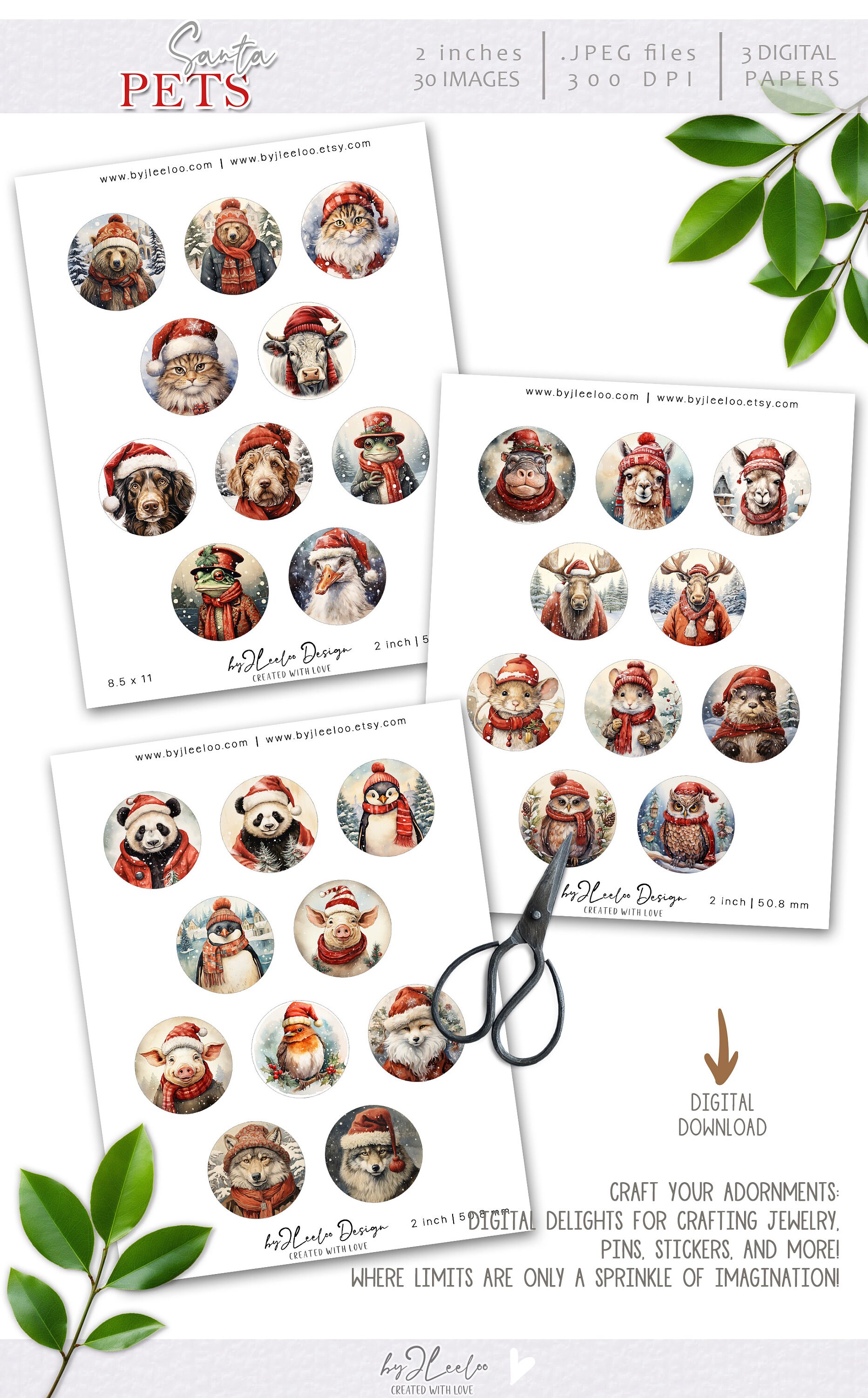 SANTA PETS 2 inch printable Christmas holidays | supplies round pendants, bezel trays, glass cabochon mountings, cameo settings | tn682