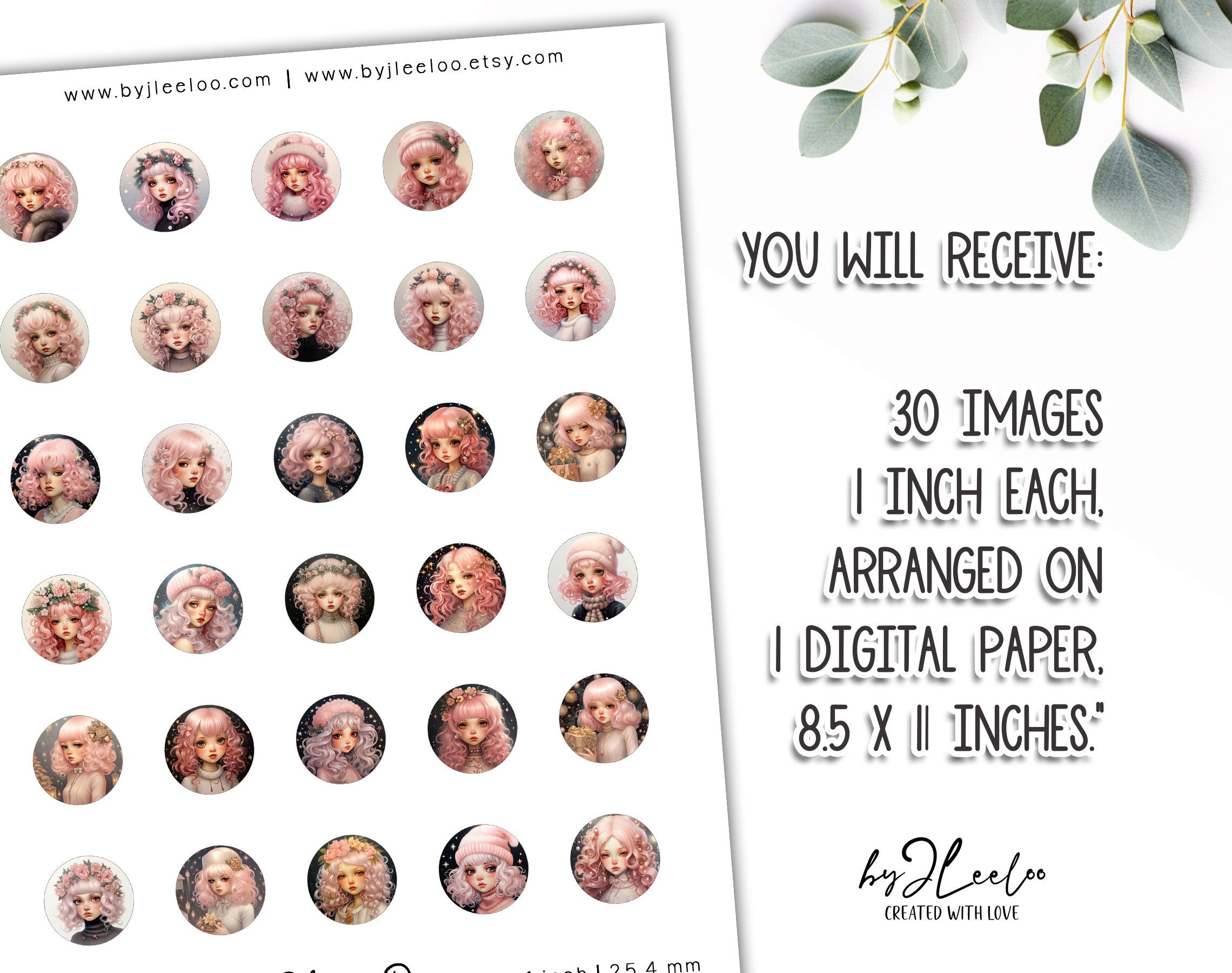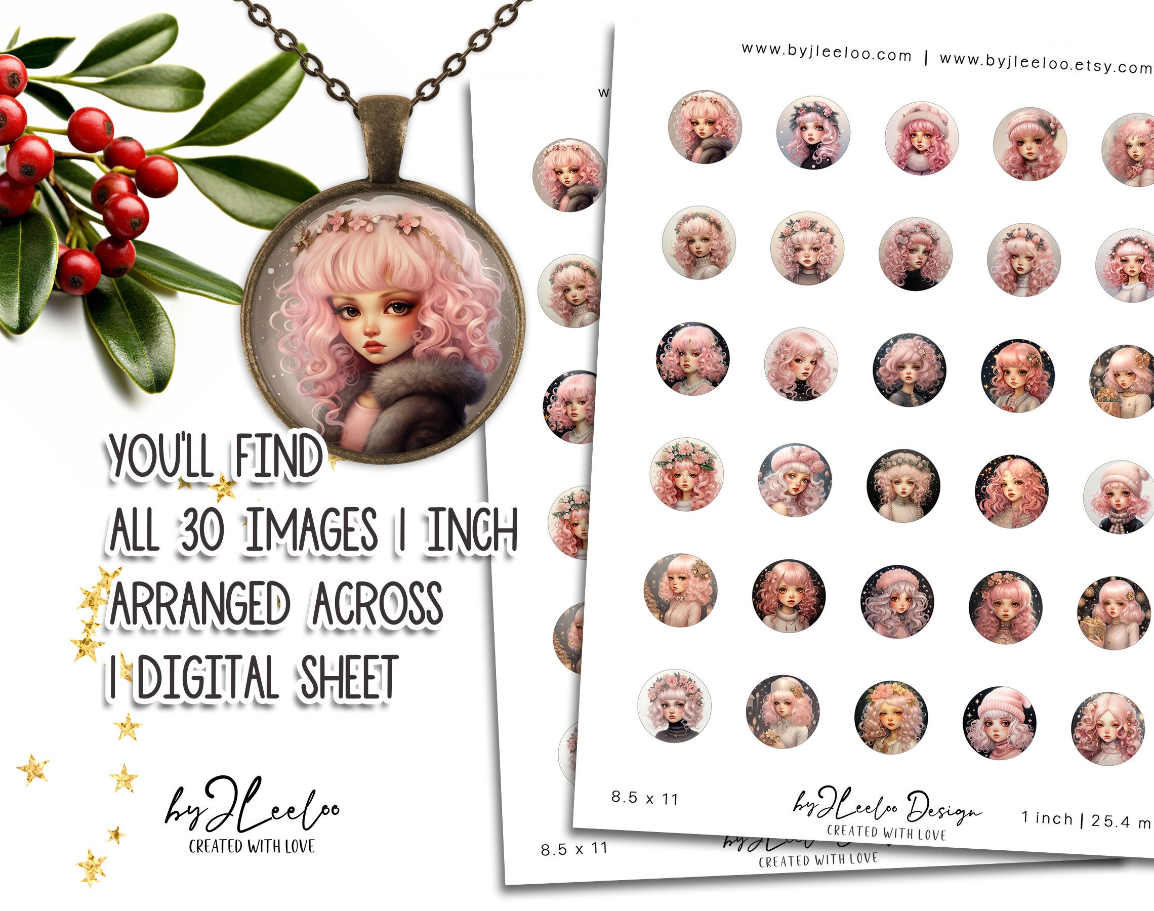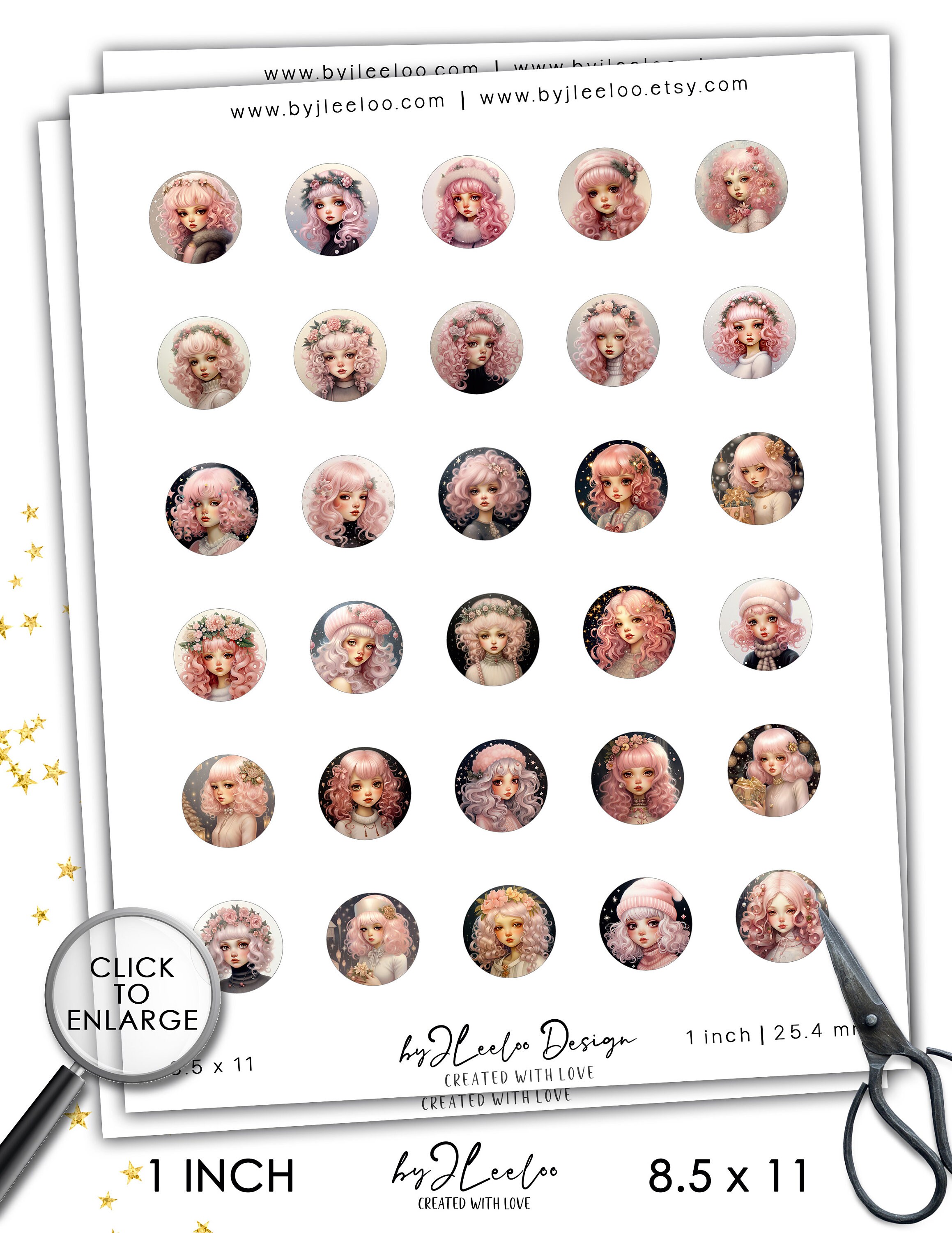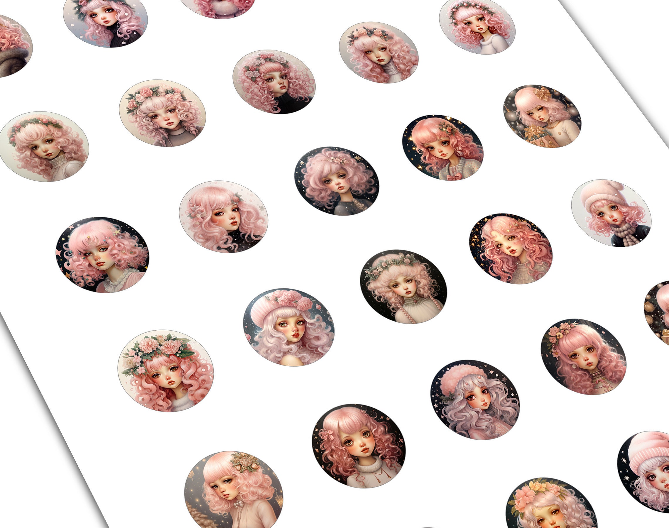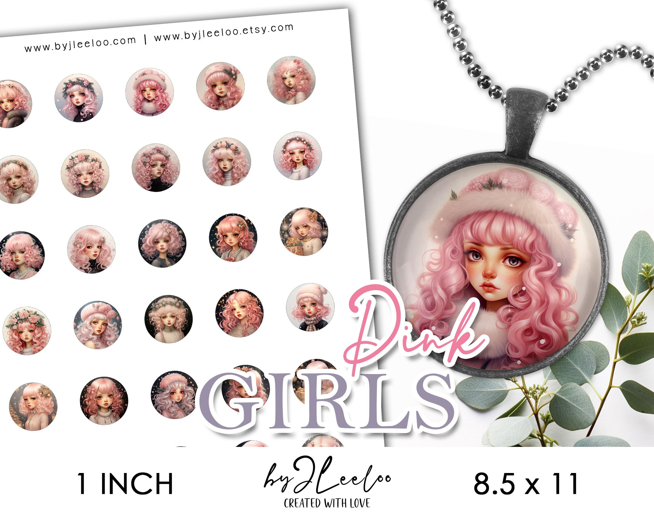 PINK GIRLS 1 inch printable cute illustration | supplies round pendants, bezel trays, glass cabochon mountings, cameo settings | tn686