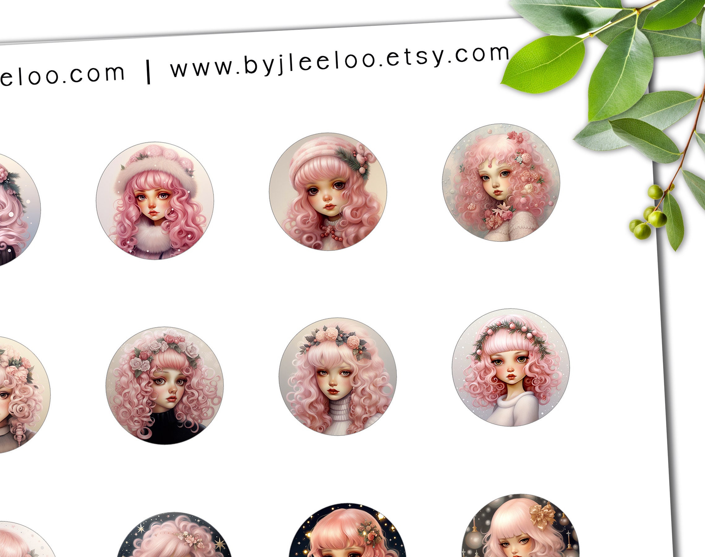 In a round sticker format, explore delightful illustrations featuring girls with pink hair, stars, and a festive Christmas theme. These charming holiday treasures showcase the Christmas spirit, with the girls donning seasonal attire and surrounded by a winter wonderland. The pastel pink hues create a whimsical atmosphere, reminiscent of cheerful and festive vibes!
