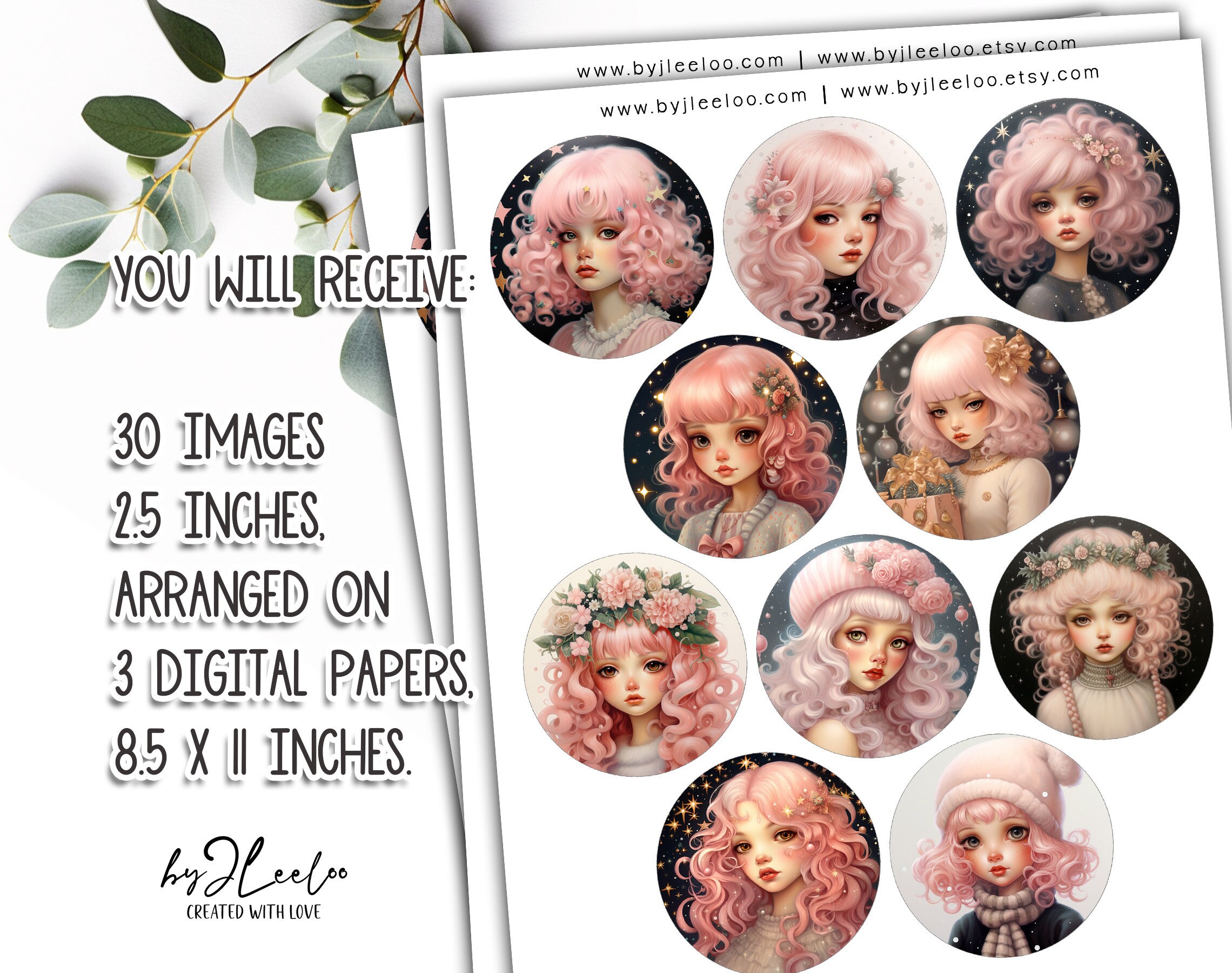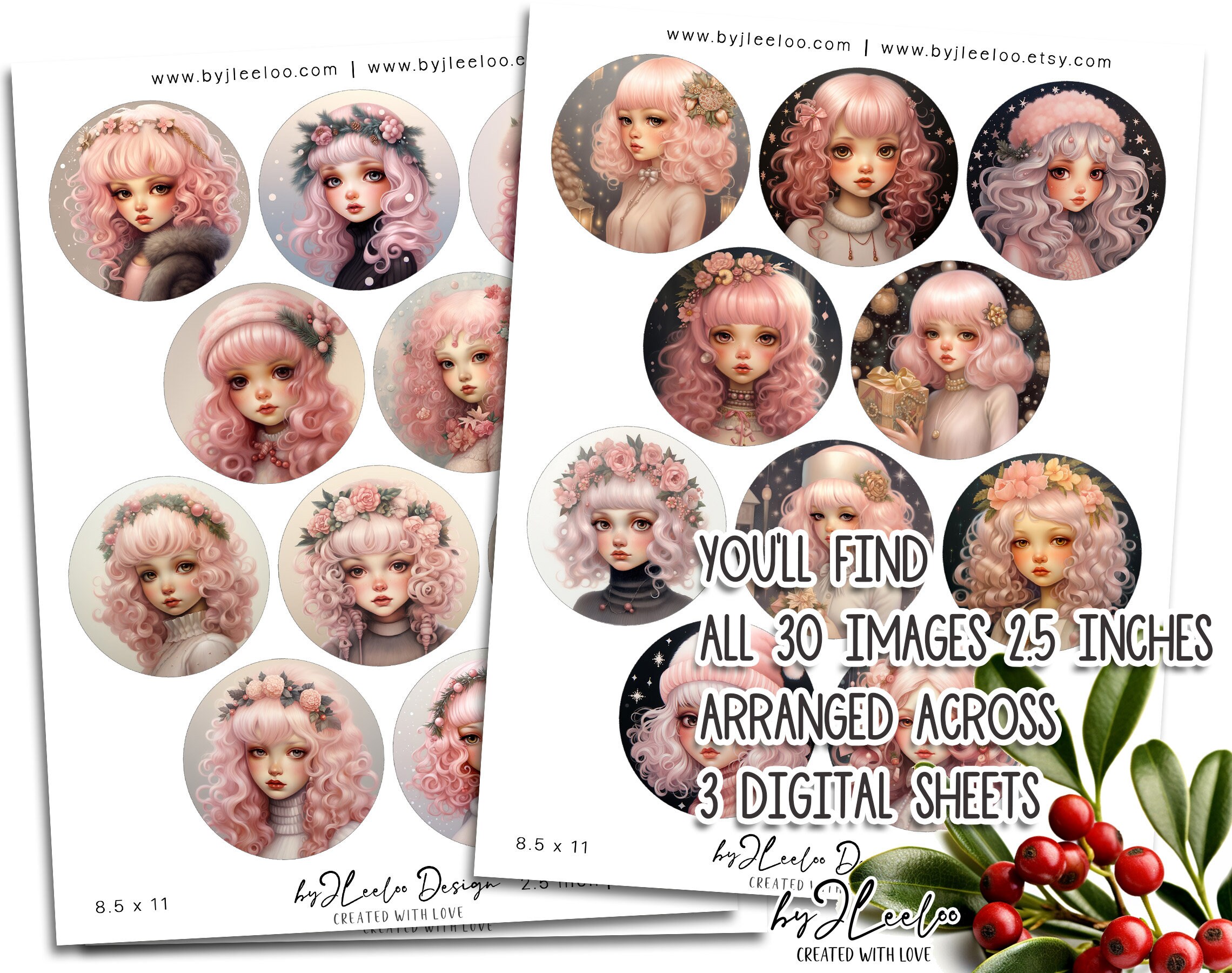◾ 30 enchanting circular illustrations featuring delightful girls with pink hair, stars, and festive Christmas details, perfect for your holiday creations!