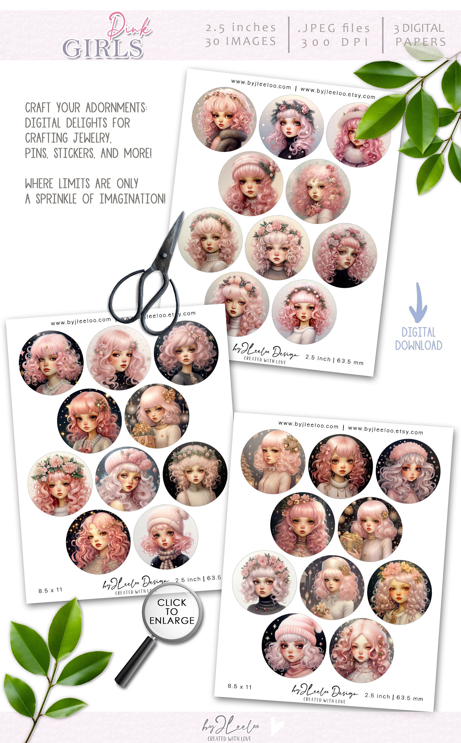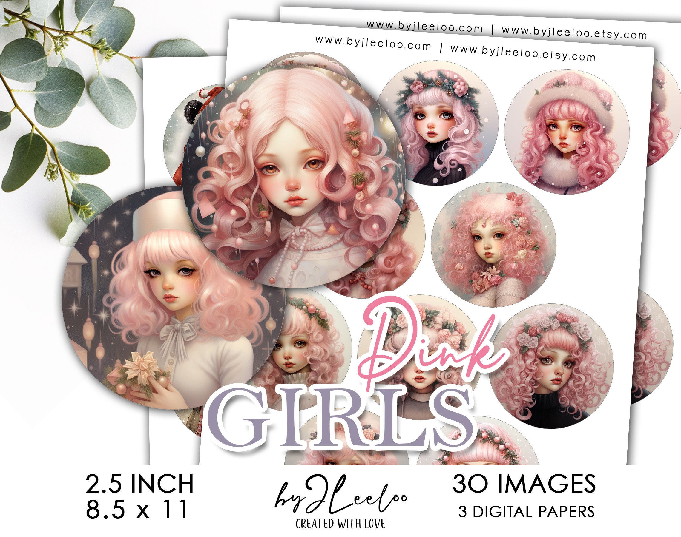 PINK GIRLS 2.5 inch printable cute illustration | supplies round pendants, bezel trays, glass cabochon mountings, cameo settings | tn689