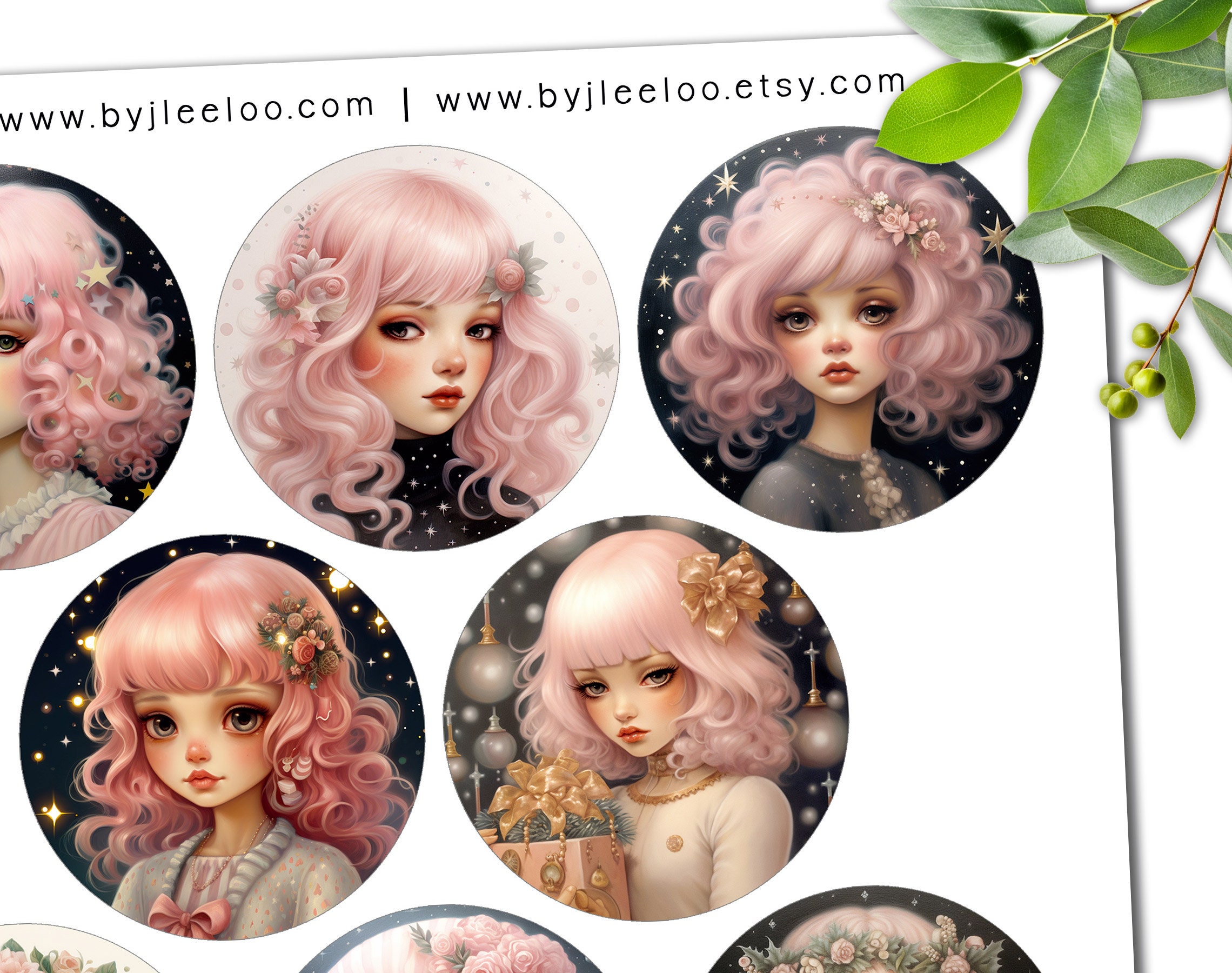 In a round sticker format, explore delightful illustrations featuring girls with pink hair, stars, and a festive Christmas theme. These charming holiday treasures showcase the Christmas spirit, with the girls donning seasonal attire and surrounded by a winter wonderland. The pastel pink hues create a whimsical atmosphere, reminiscent of cheerful and festive vibes!