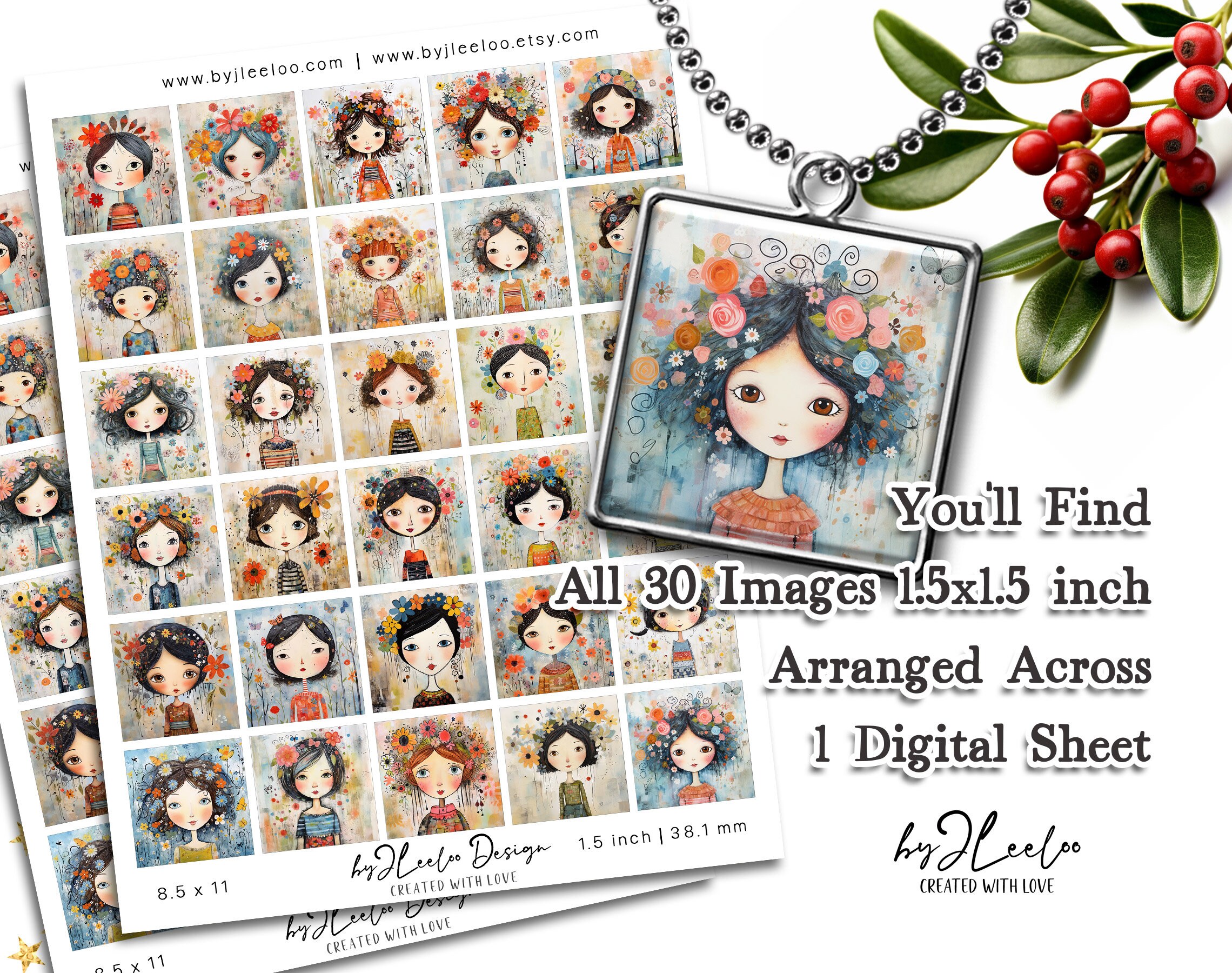 SPRING FOLK girls 1.5 inch printable illustration | digital supplies square pendant bezel trays glass cabochon mounting cameo | qu557