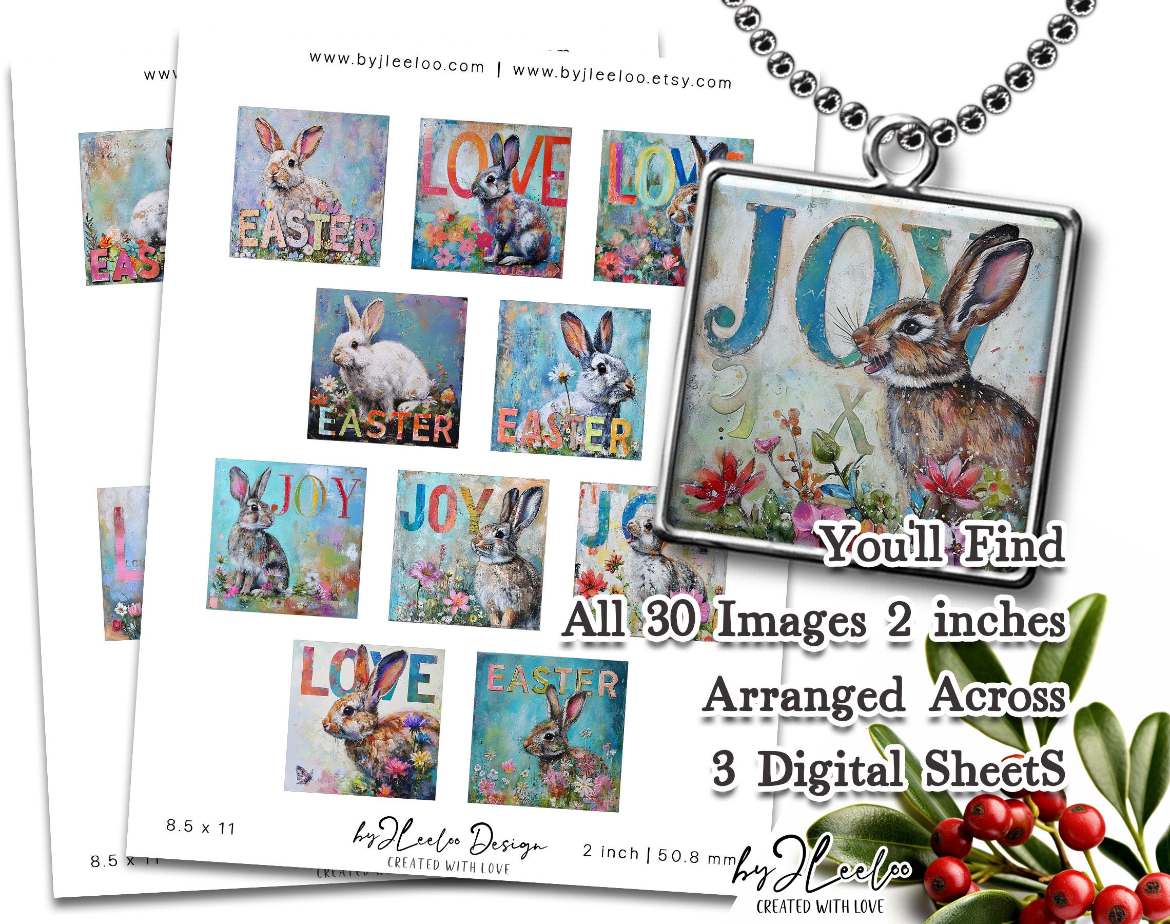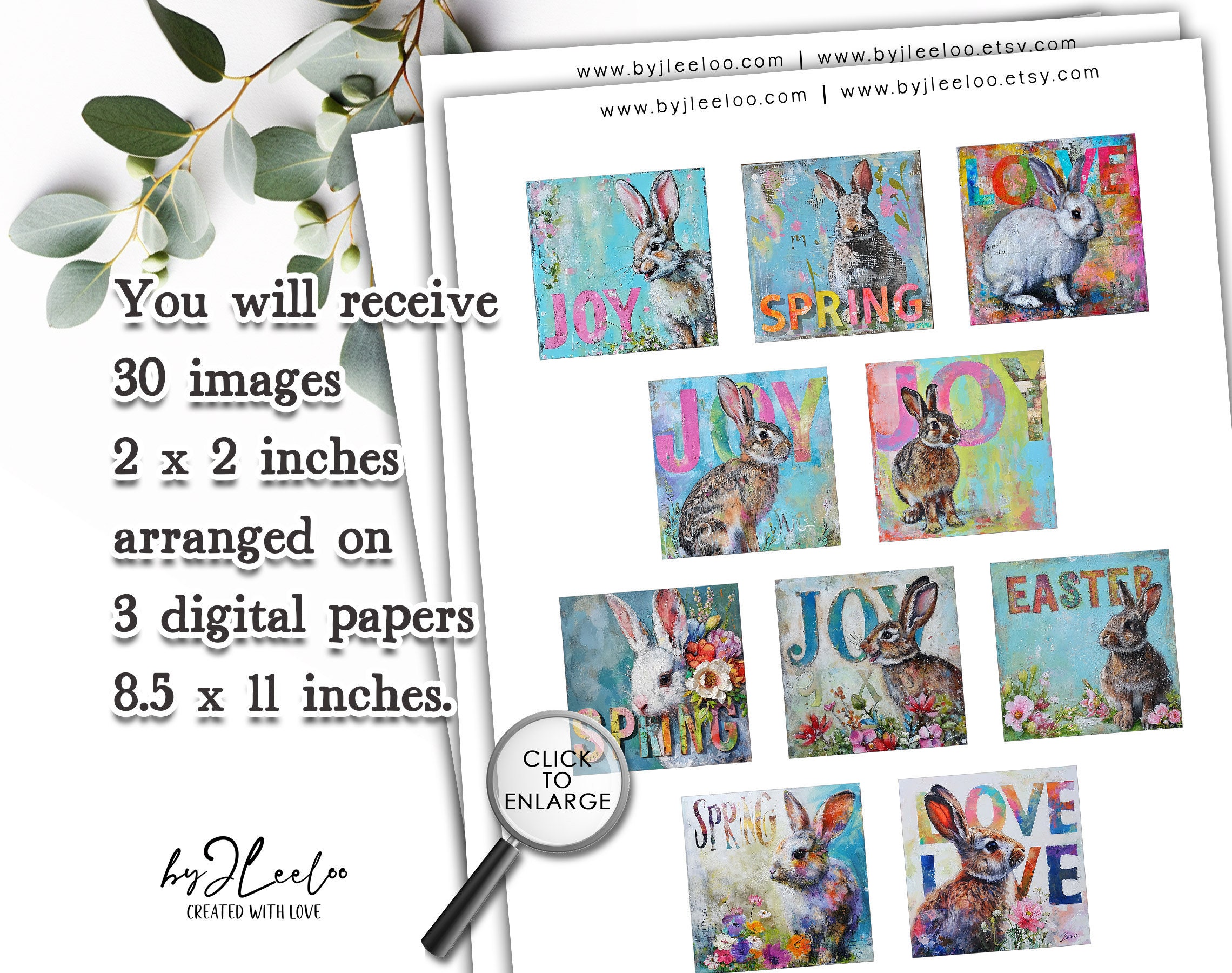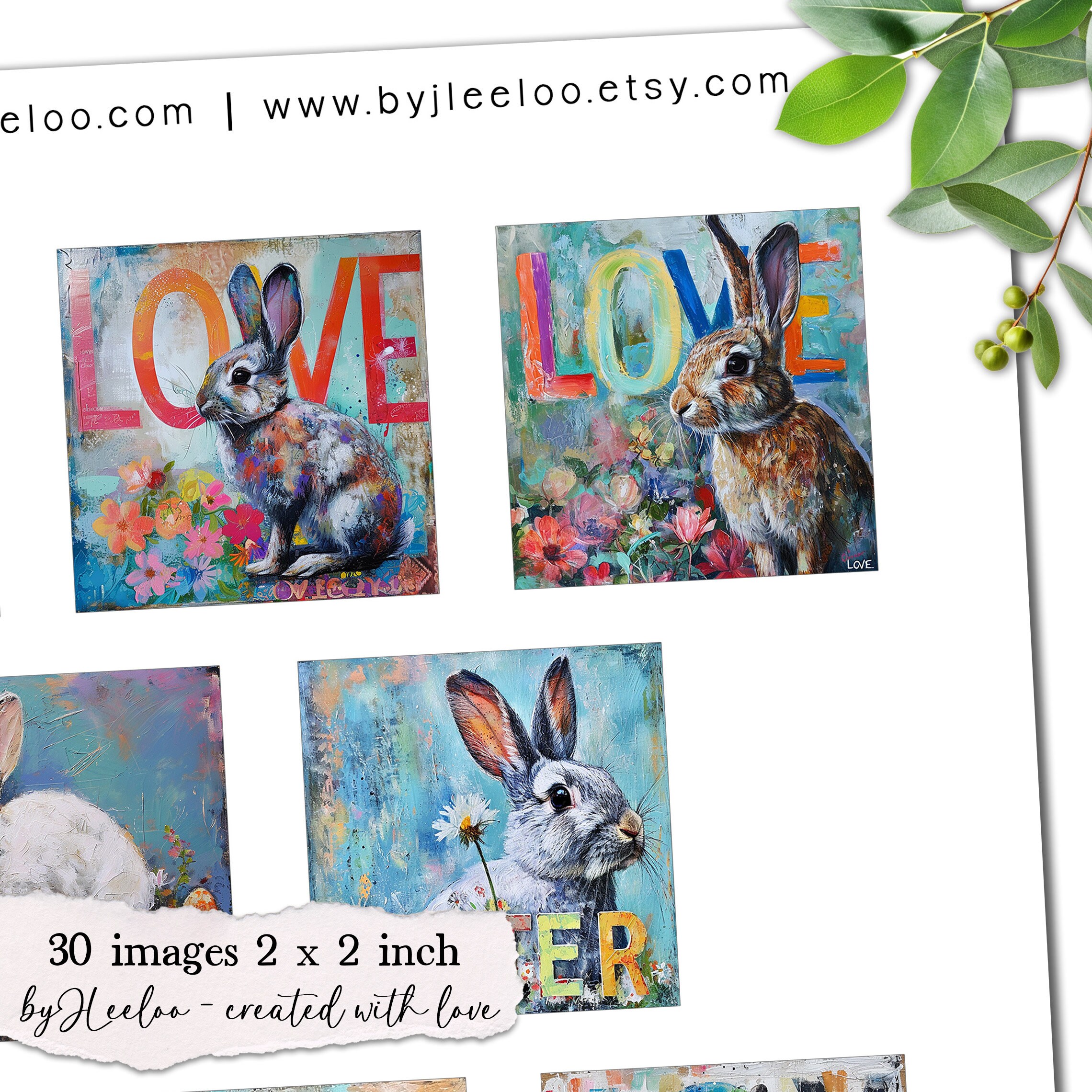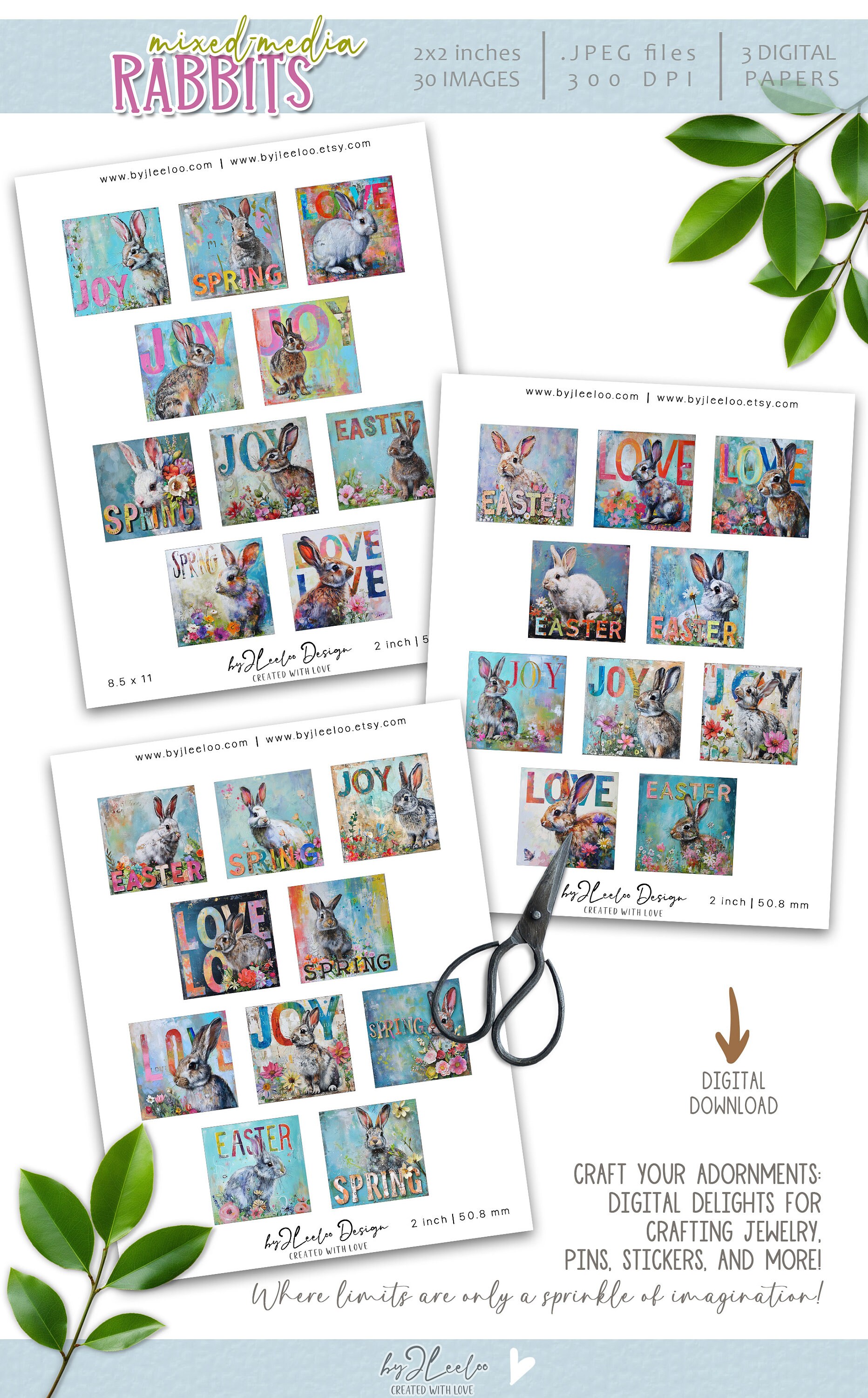 MIXED-MEDIA RABBITS 2x2 inch printable | supplies square pendants, sticker, bezel trays, glass cabochon mountings, cameo settings | qu576
