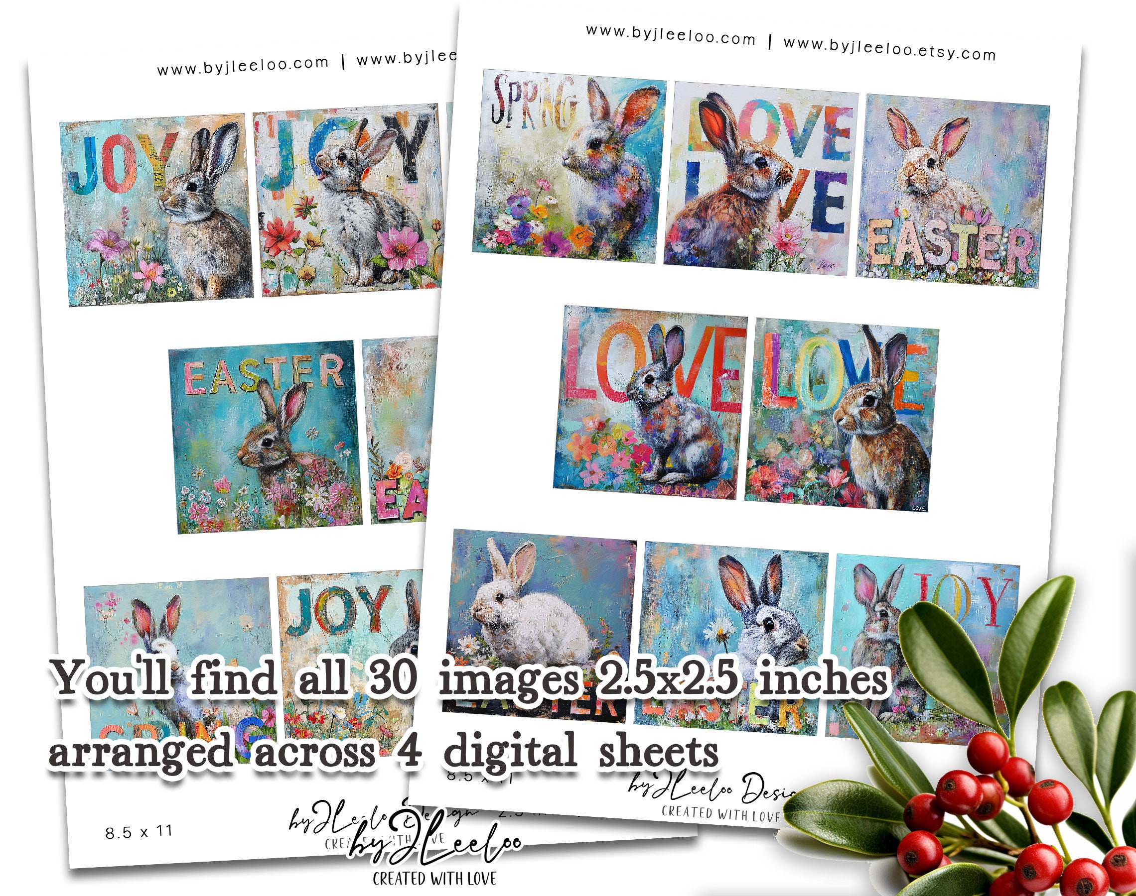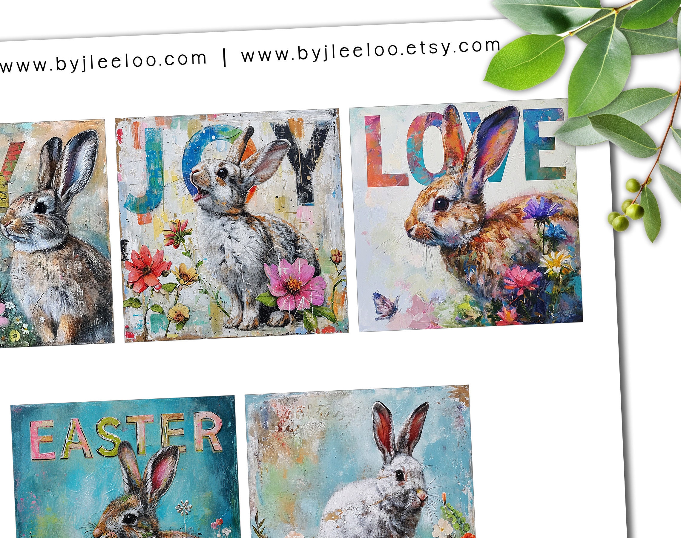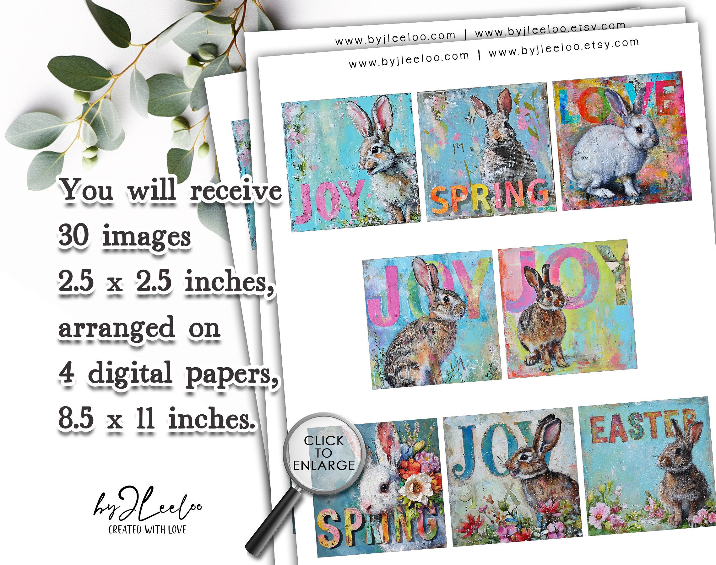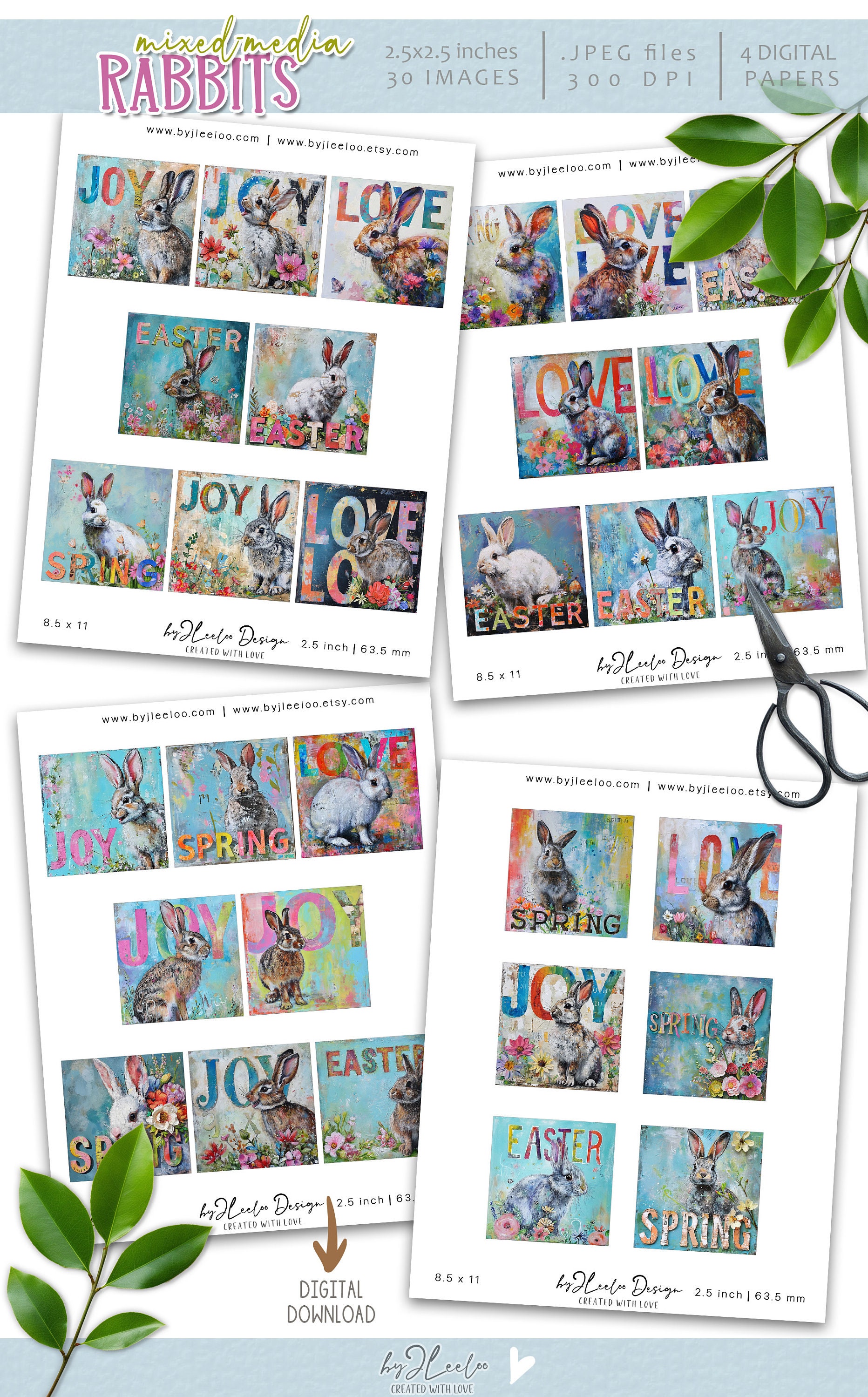 MIXED-MEDIA RABBITS 2.5x2.5 inch printable | supplies square pendants, sticker, magnet, collage, journaling, craft tile, tags, label | qu577