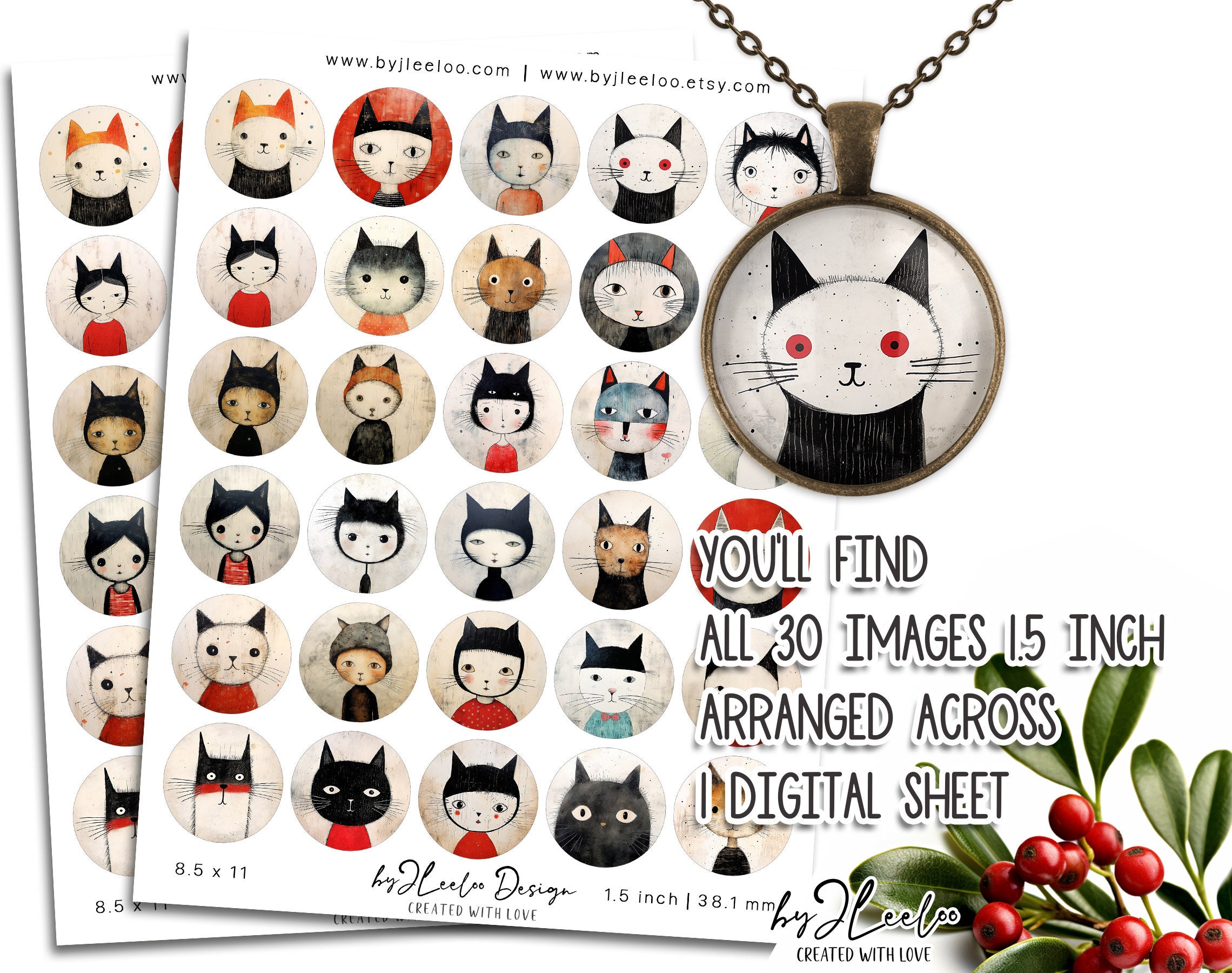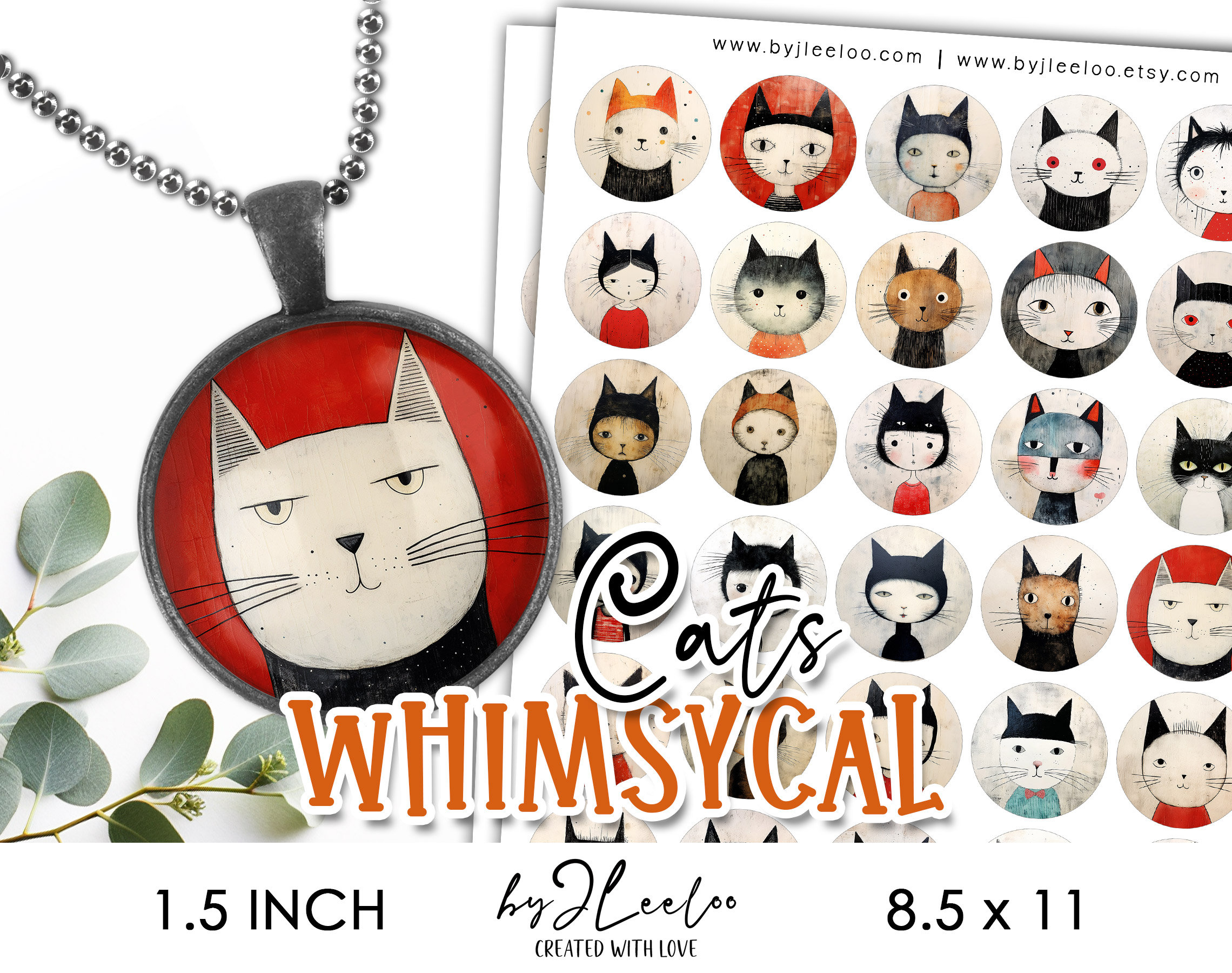 WHIMSICAL CATS 1.5 inch printable | supplies round pendant sticker charms glass cabochon magnet | ornaments journal scrapbook craft | tn705