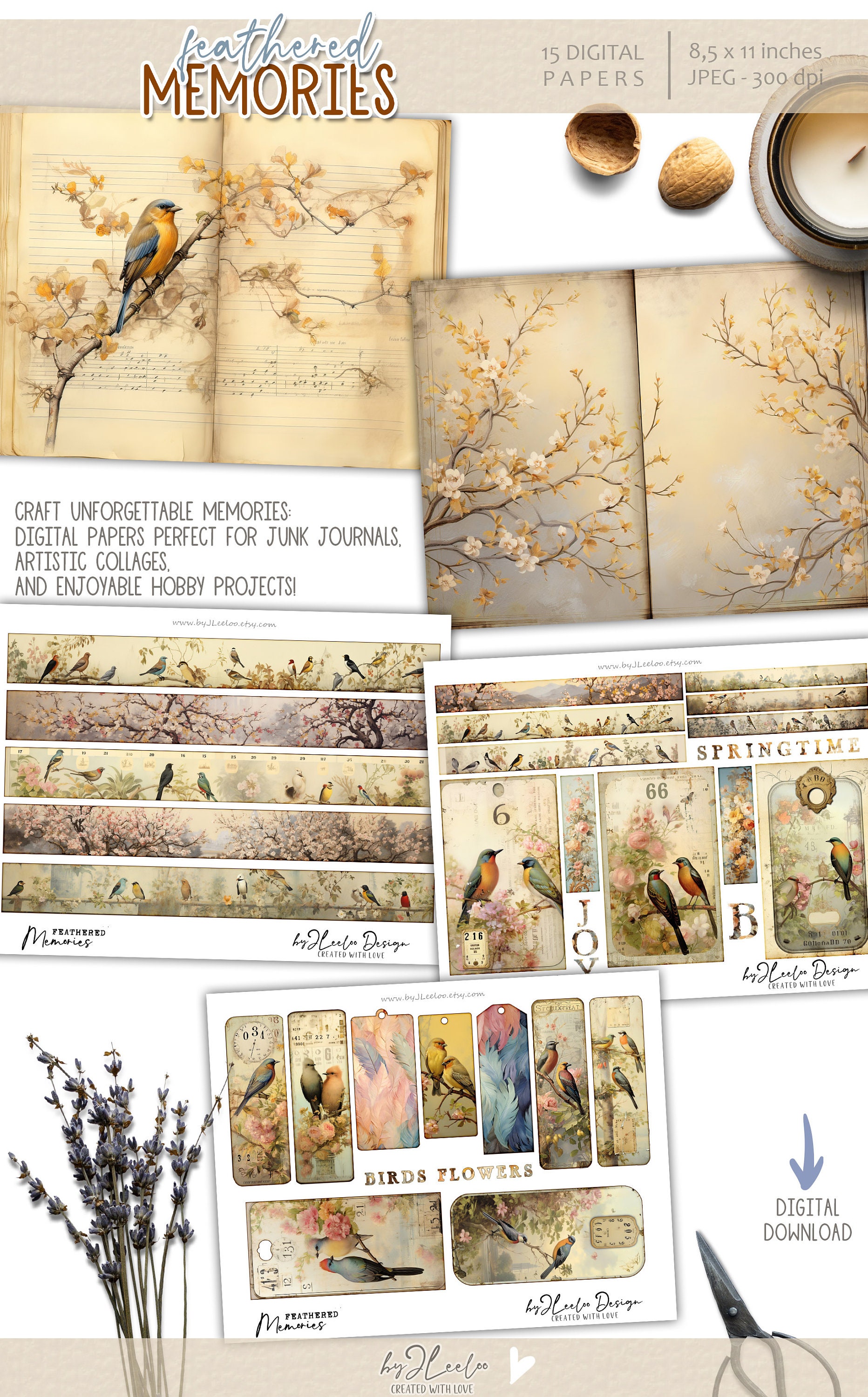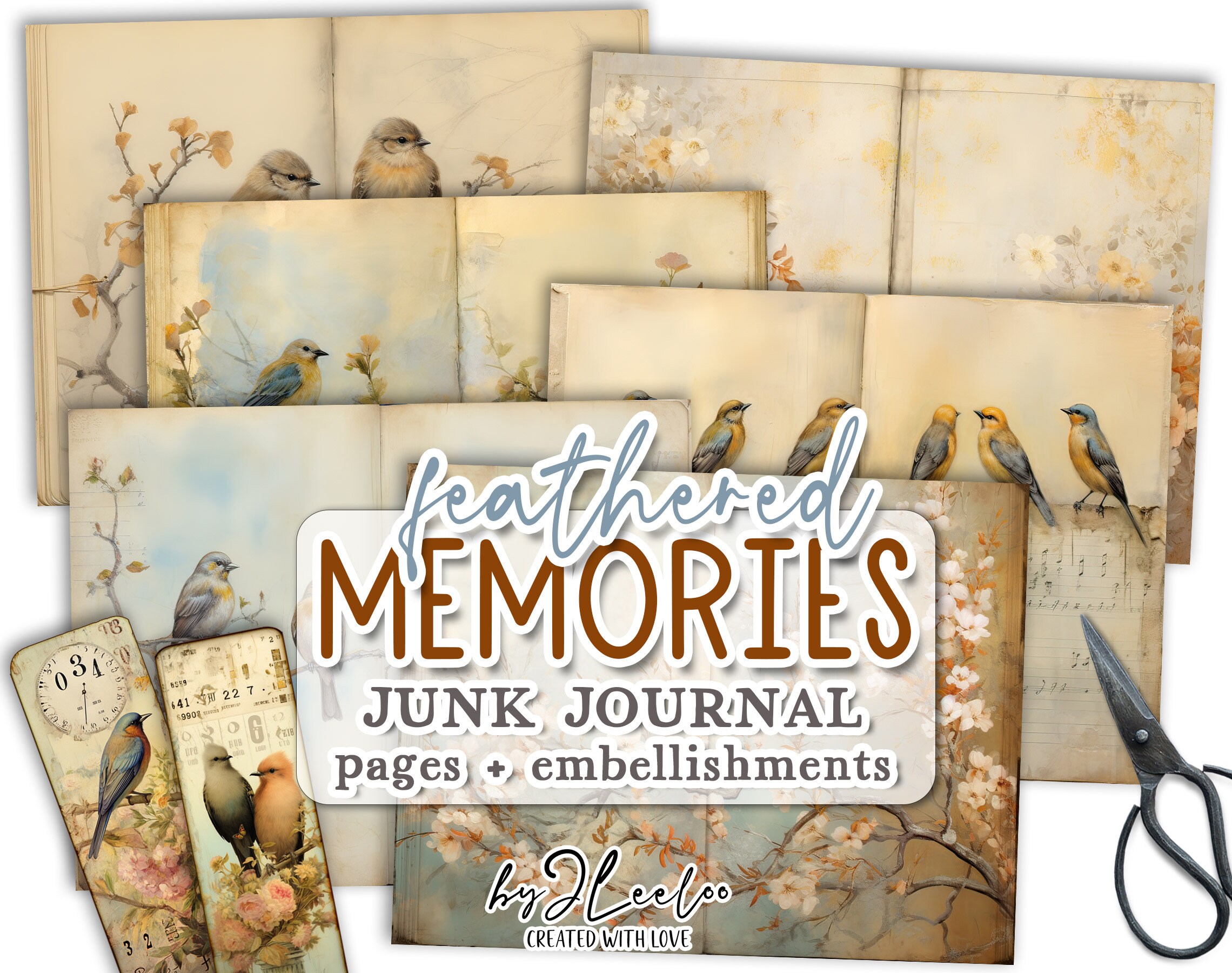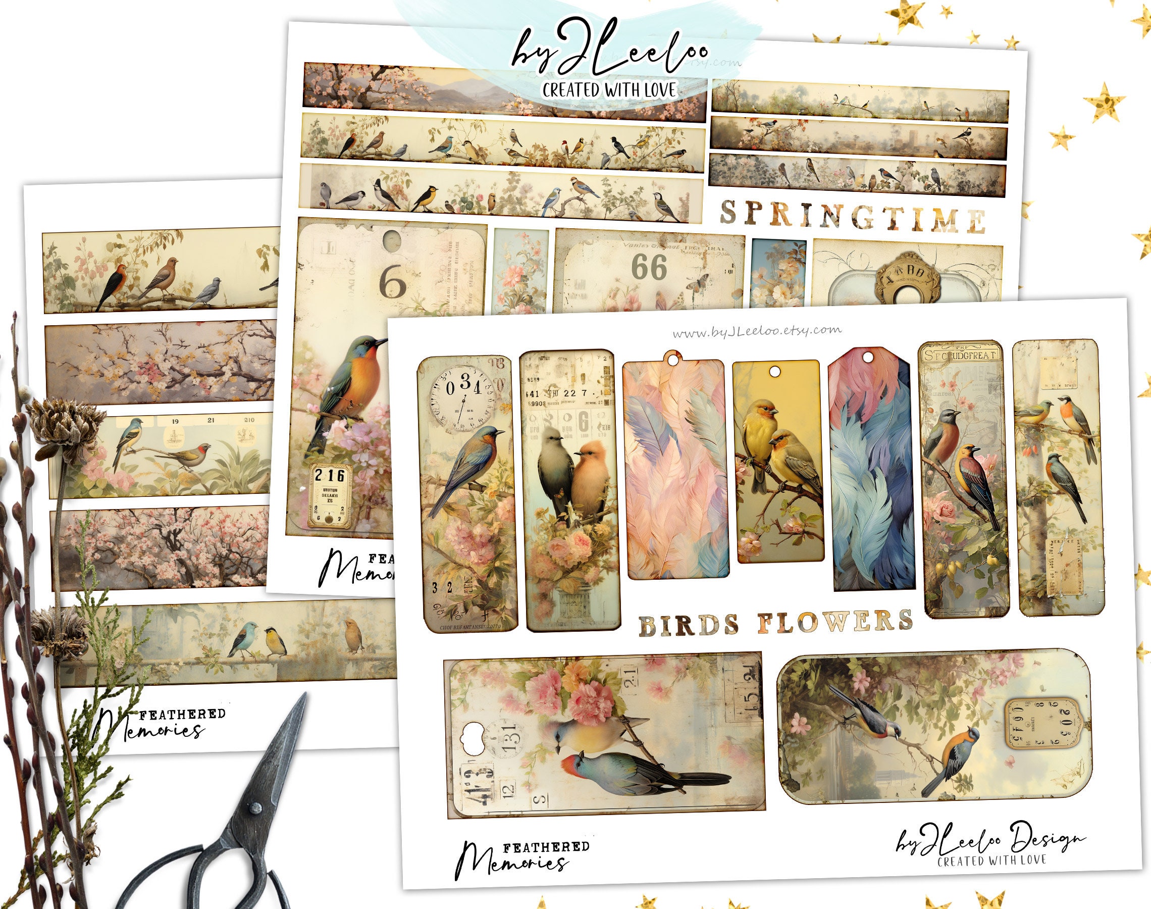 FEATHERED MEMORIES junk journal printable | half pages tag Mixed Media supplies | Birds hand-drawn vintage card making collage diary | pp680