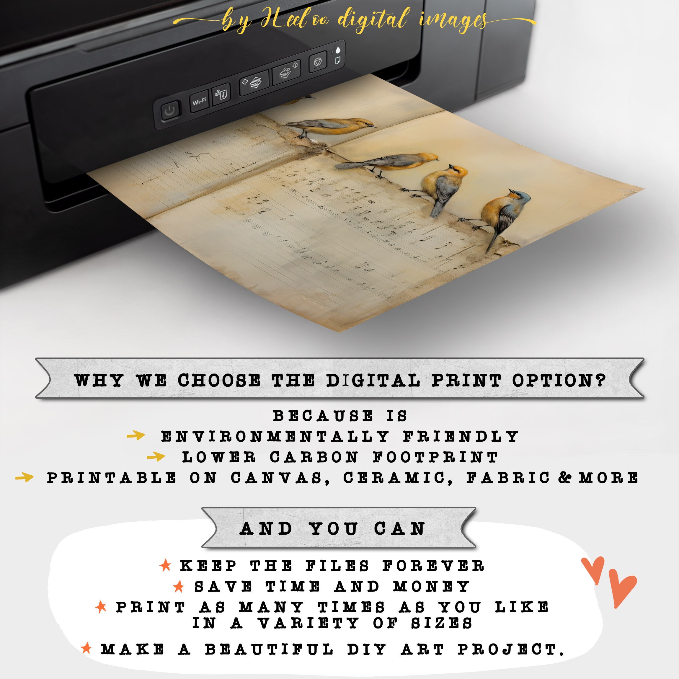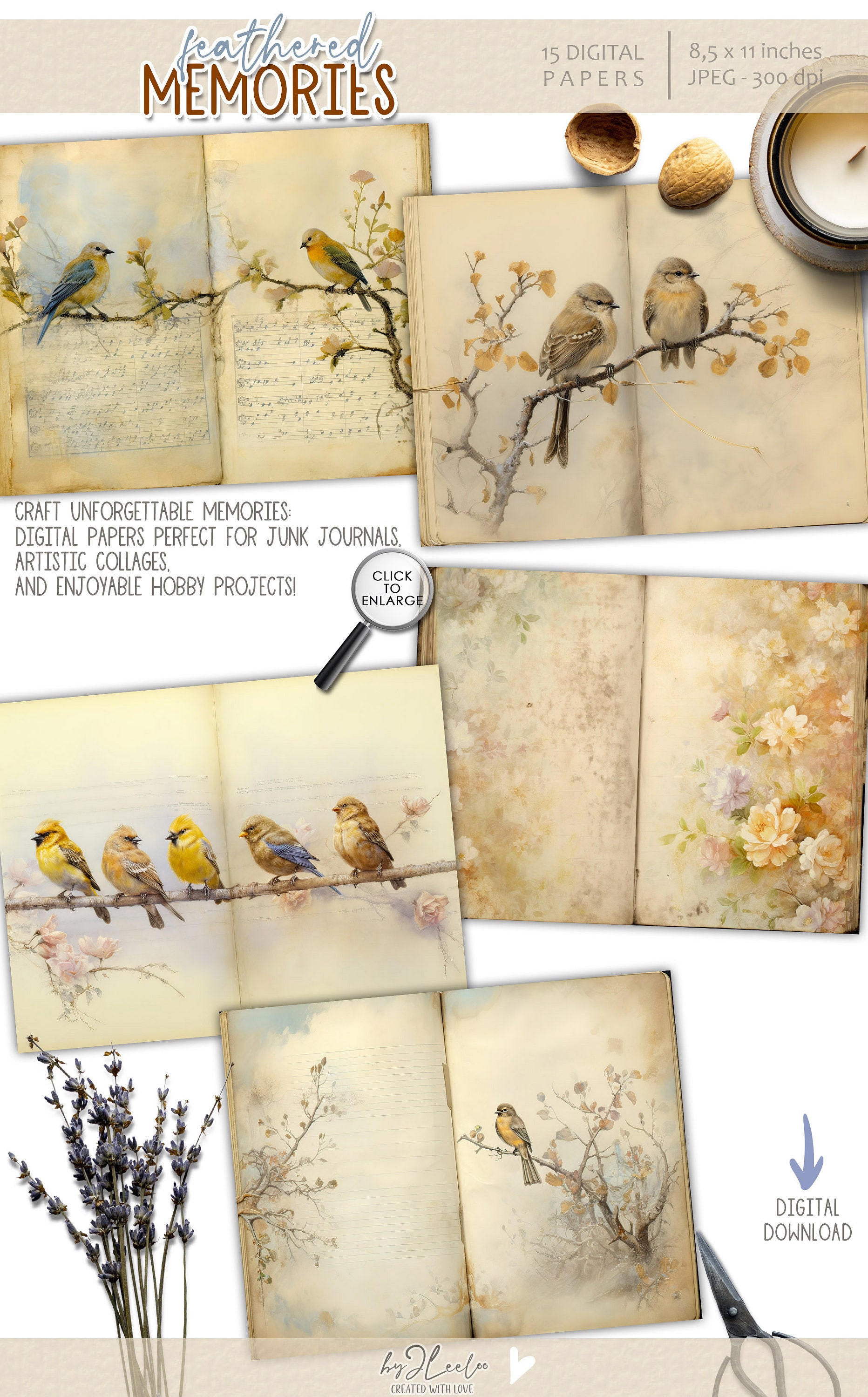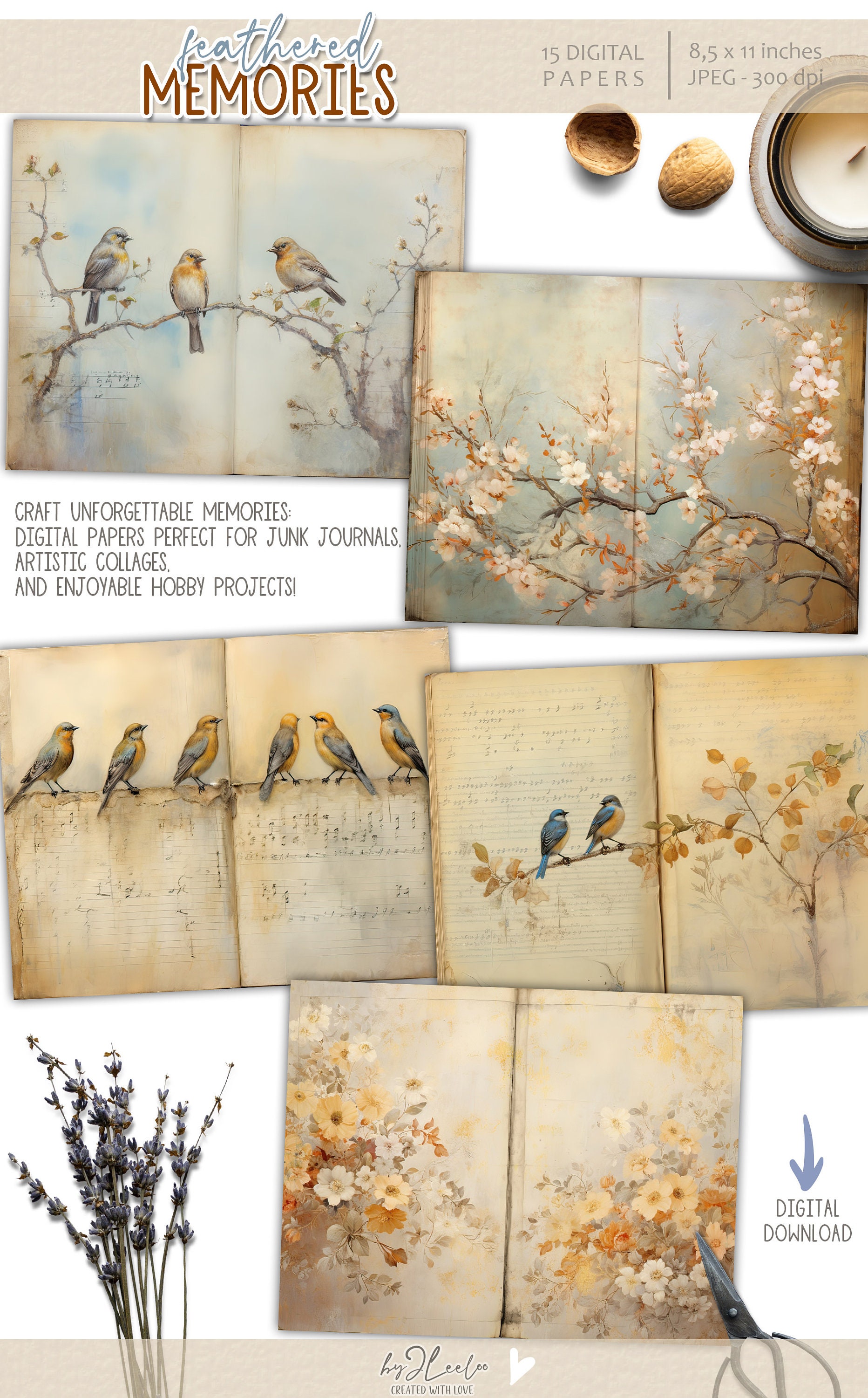 FEATHERED MEMORIES junk journal printable | half pages tag Mixed Media supplies | Birds hand-drawn vintage card making collage diary | pp680