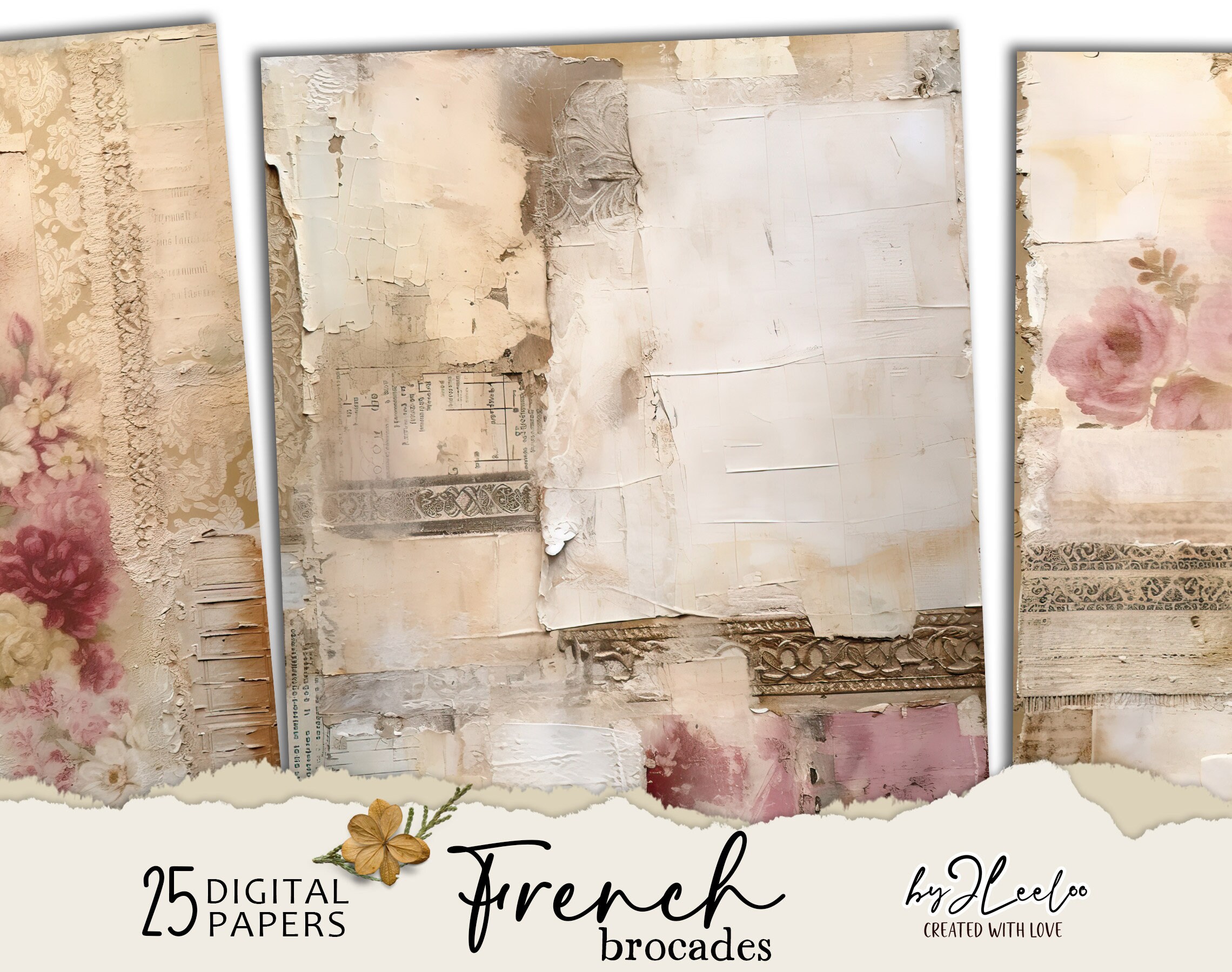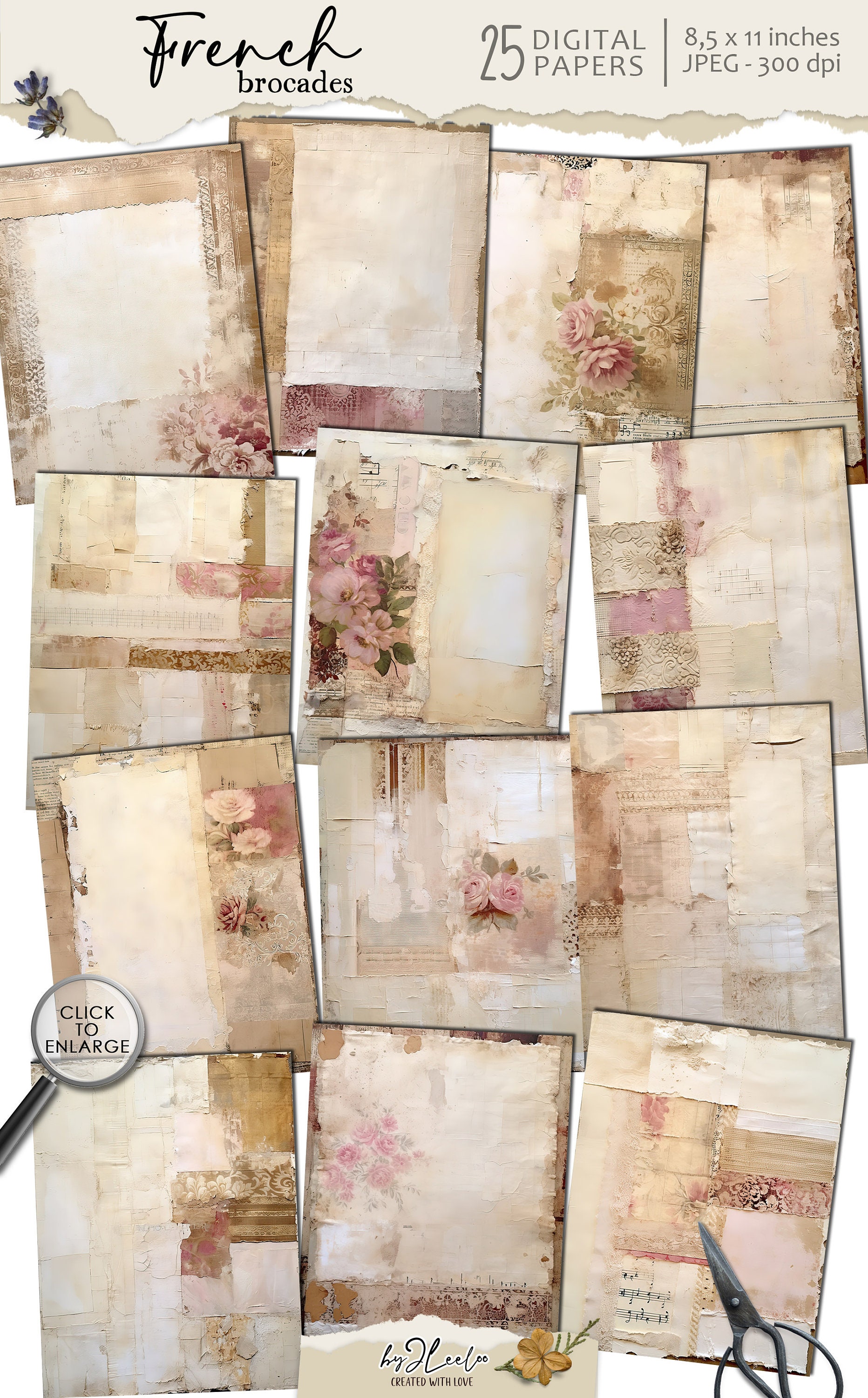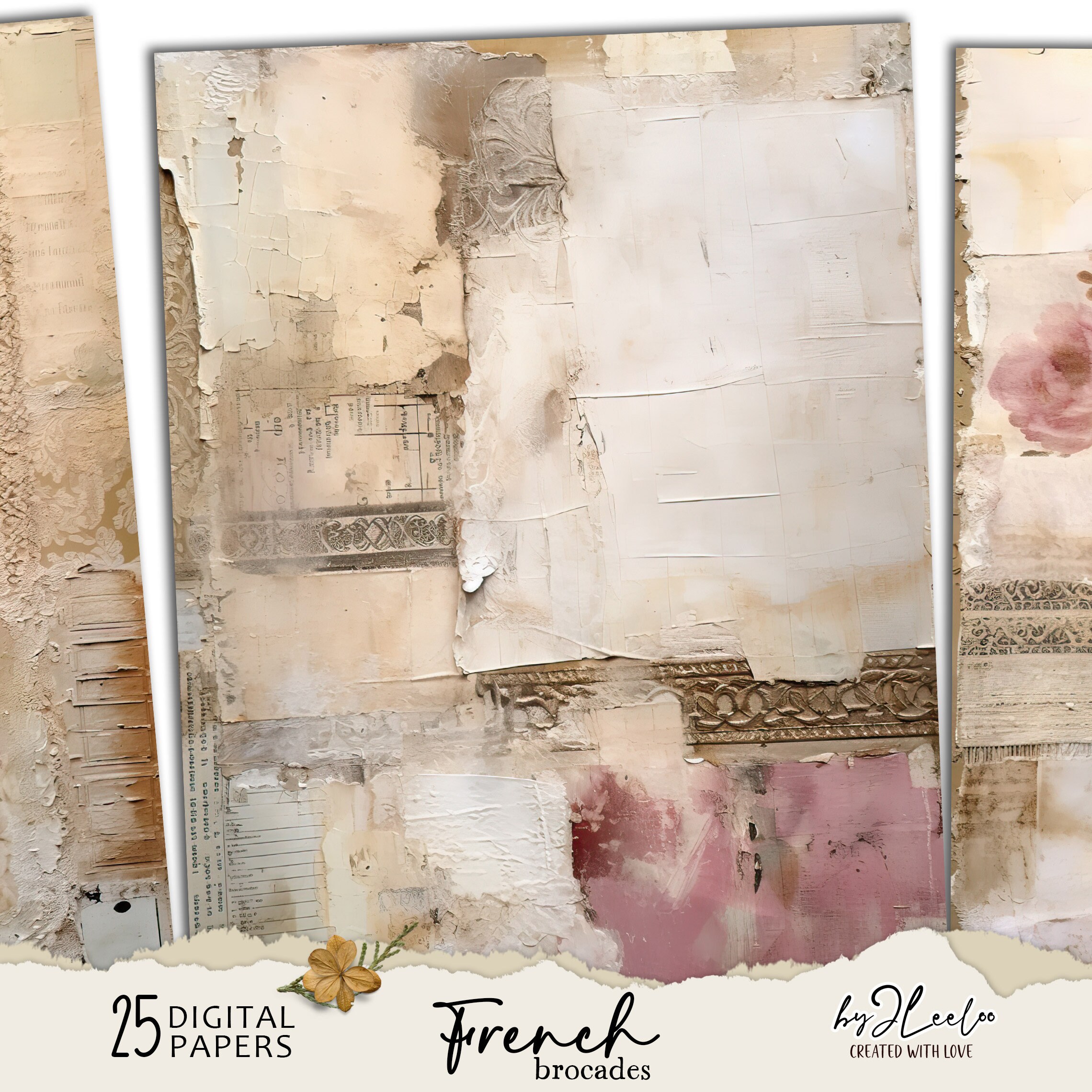 FRENCH BROCADE soft pink vintage background | Collaged aged paper Junk Journal pages background Distressed grunge digital ephemera | pp699