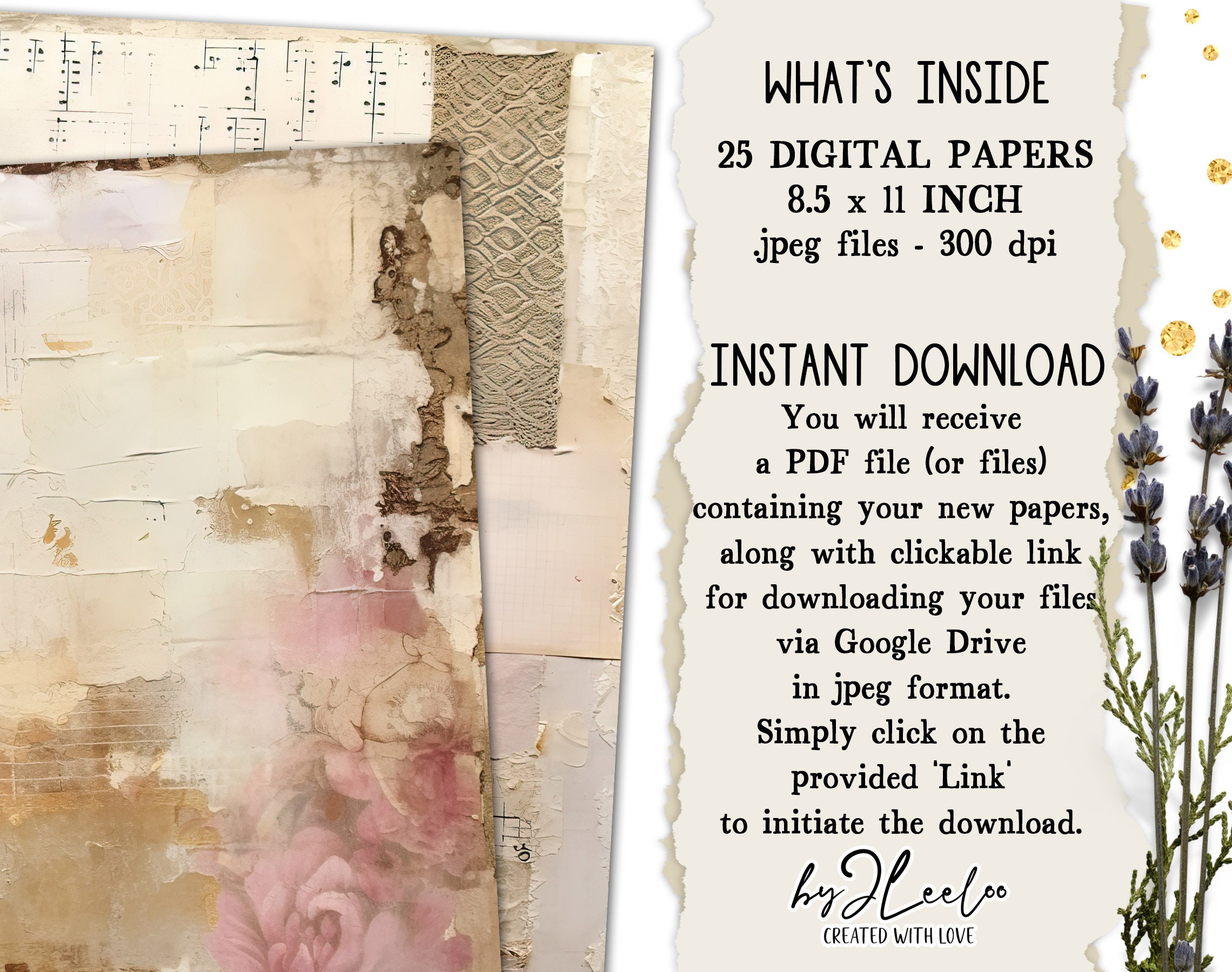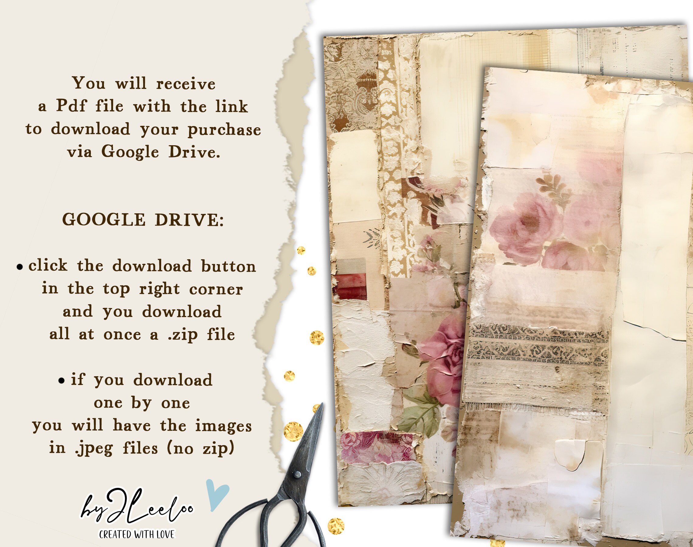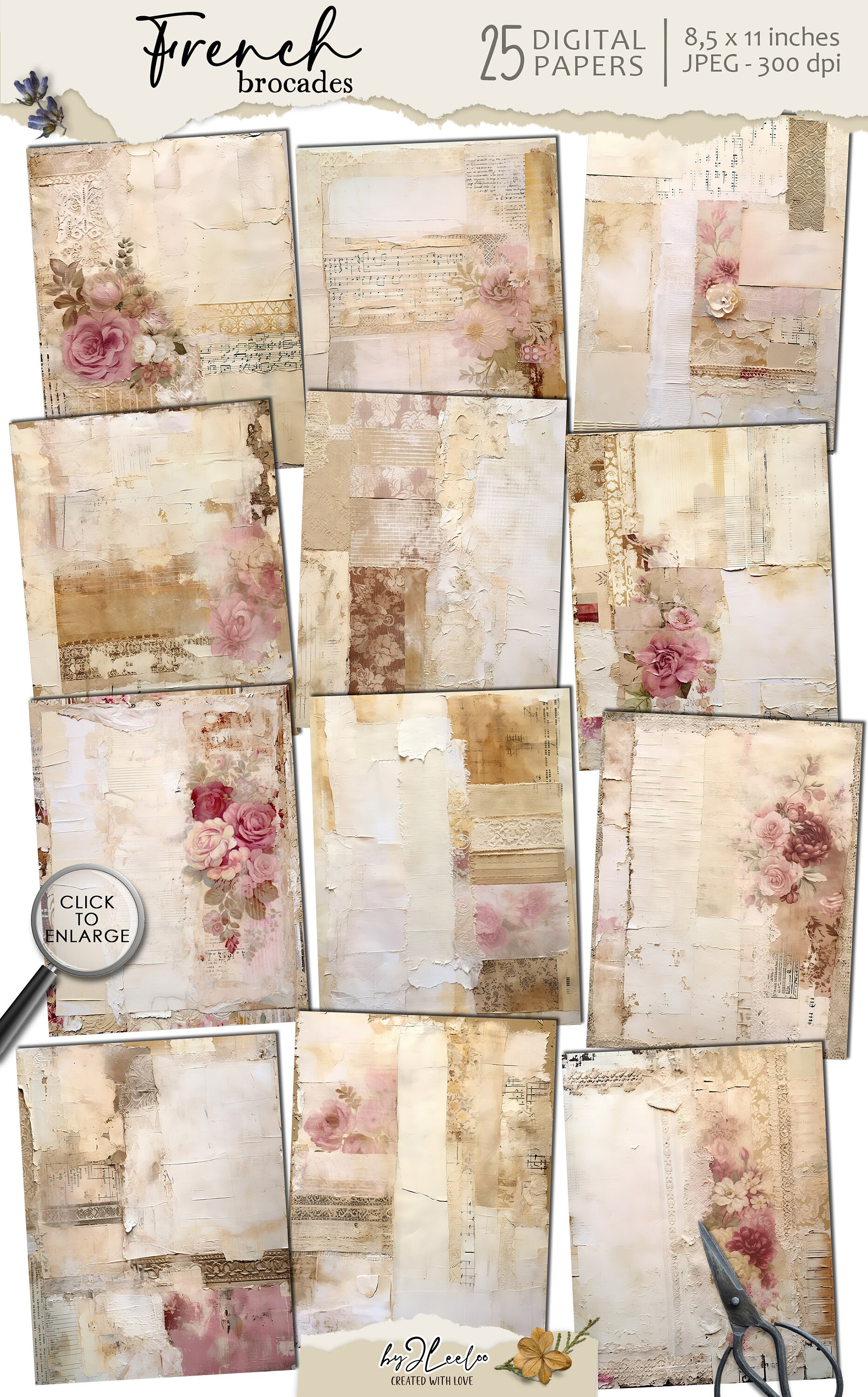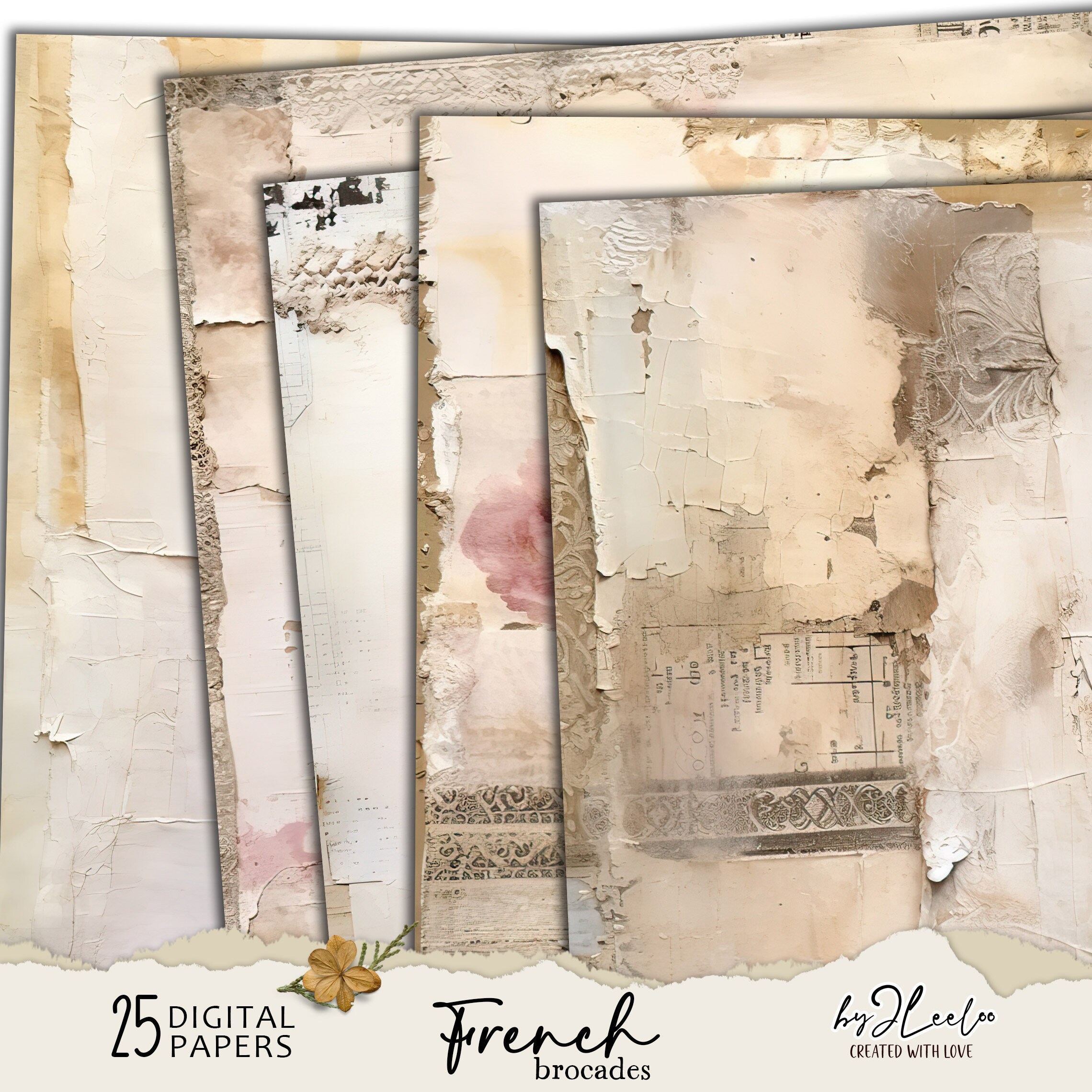 FRENCH BROCADE soft pink vintage background | Collaged aged paper Junk Journal pages background Distressed grunge digital ephemera | pp699