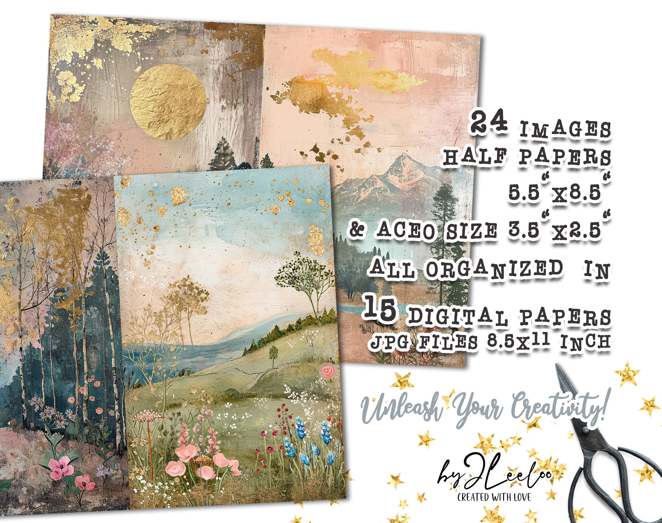 Embrace the spring vibes with these charming illustrations! Imagine scenic mountains ๐๏ธ, quaint villages ๐ก, peaceful landscapes ๐ณ, and meandering rivers ๐. Let the pastels and gold foil bring your creations to life! ๐ทโจ