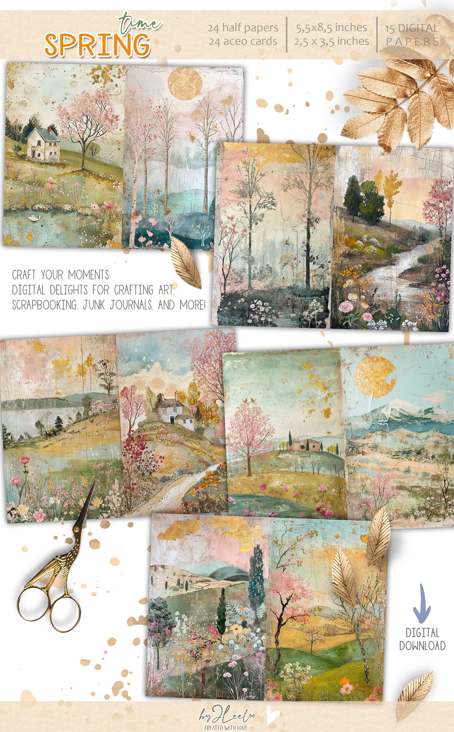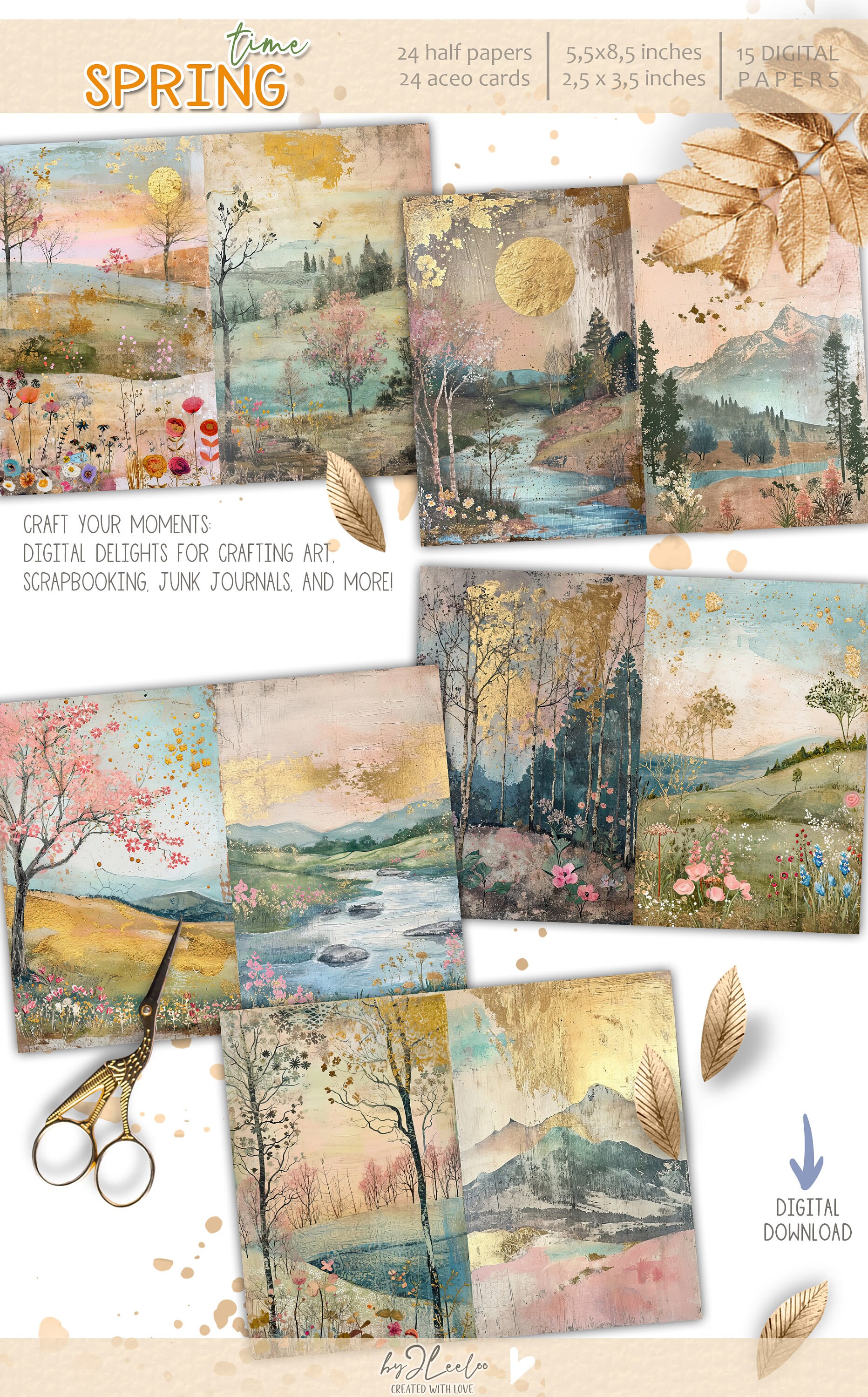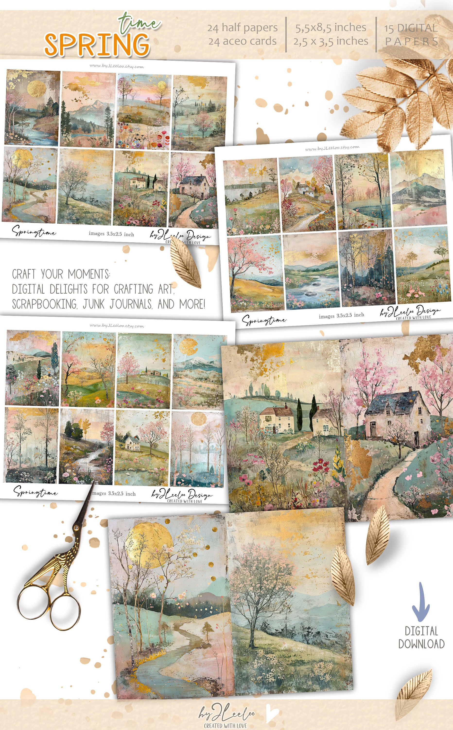 SPRINGTIME half pages aceo print for spring junk journal Mixed Media | Hand-drawn painting supplies card collage diary gold foil | pp697