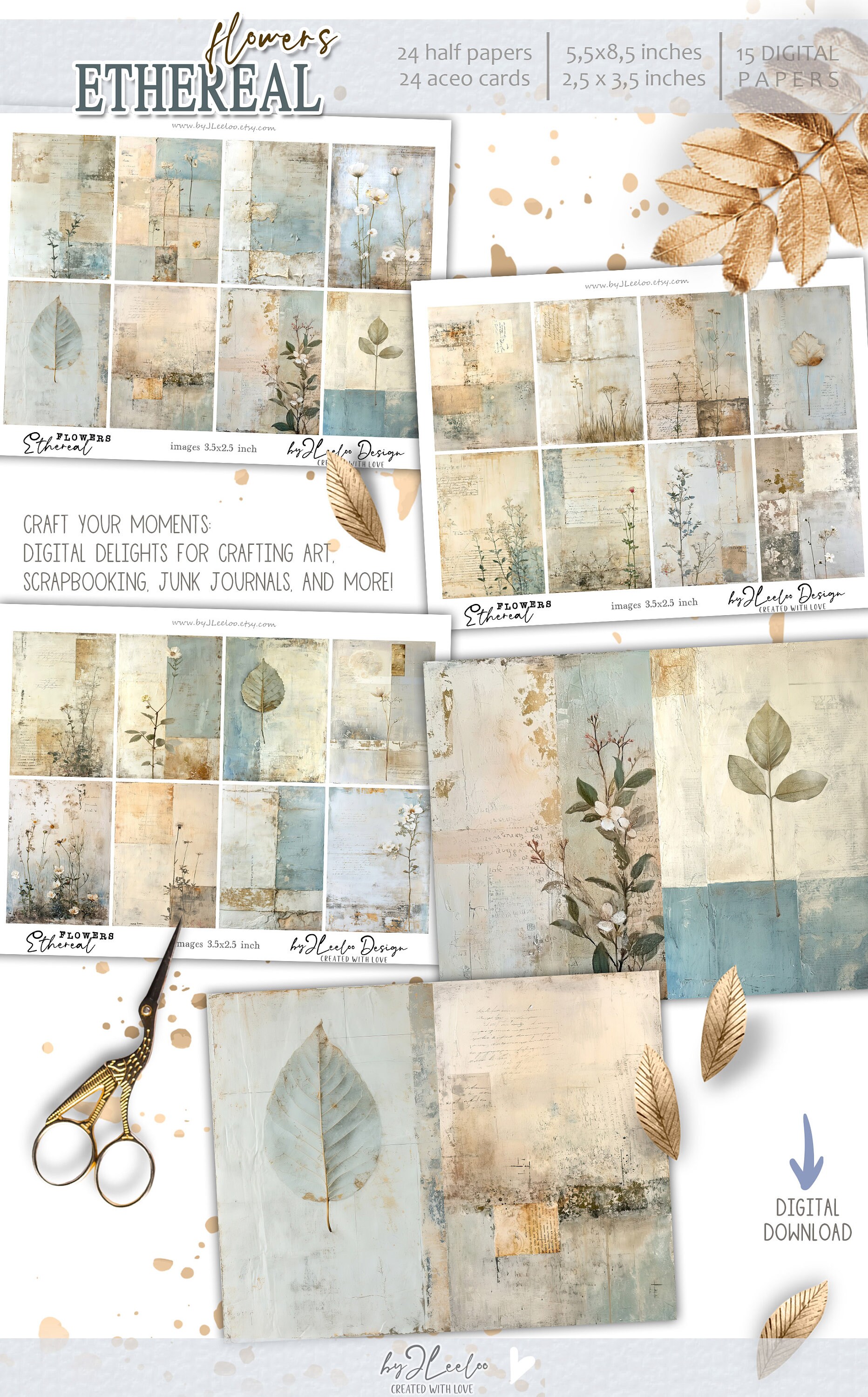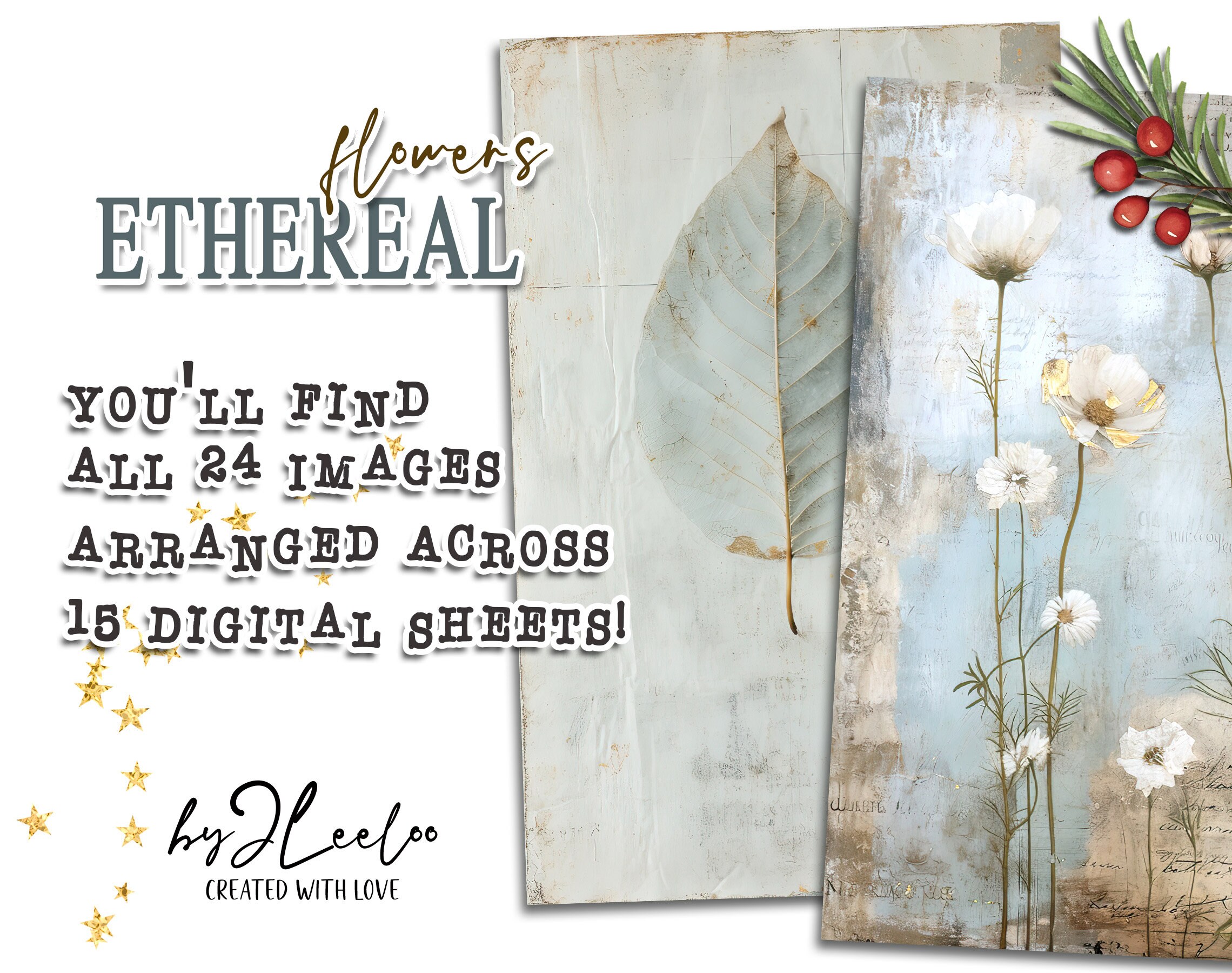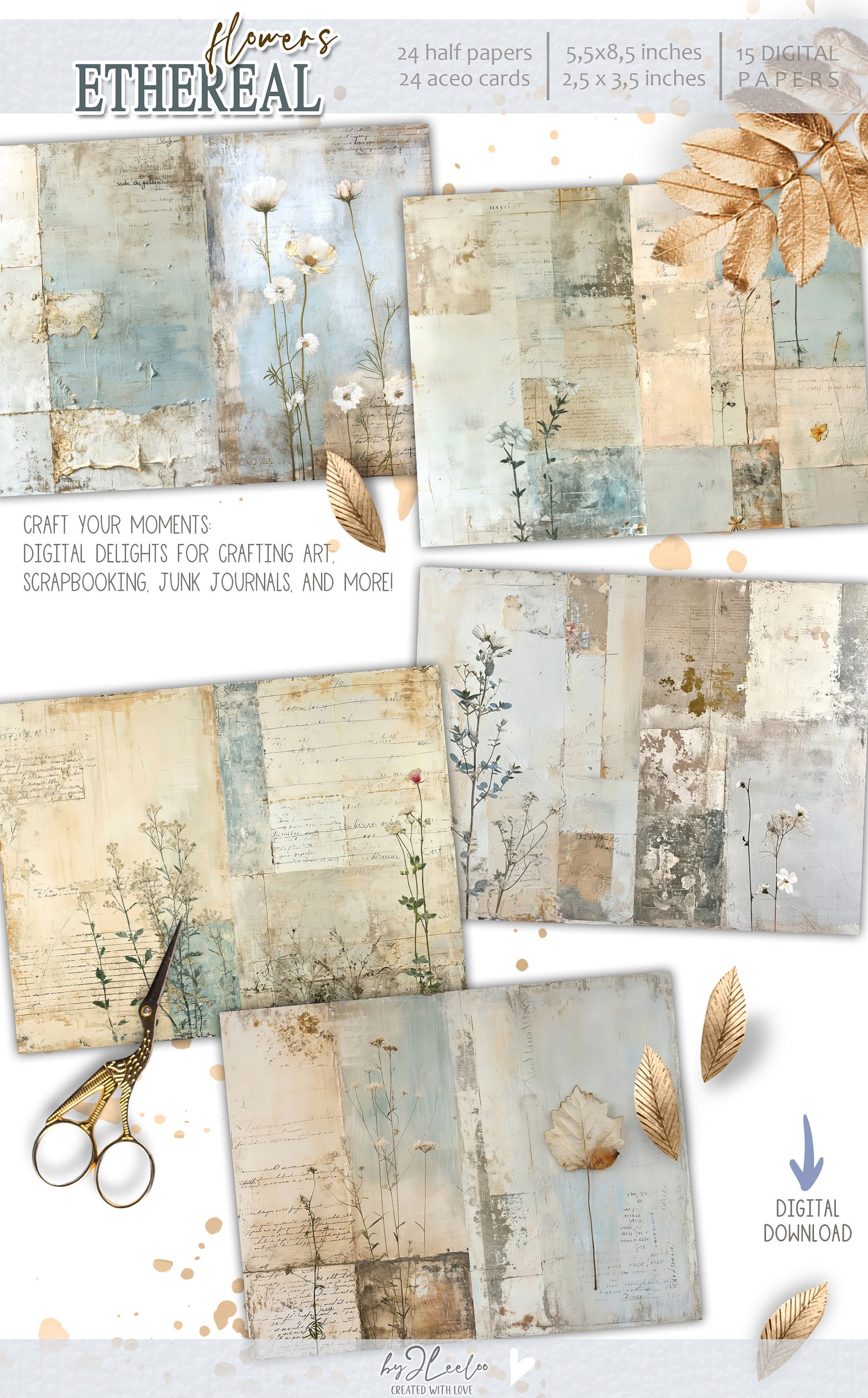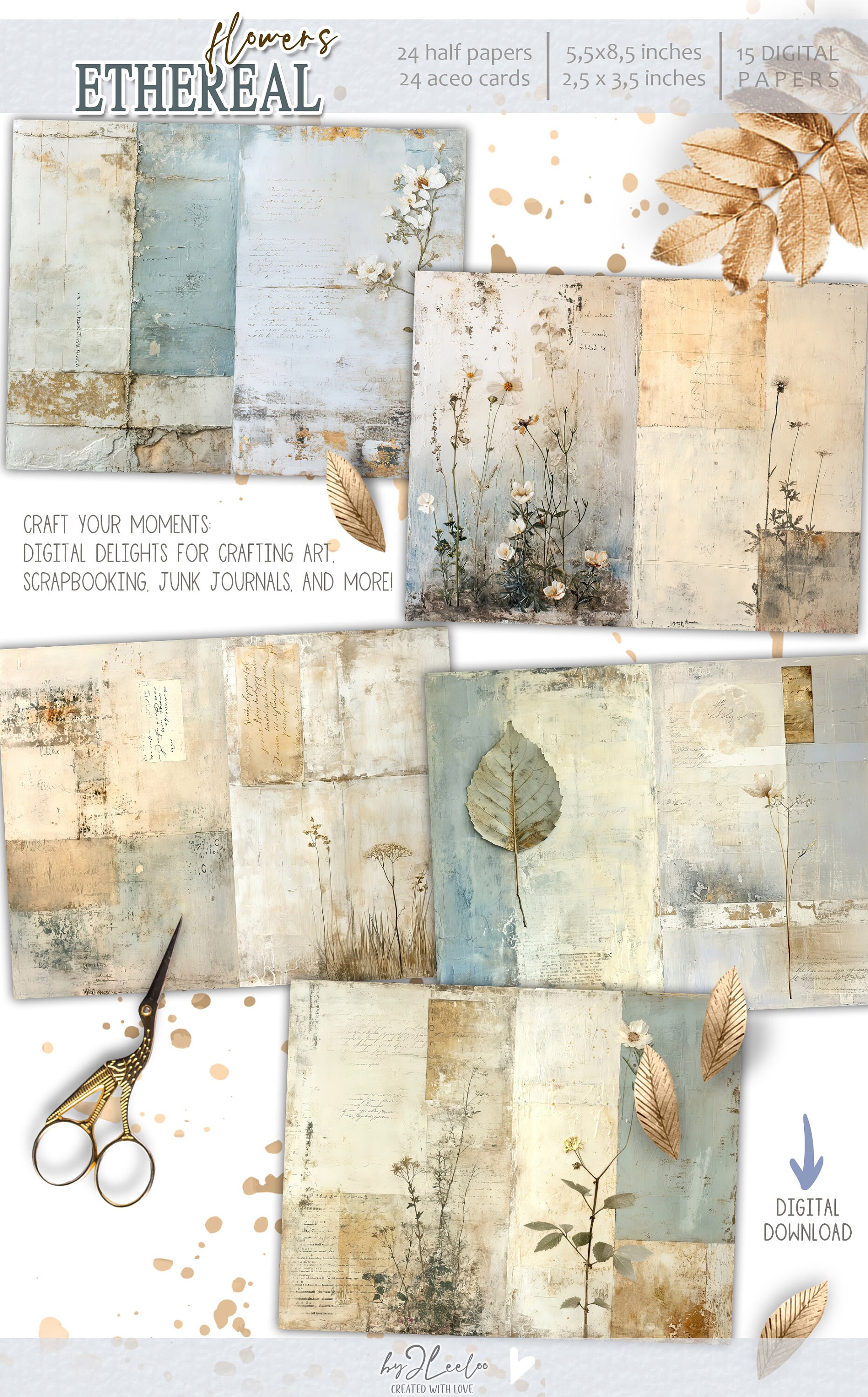 ETHEREAL FLOWERS half pages printable | Botanical junk journal Mixed Media supplies | Distressed french ephemera collage paper card collage diary | pp710