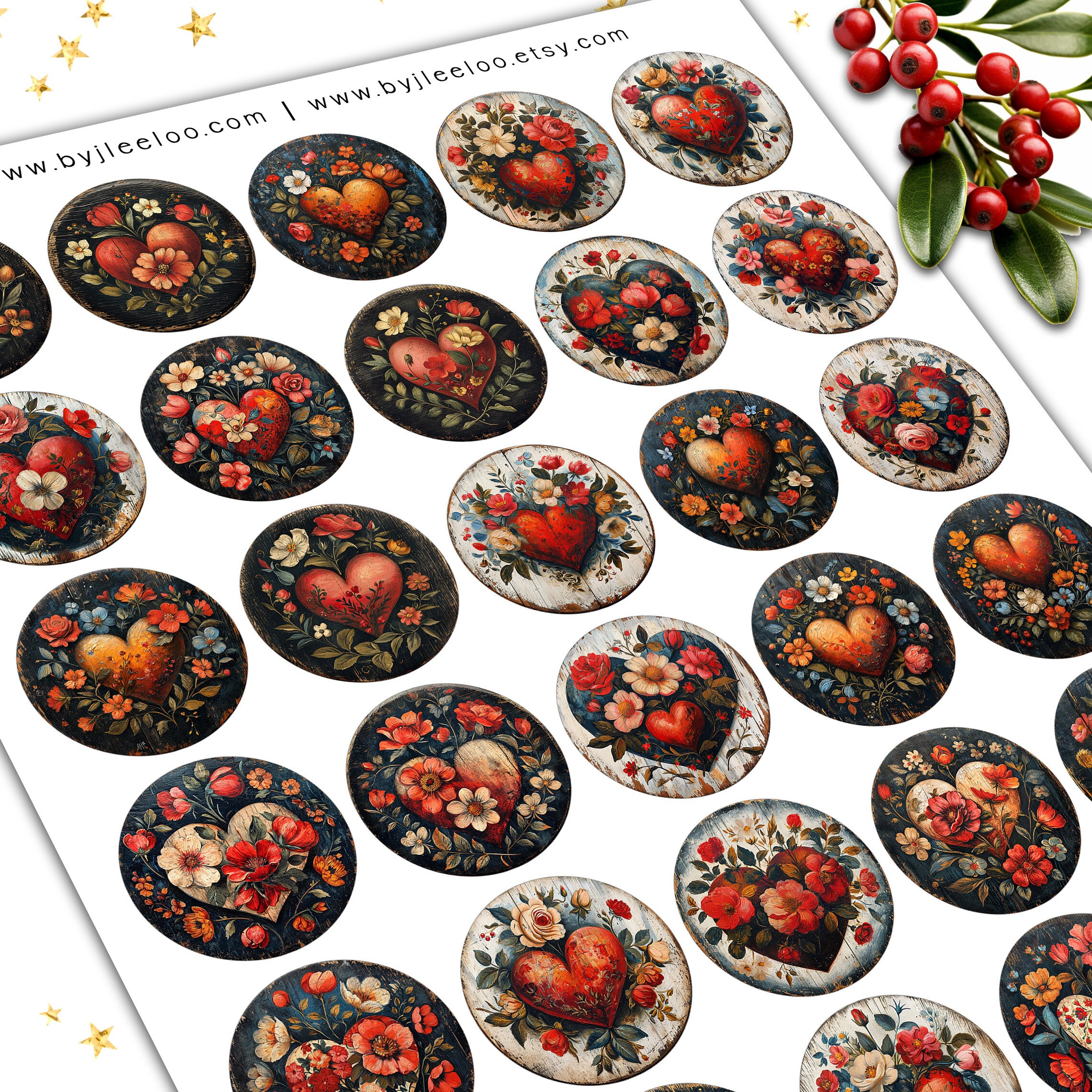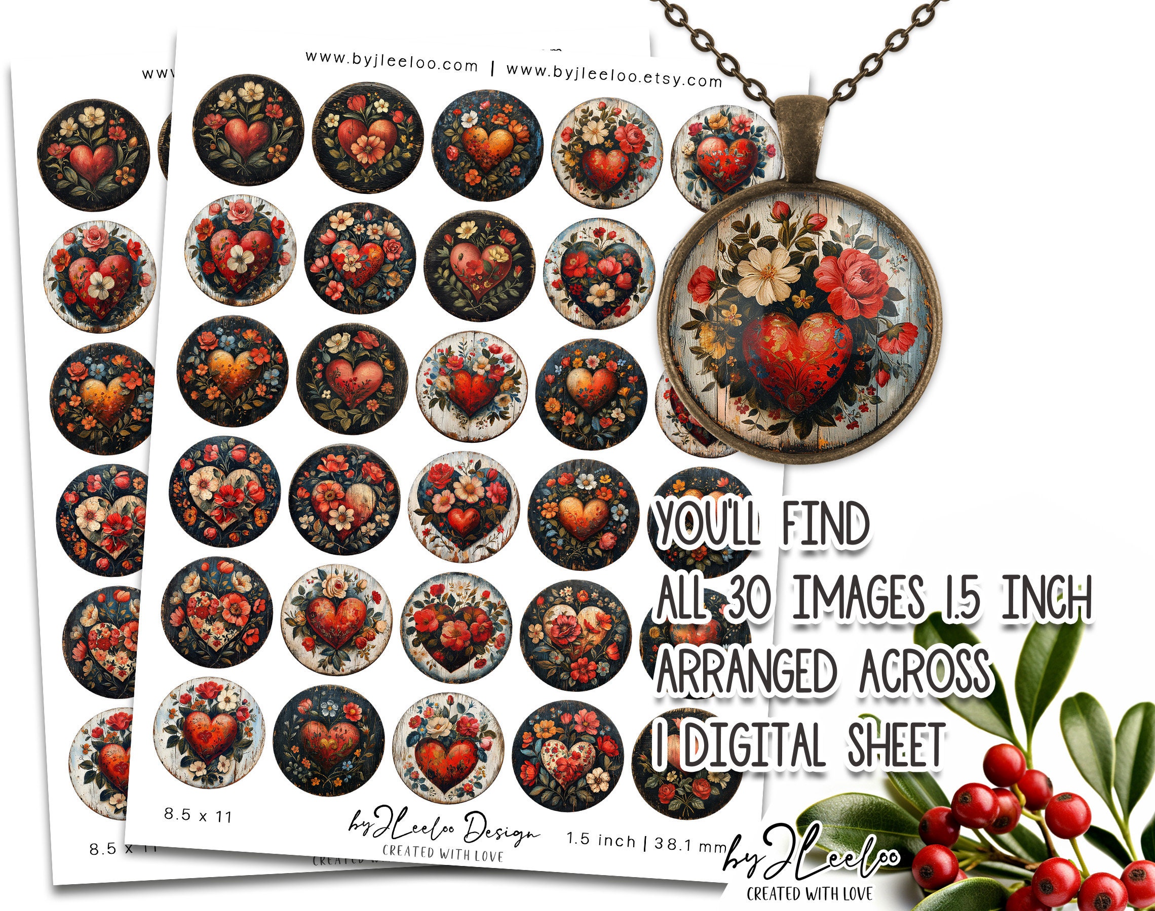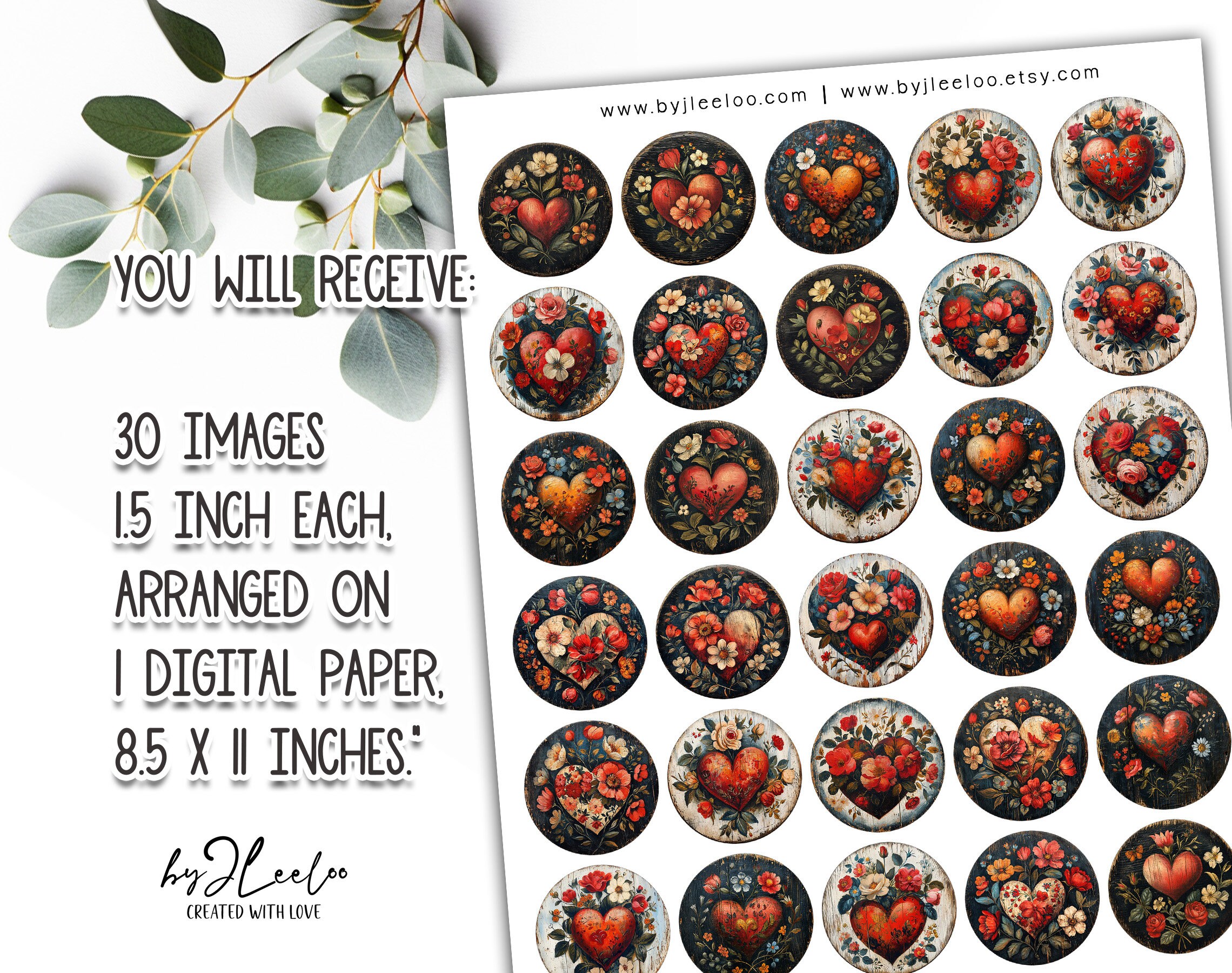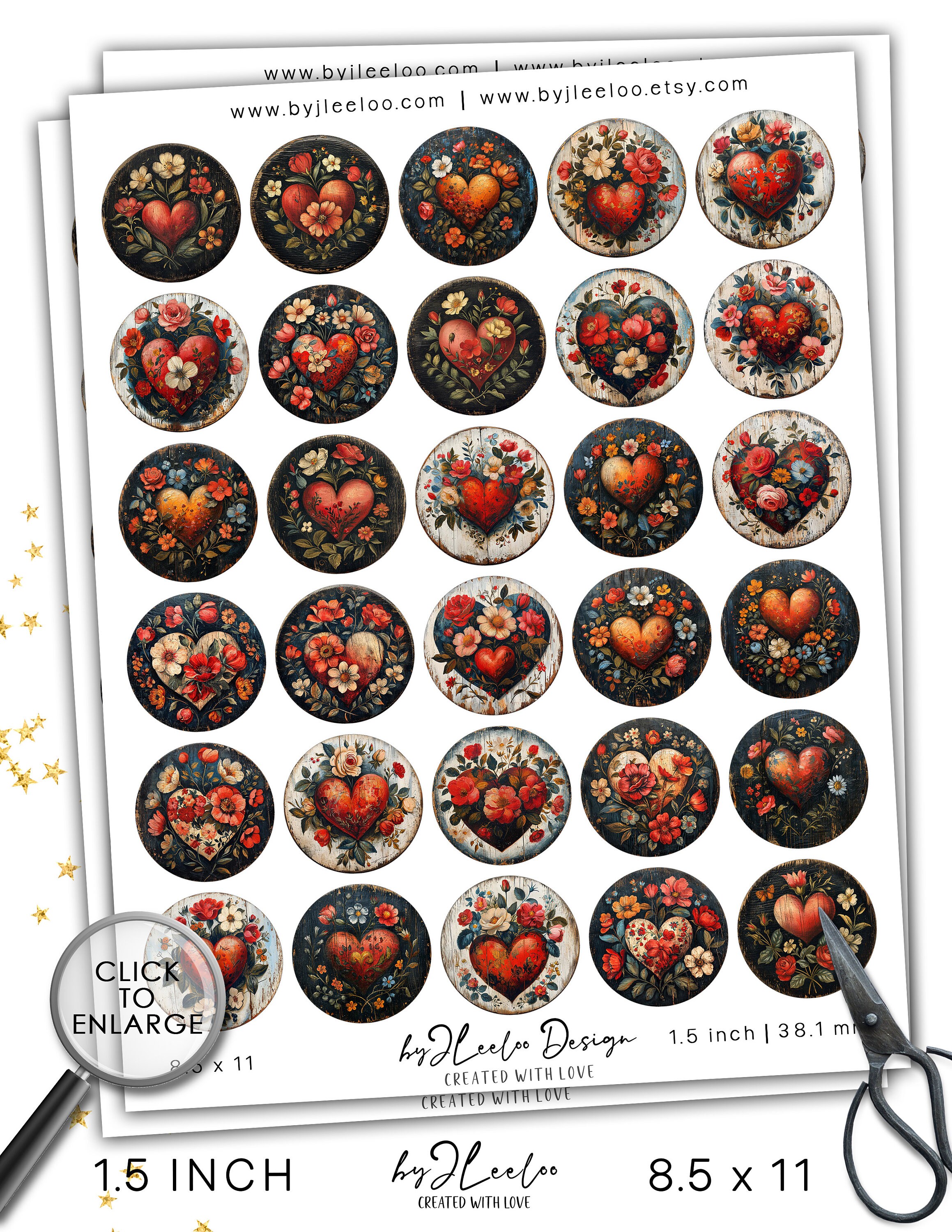 RUSTICCORE HEART 1.5 inch printable illustration | Valentine supplies round pendants glass cabochon charm pin mirror journal sticker | tn753