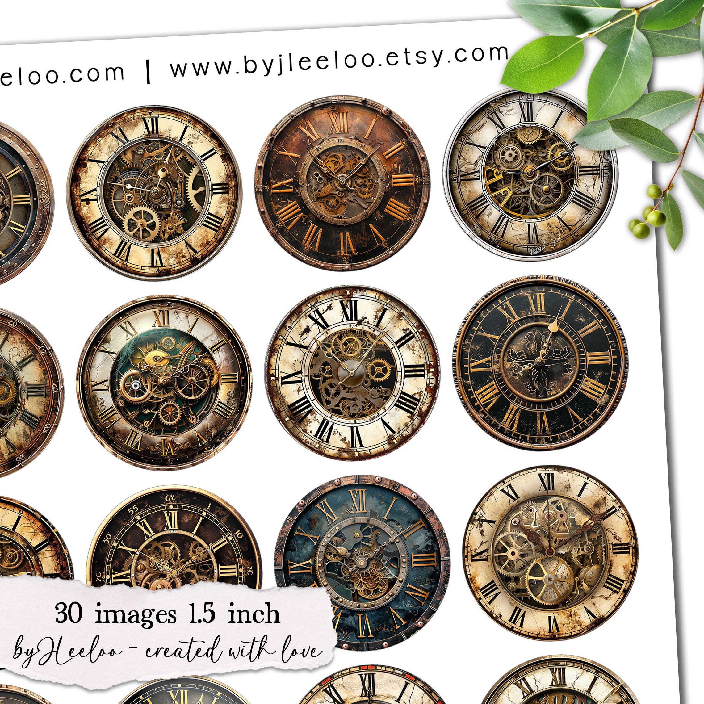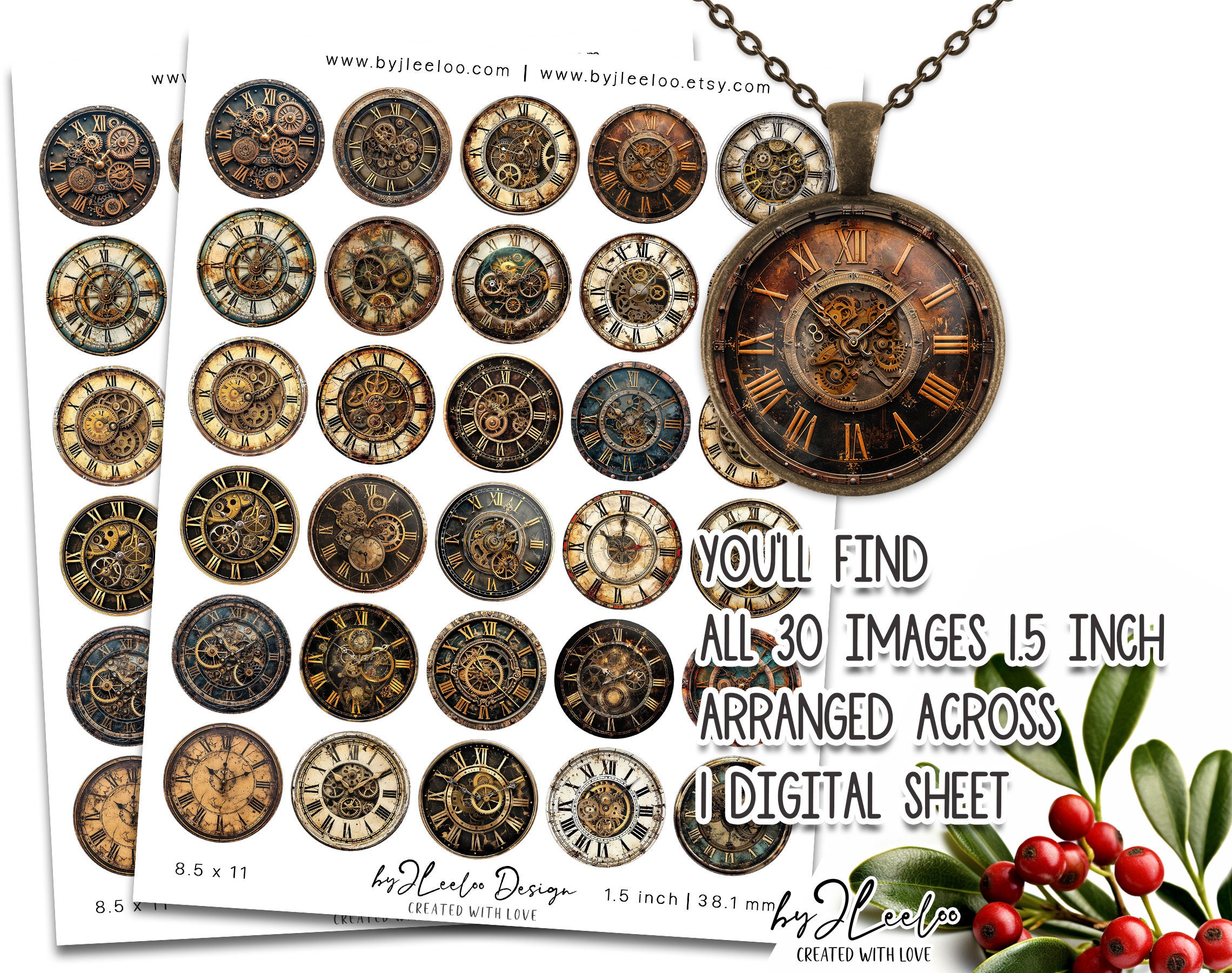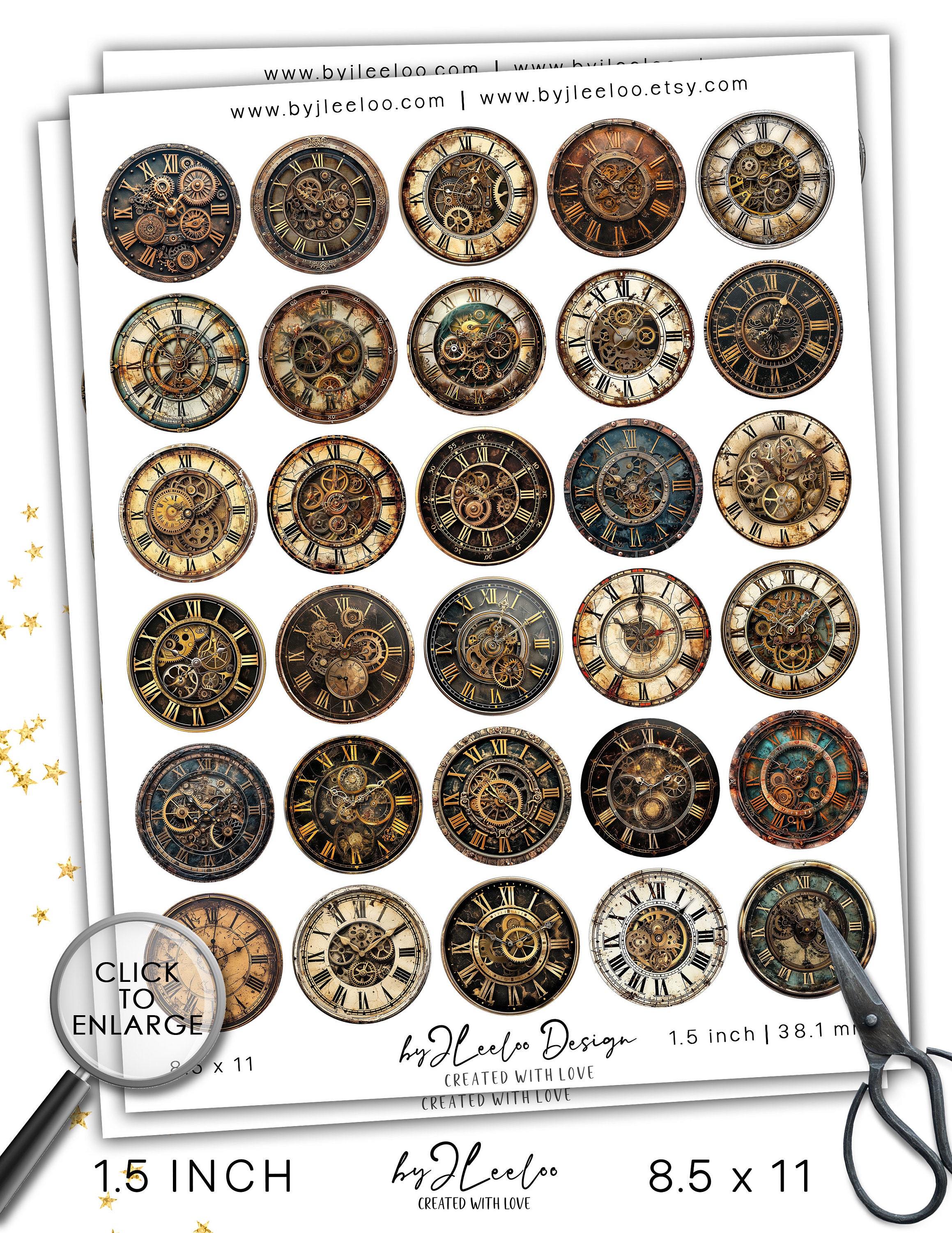 STEAMPUNK CLOCK 1.5 inch printable | Vintage supplies round pendant sticker mirror | fussy cut decoration junk journal scrapbooking | Digital Art Digital Download | tn765