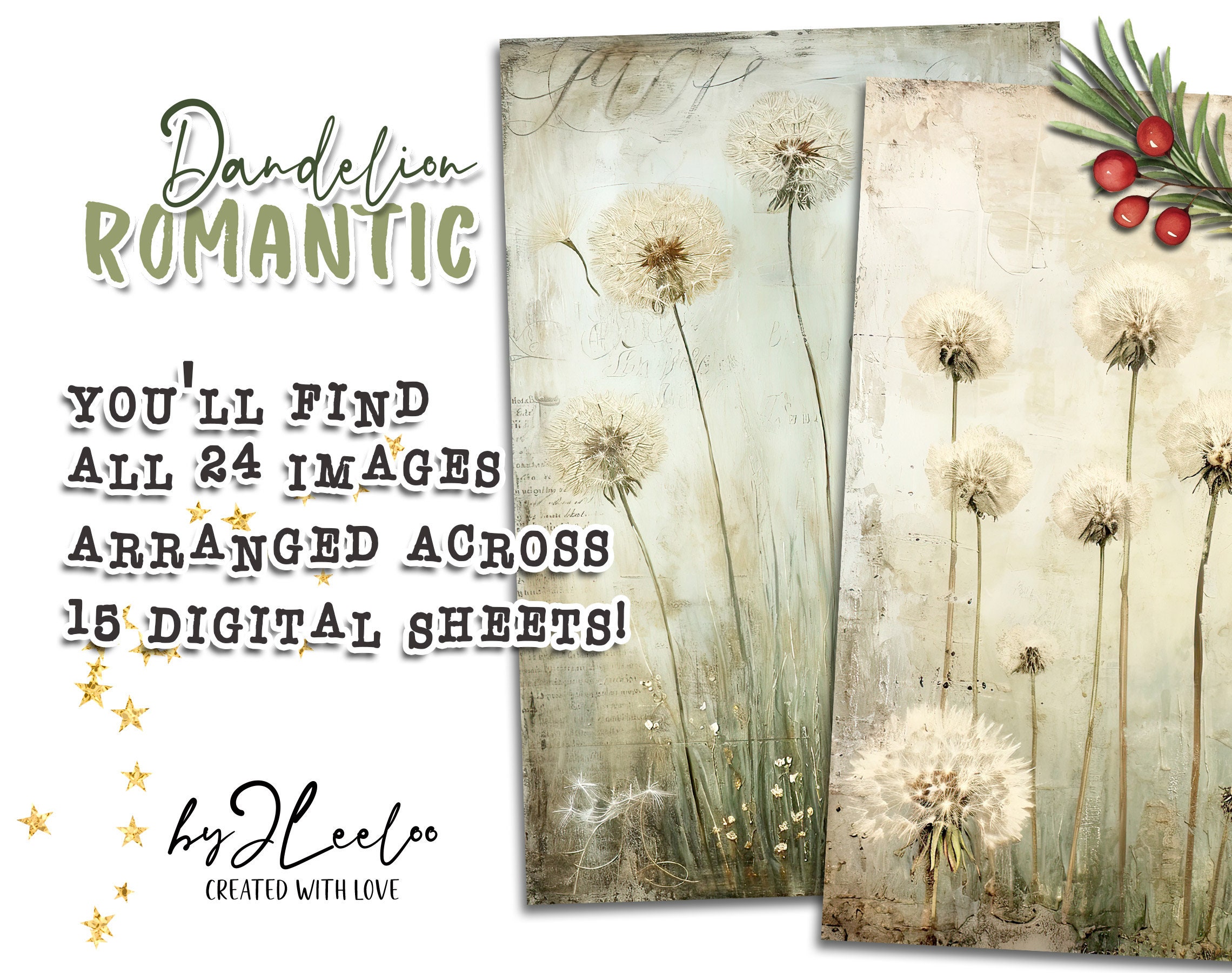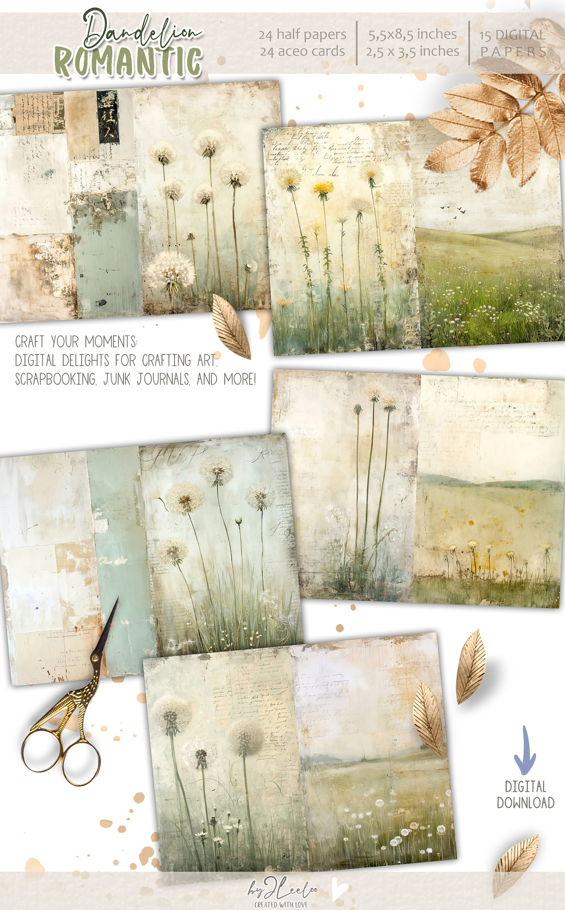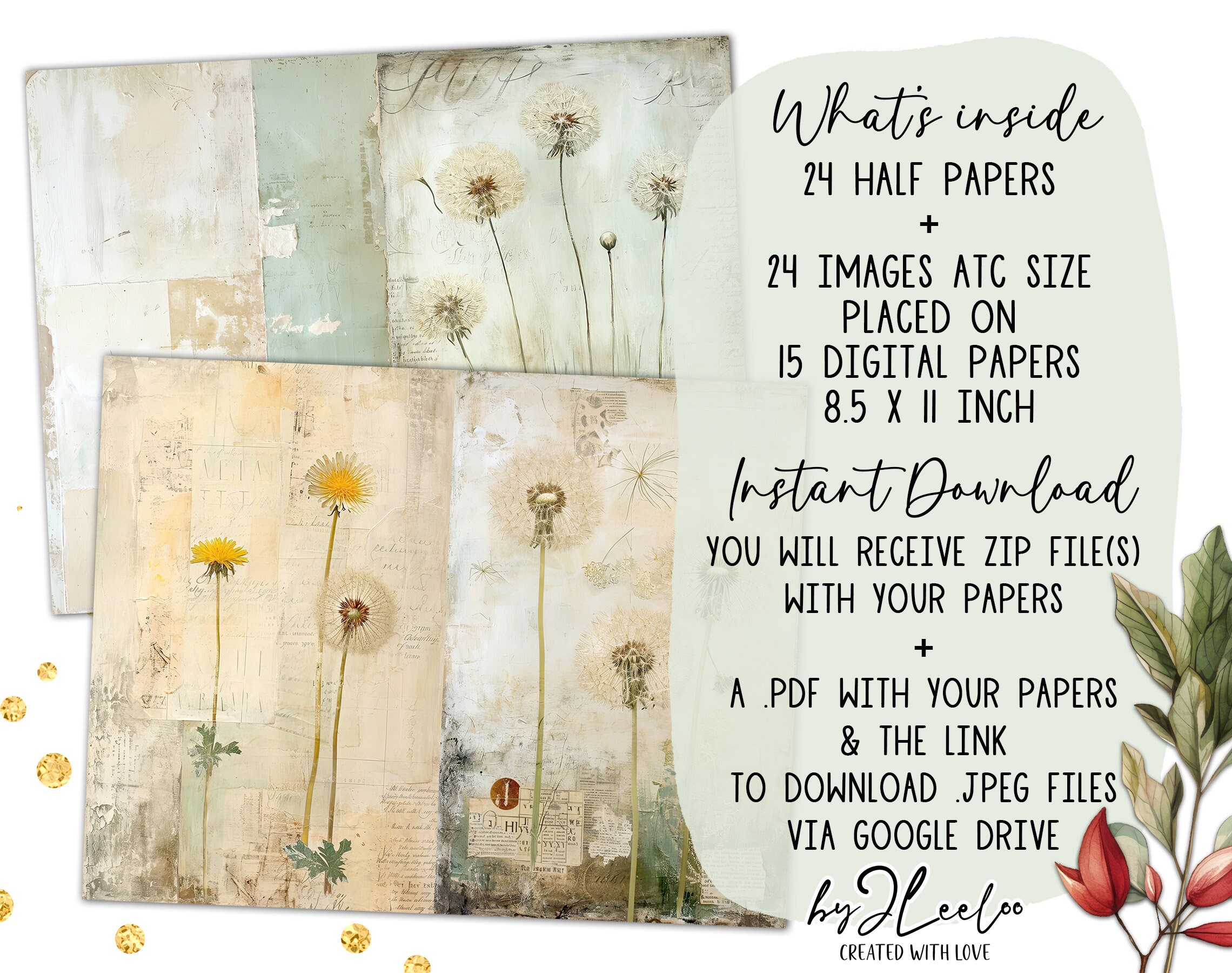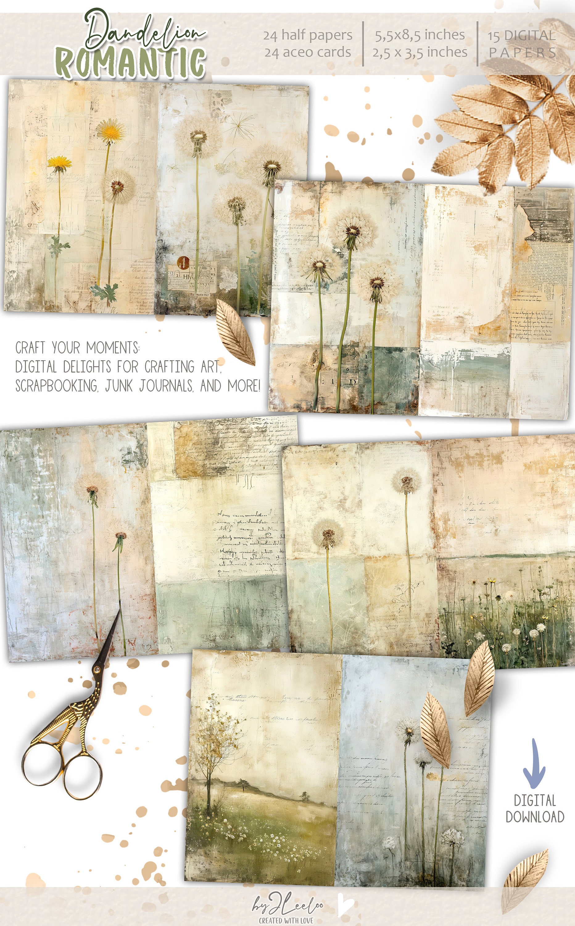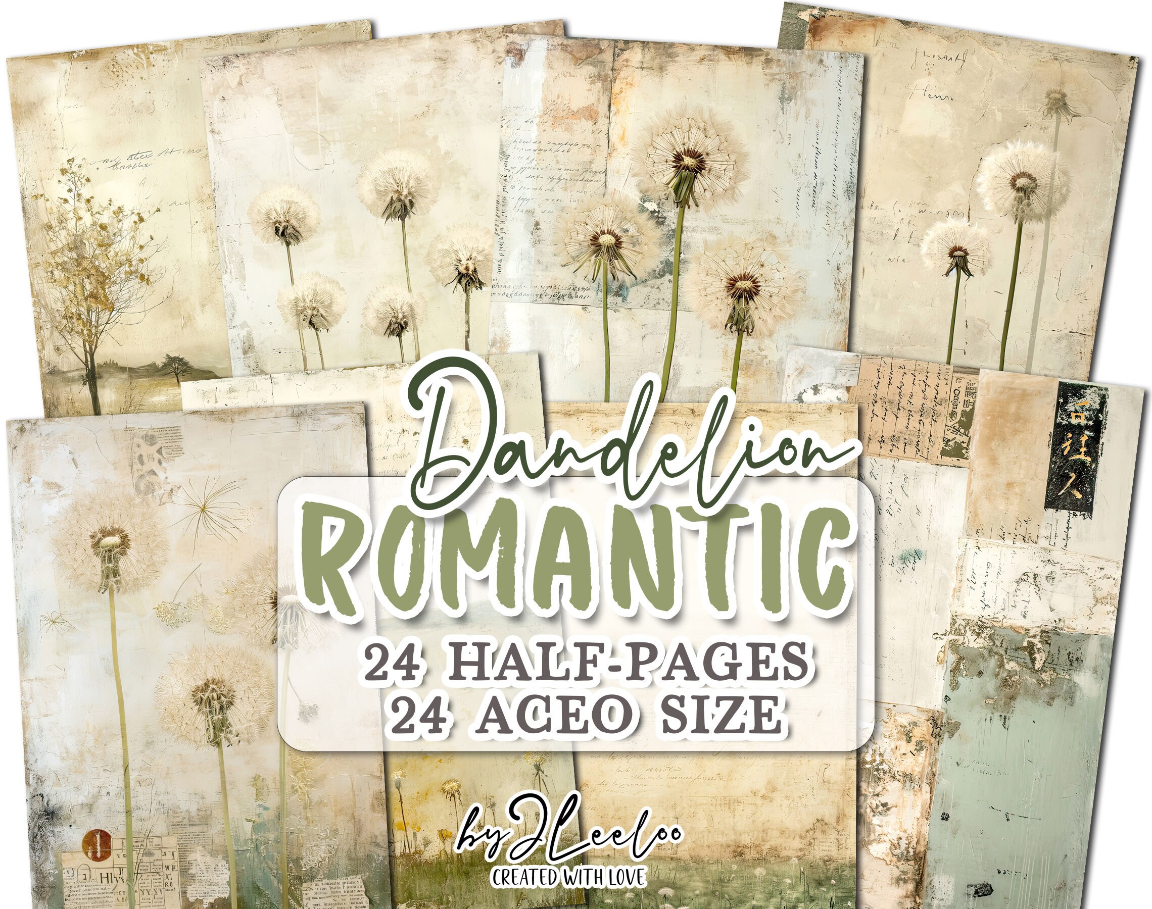 ROMANTIC DANDELION half pages printable | Botanical junk journal Mixed Media supplies | Distressed french paper card collage diary | pp713