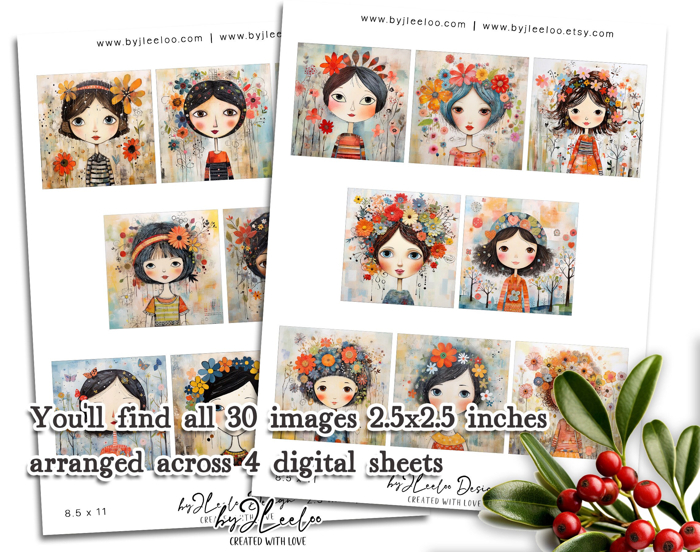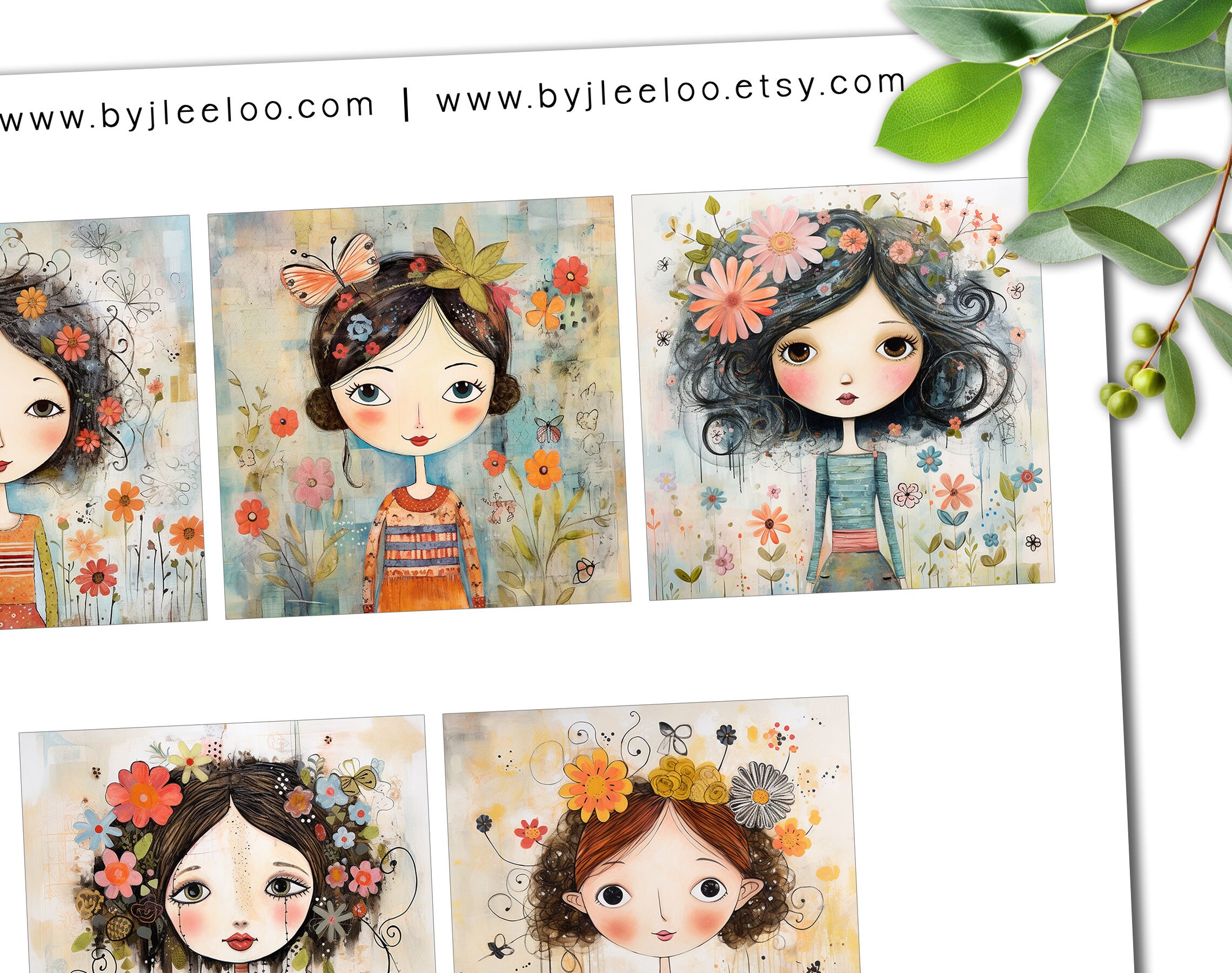 โพ 30 delightful square illustrations featuring adorable springtime girls perfect for your craft creations!