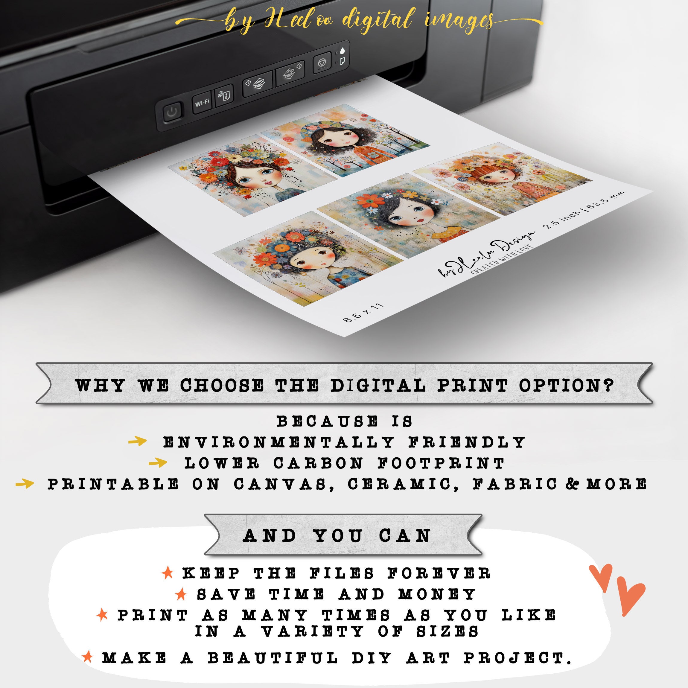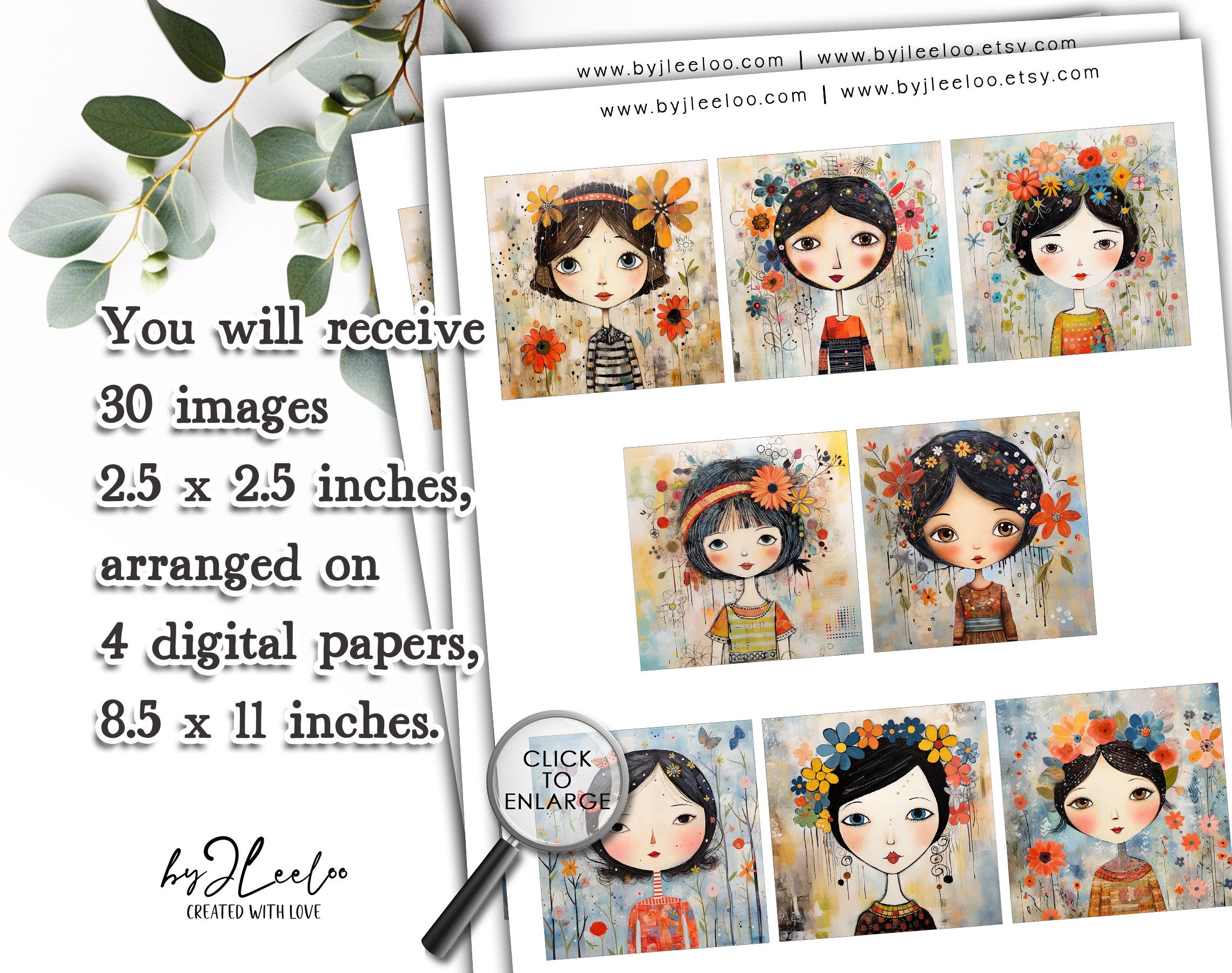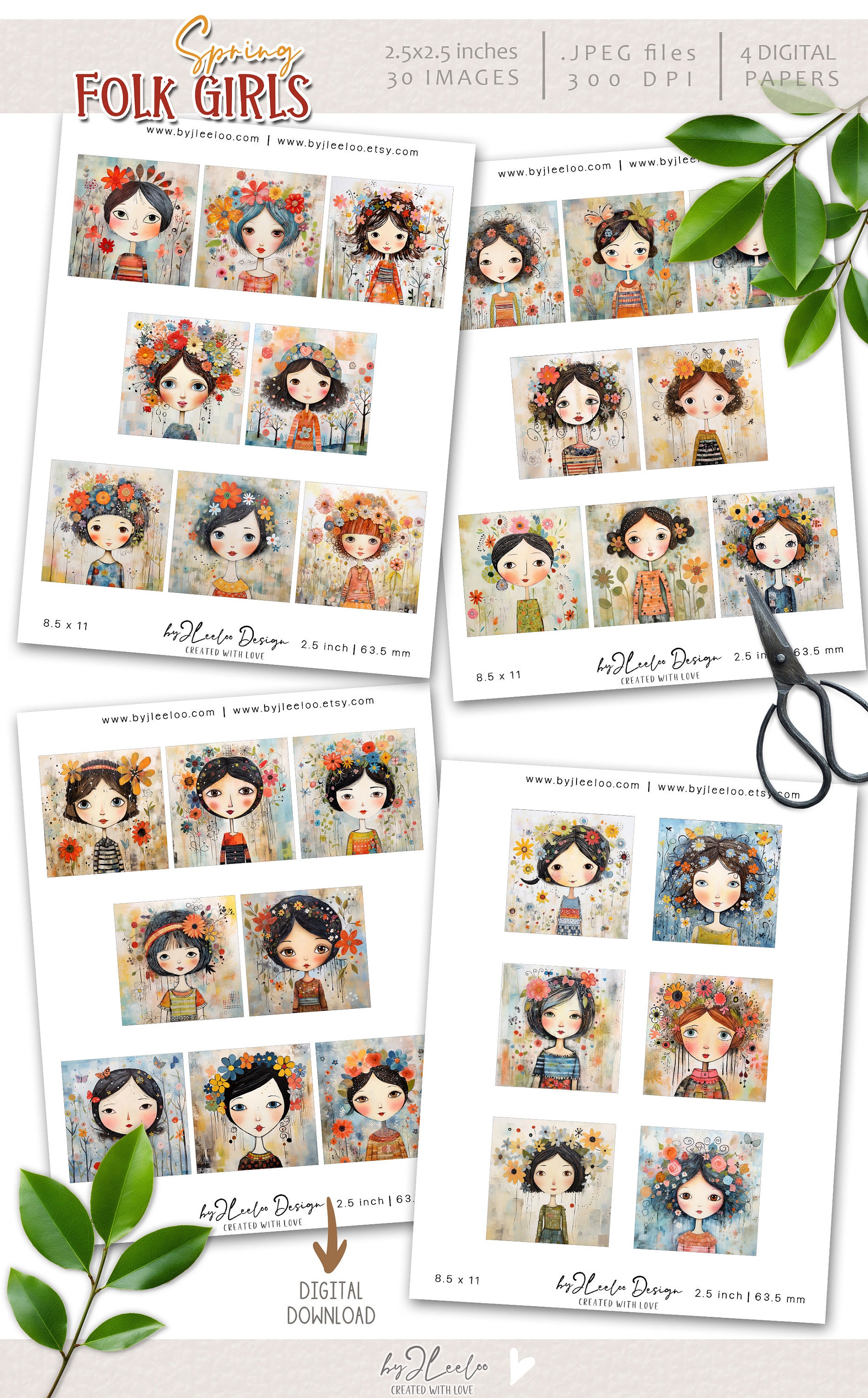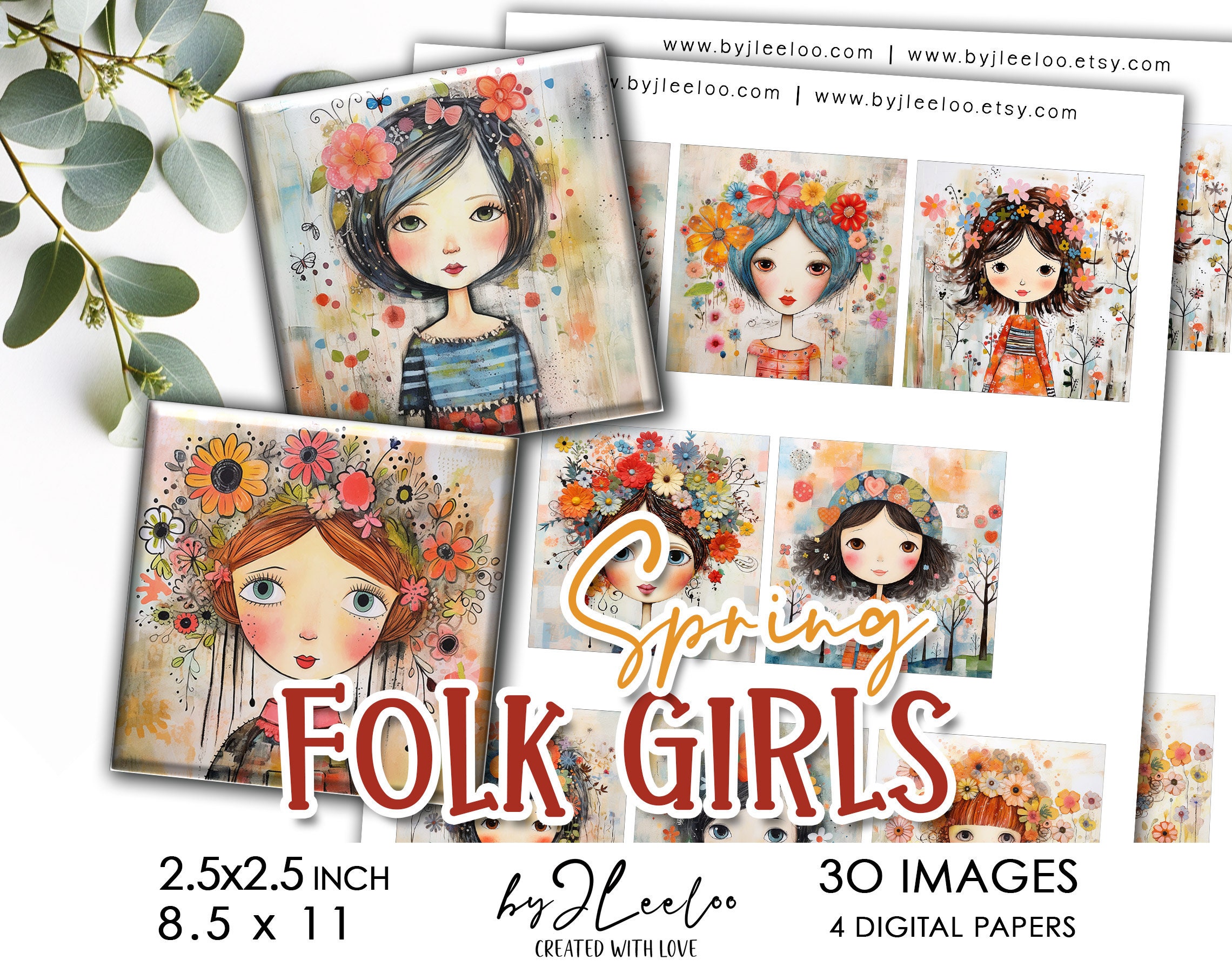 SPRING FOLK girls 2.5 inch square printable craft supplies pendant | Magnets bezel trays glass cabochon mountings cameo bottle caps | qu559