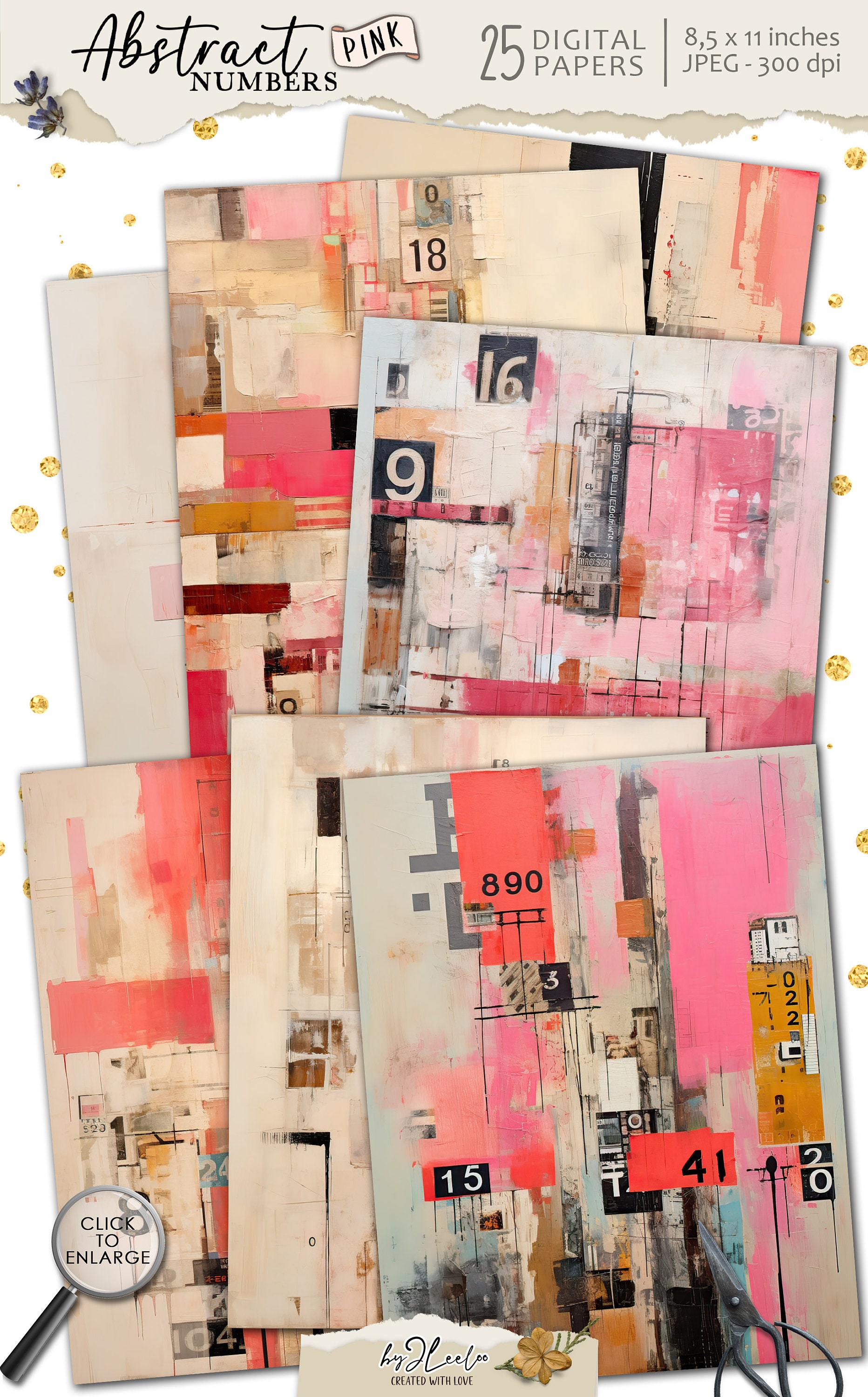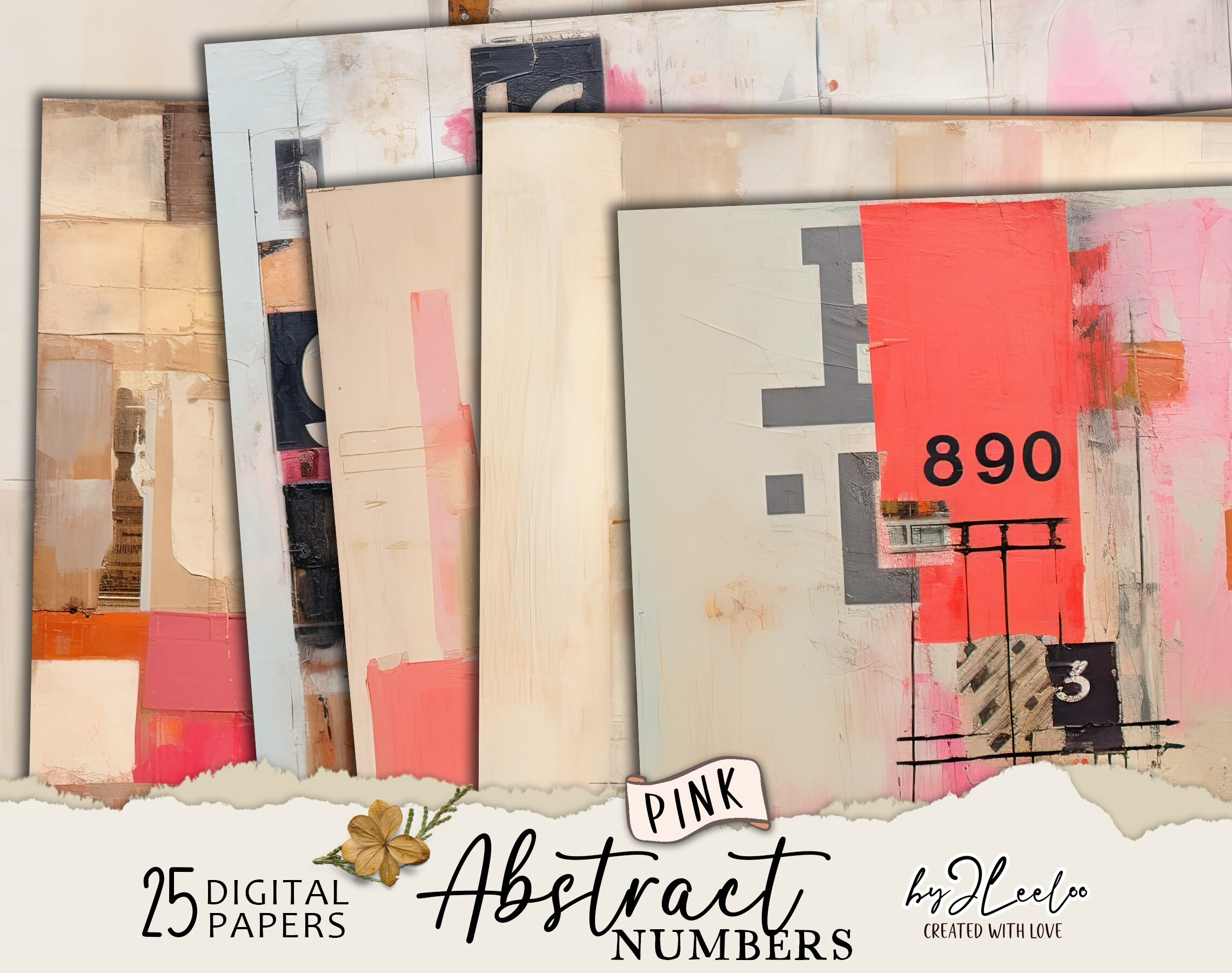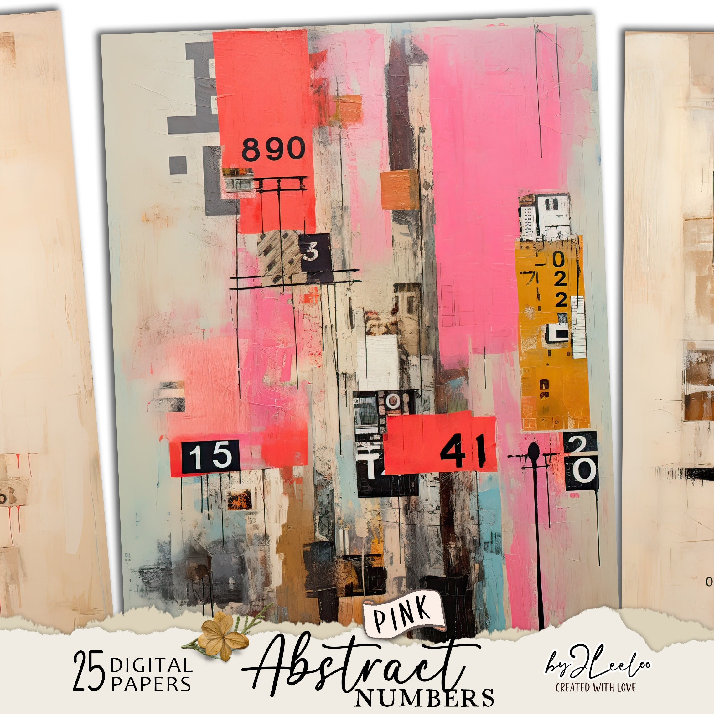 ABSTRACT NUMBERS pink modern background | Paper Junk Journal pages background Distressed grunge card making collage digital ephemera | pp691