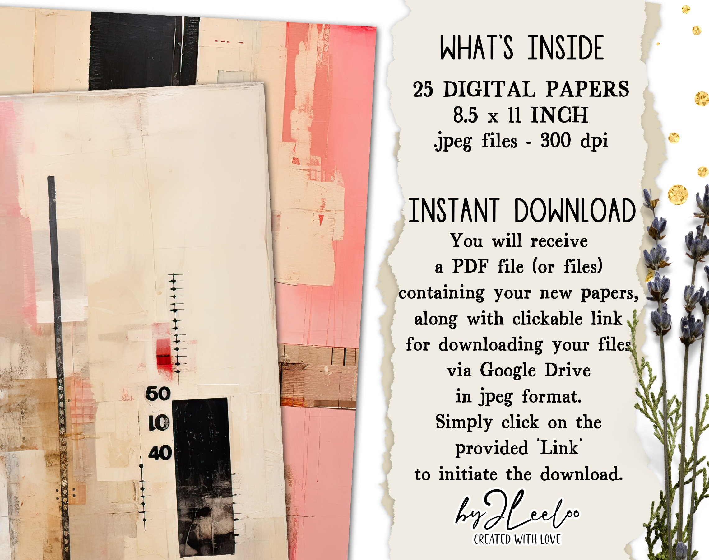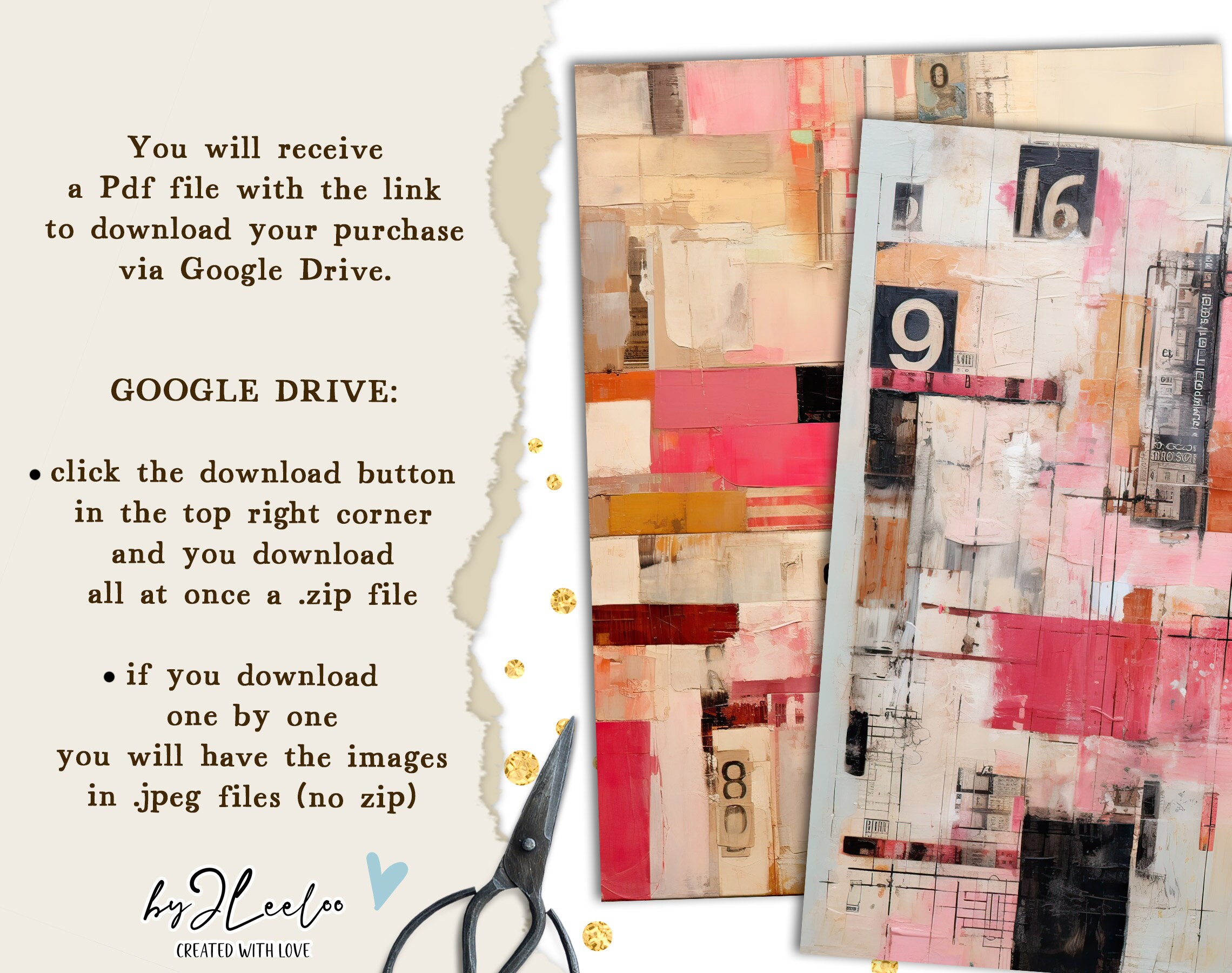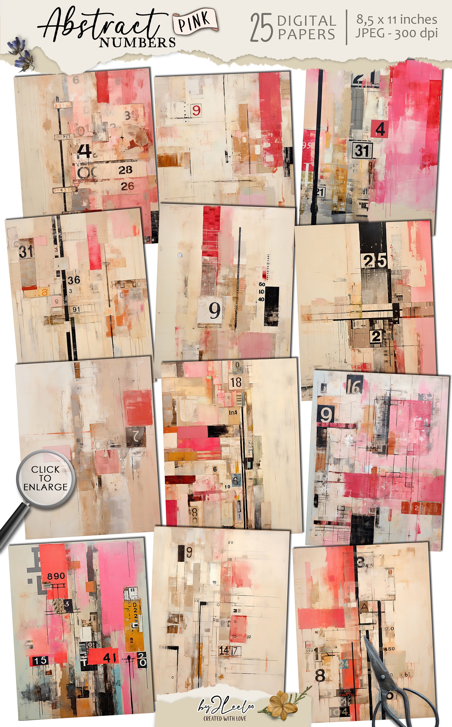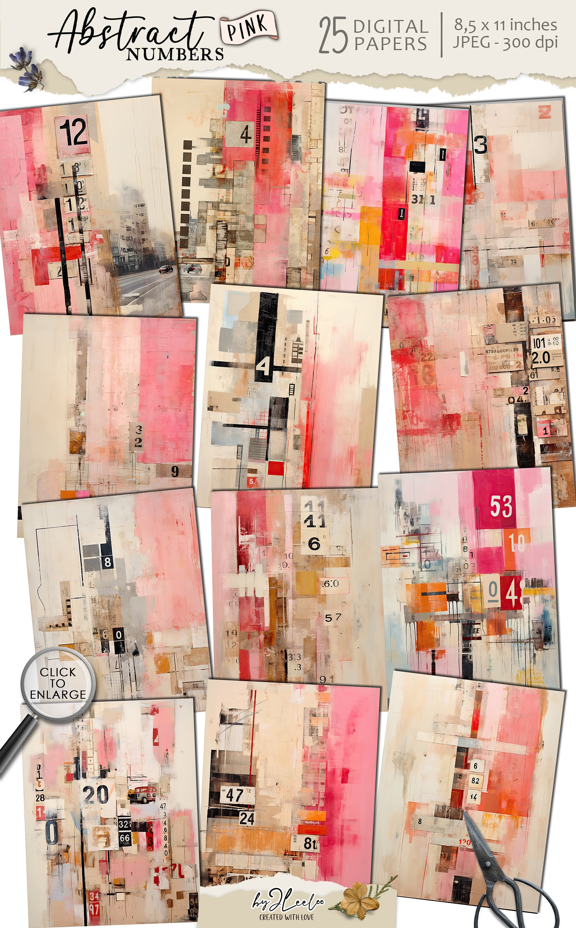 ABSTRACT NUMBERS pink modern background | Paper Junk Journal pages background Distressed grunge card making collage digital ephemera | pp691