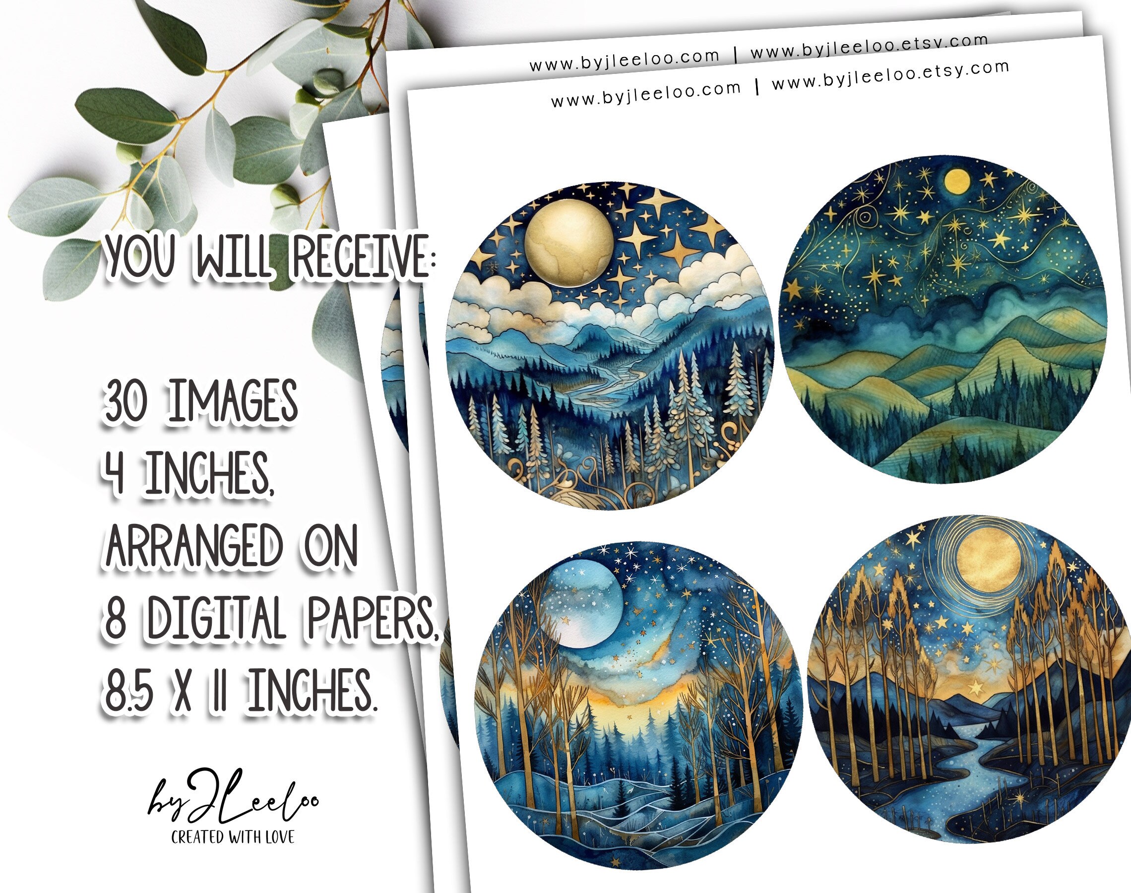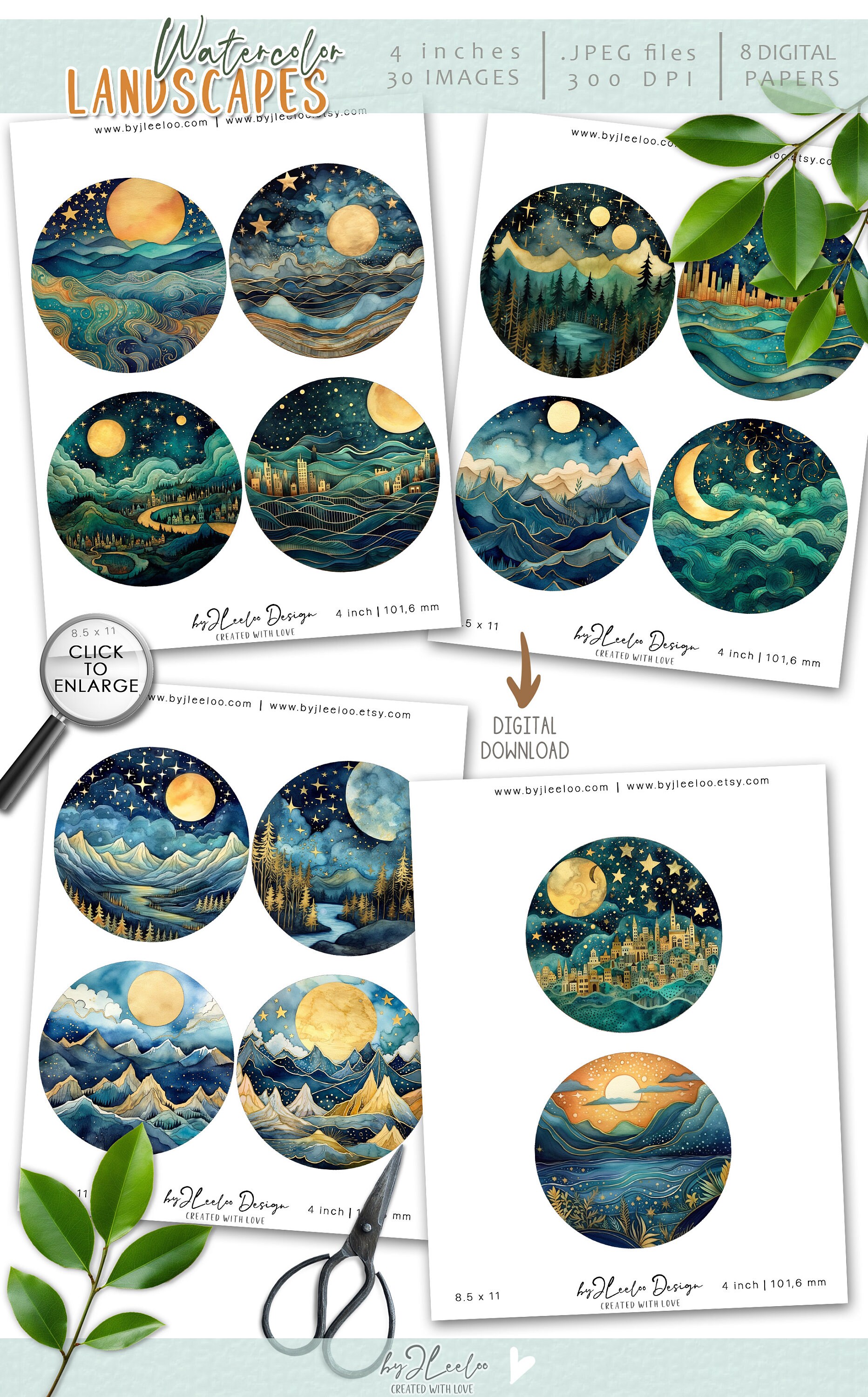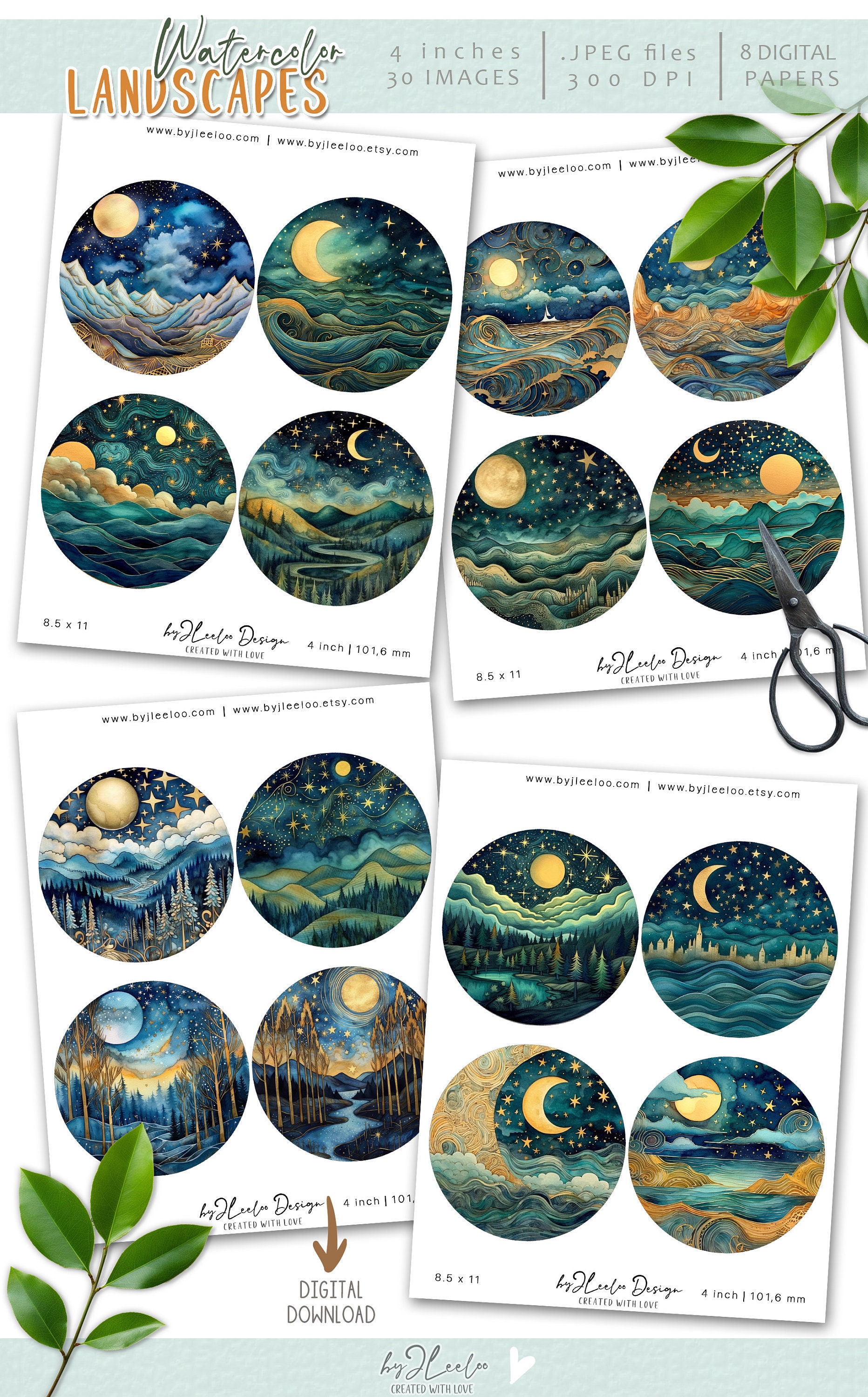 WATERCOLOR LANDSCAPE 4 inch starry circle printable | coaster sticker decoration home badge magnet mirror | graphic digital collage | tn727