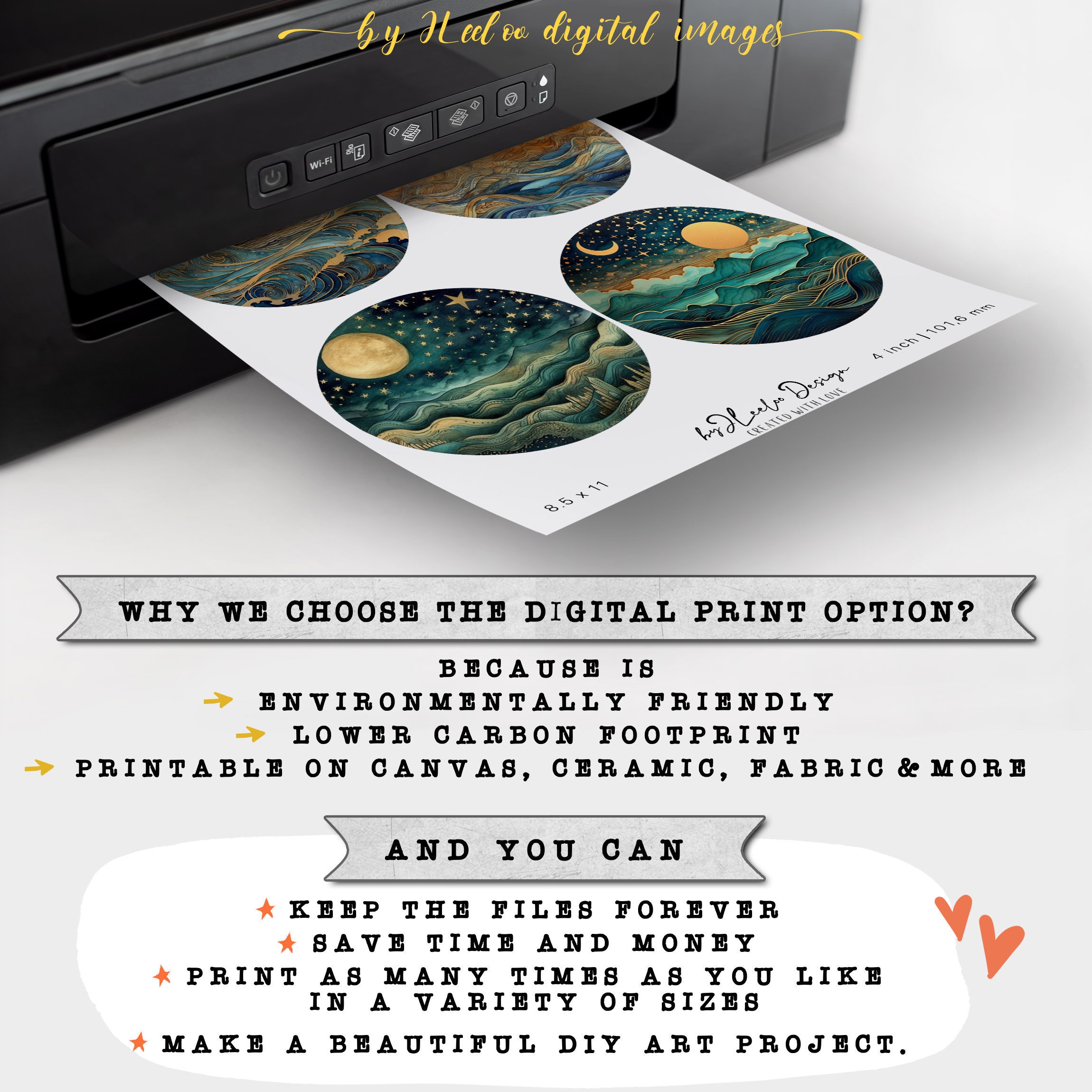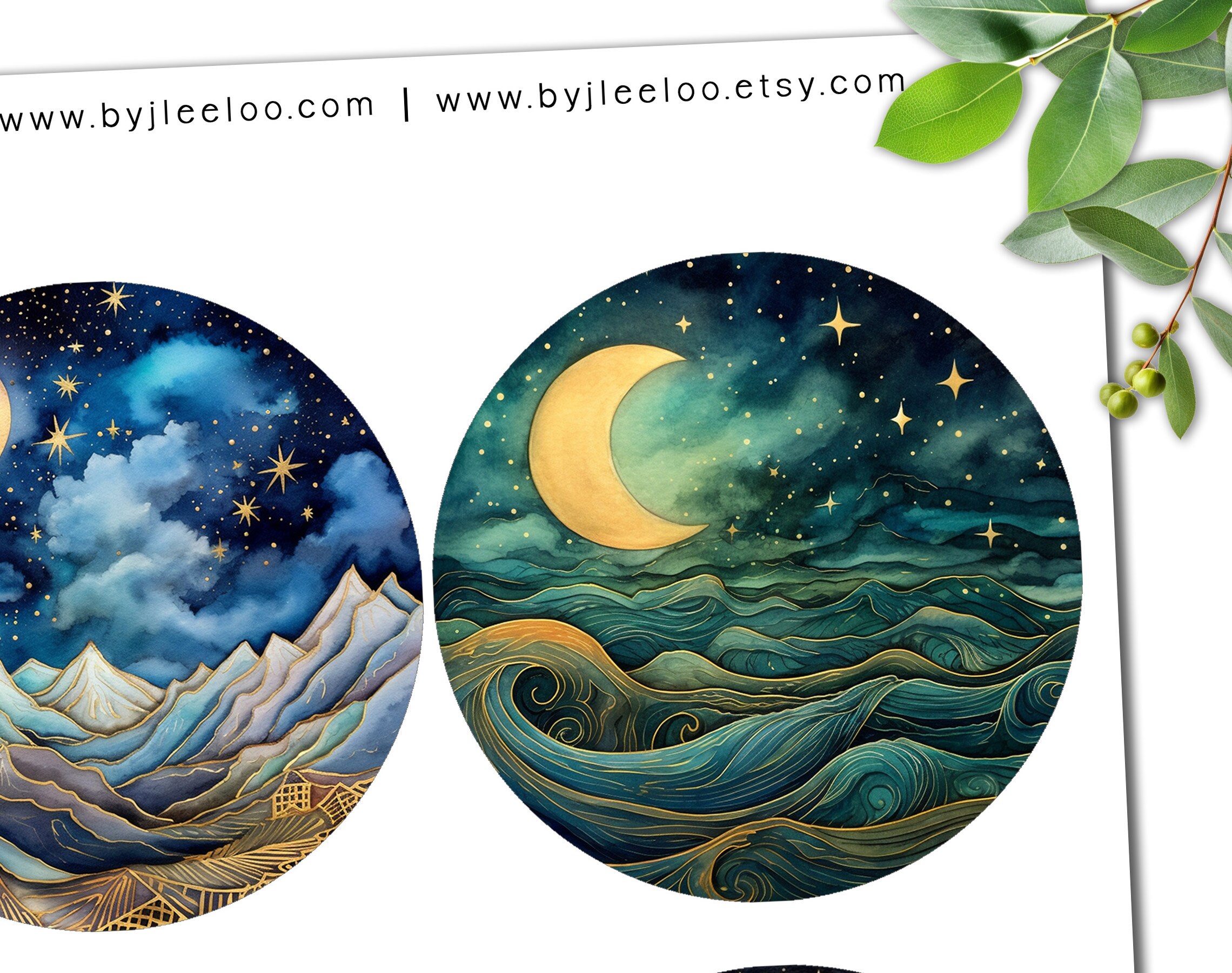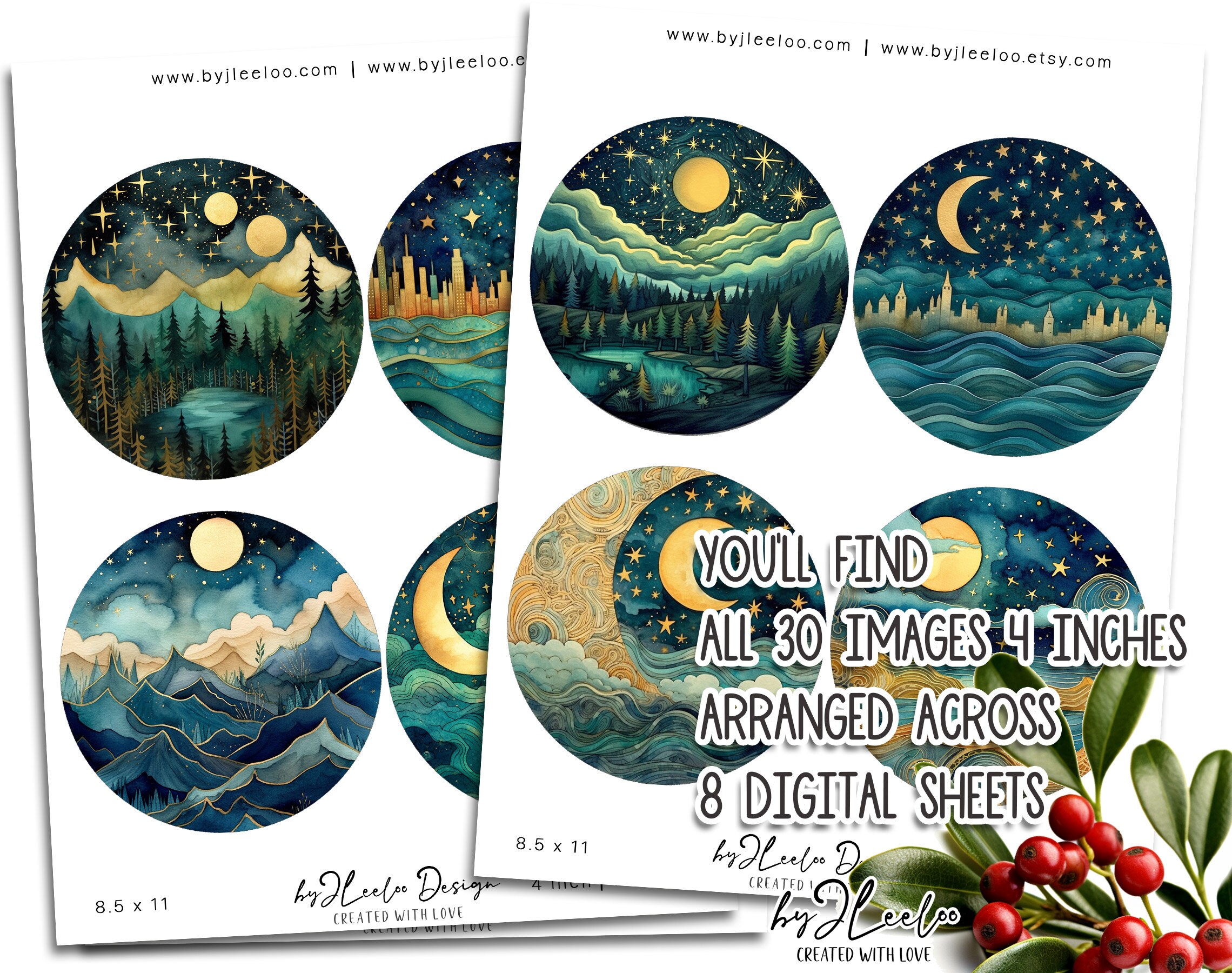 WATERCOLOR LANDSCAPE 4 inch starry circle printable | coaster sticker decoration home badge magnet mirror | graphic digital collage | tn727