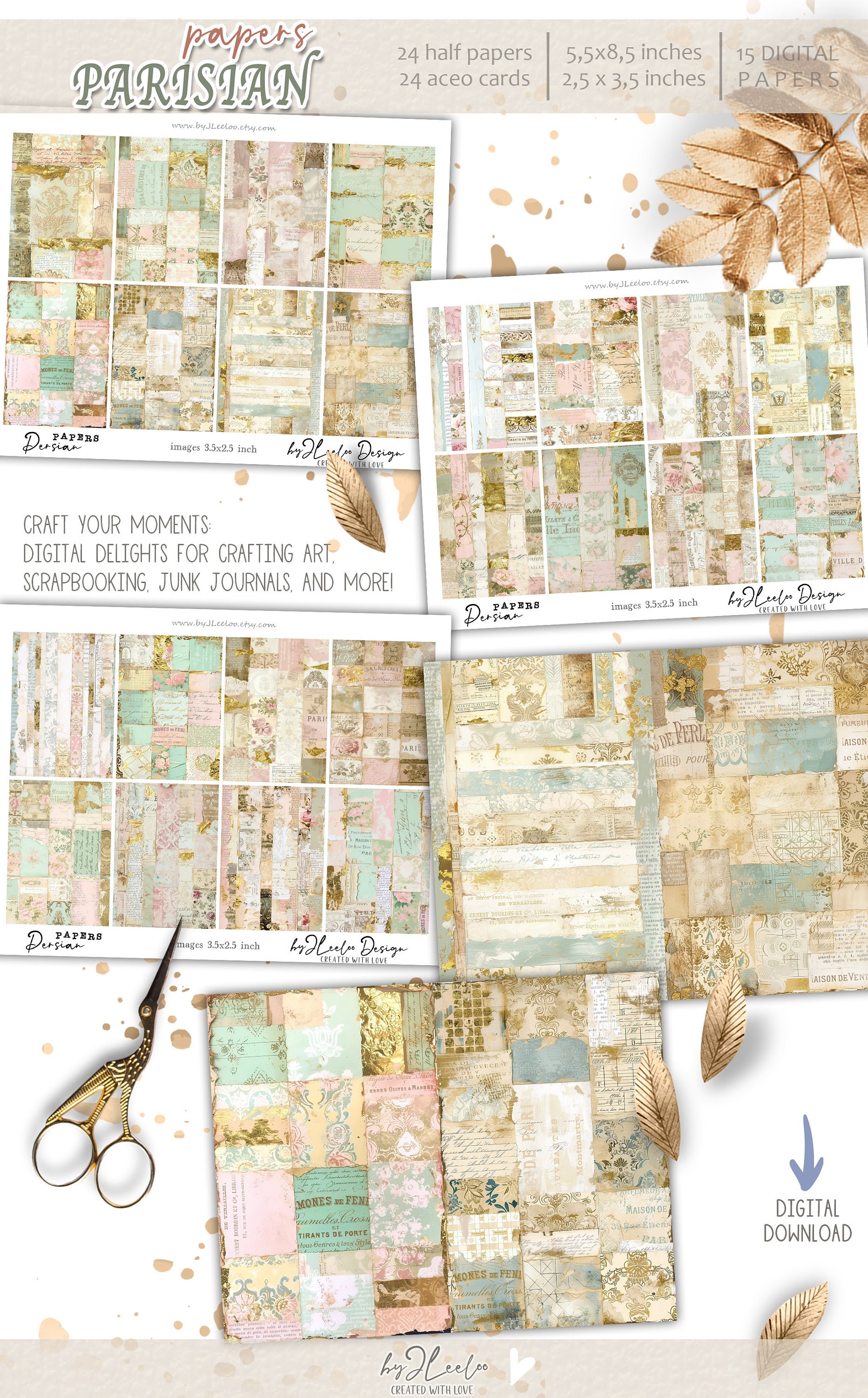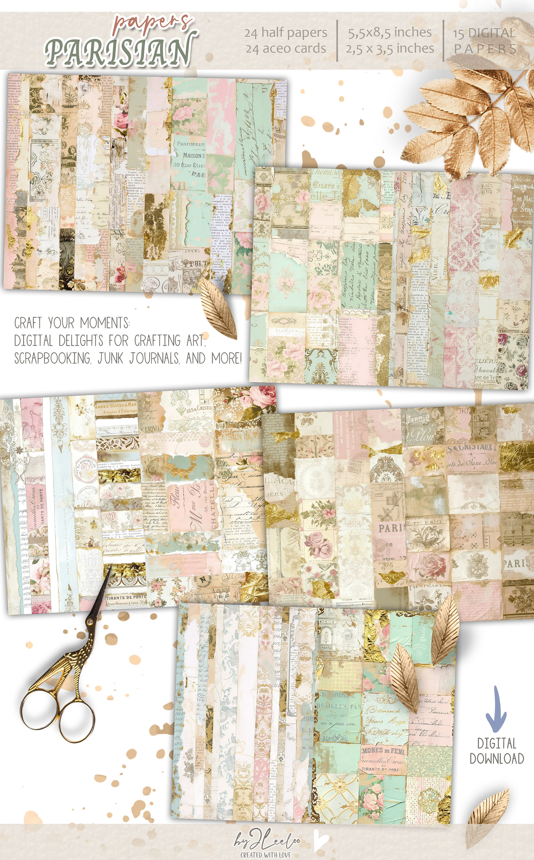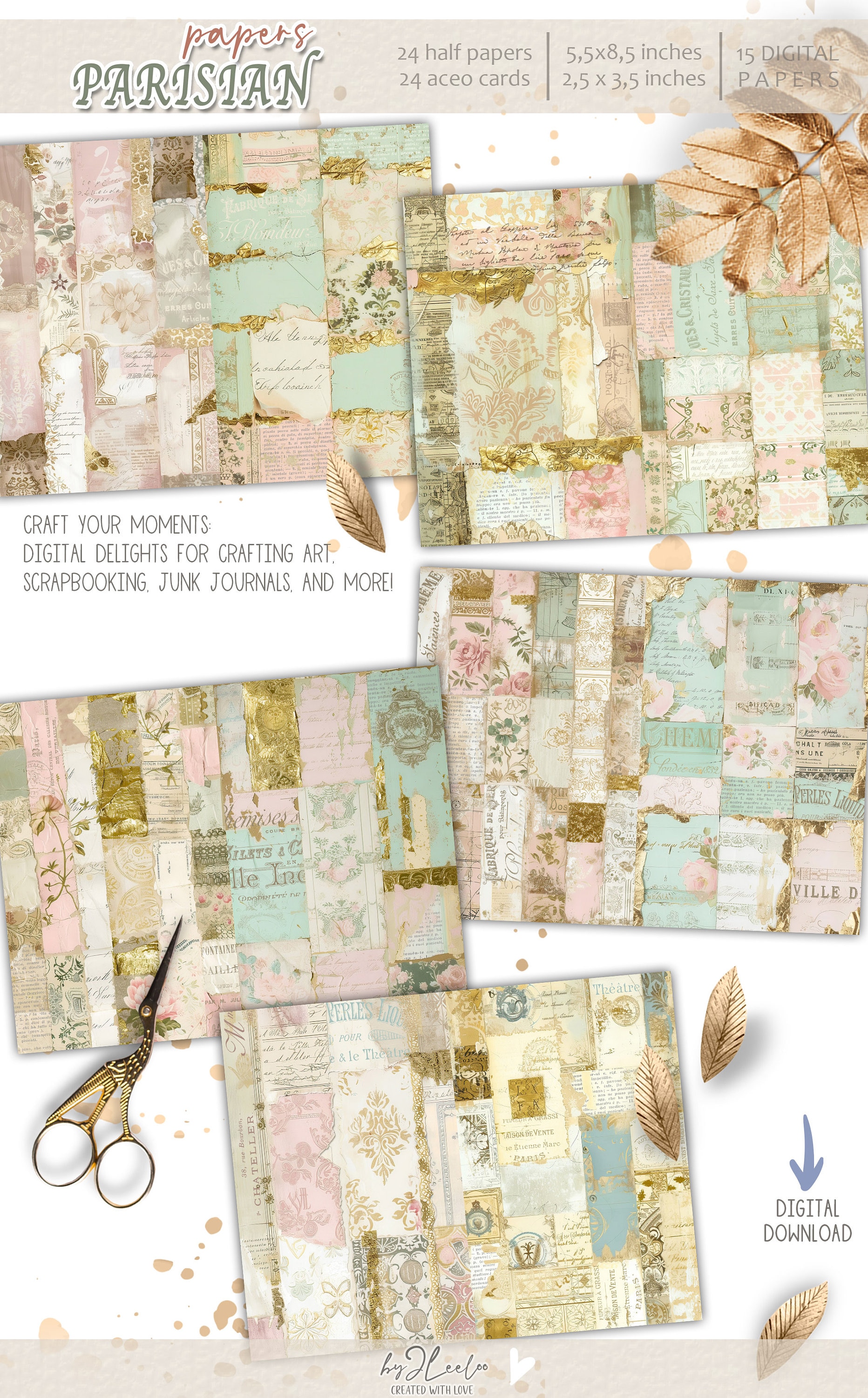 PARISIAN PAPERS half pages printable | French Collage junk journal Mixed Media supplies | Shabby chic gold papers card making DIY diary | pp716