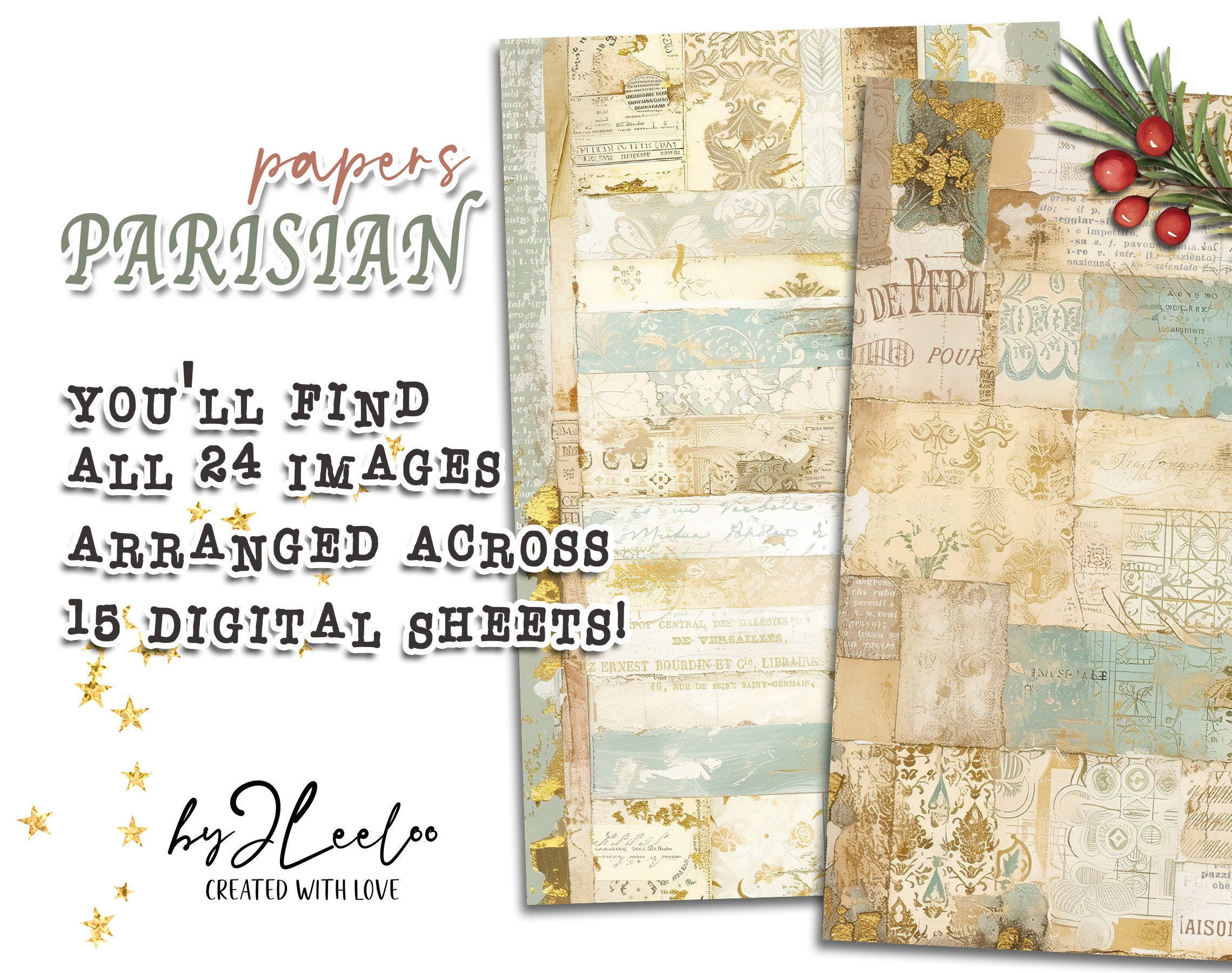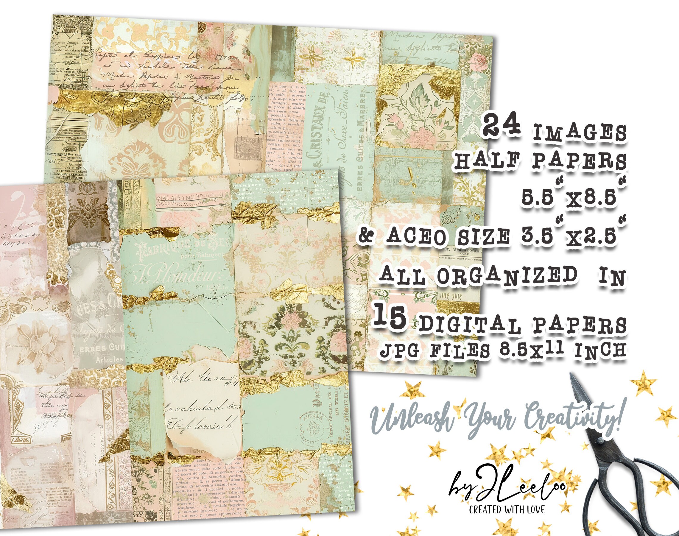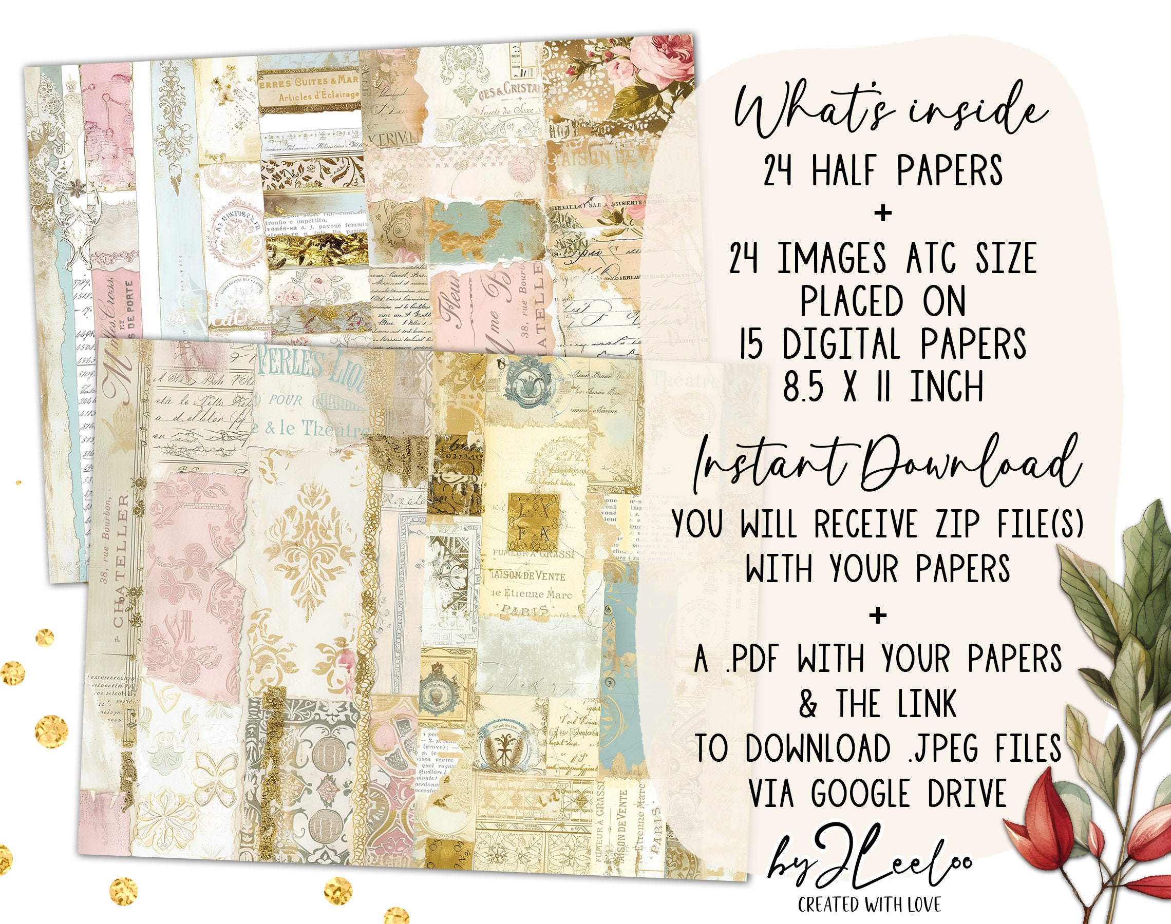 PARISIAN PAPERS half pages printable | French Collage junk journal Mixed Media supplies | Shabby chic gold papers card making DIY diary | pp716
