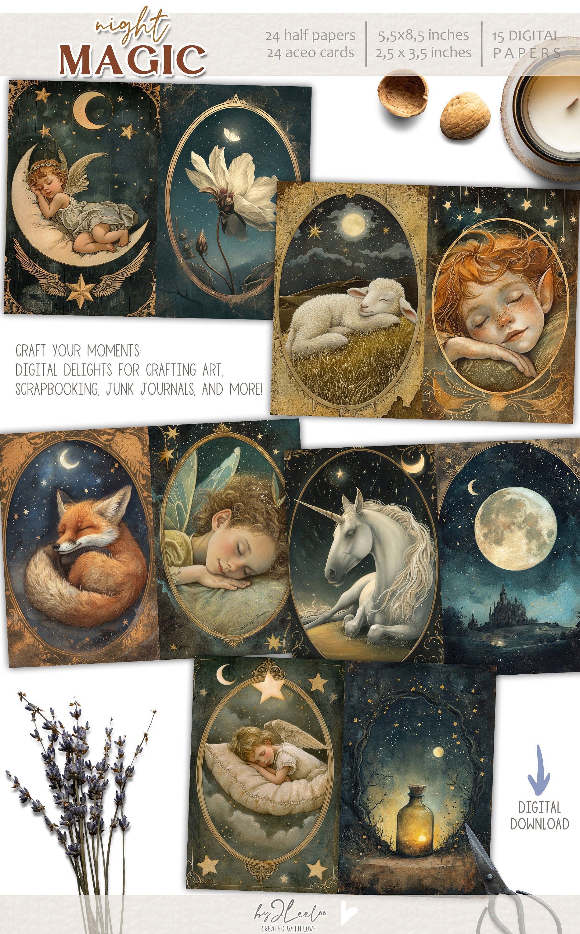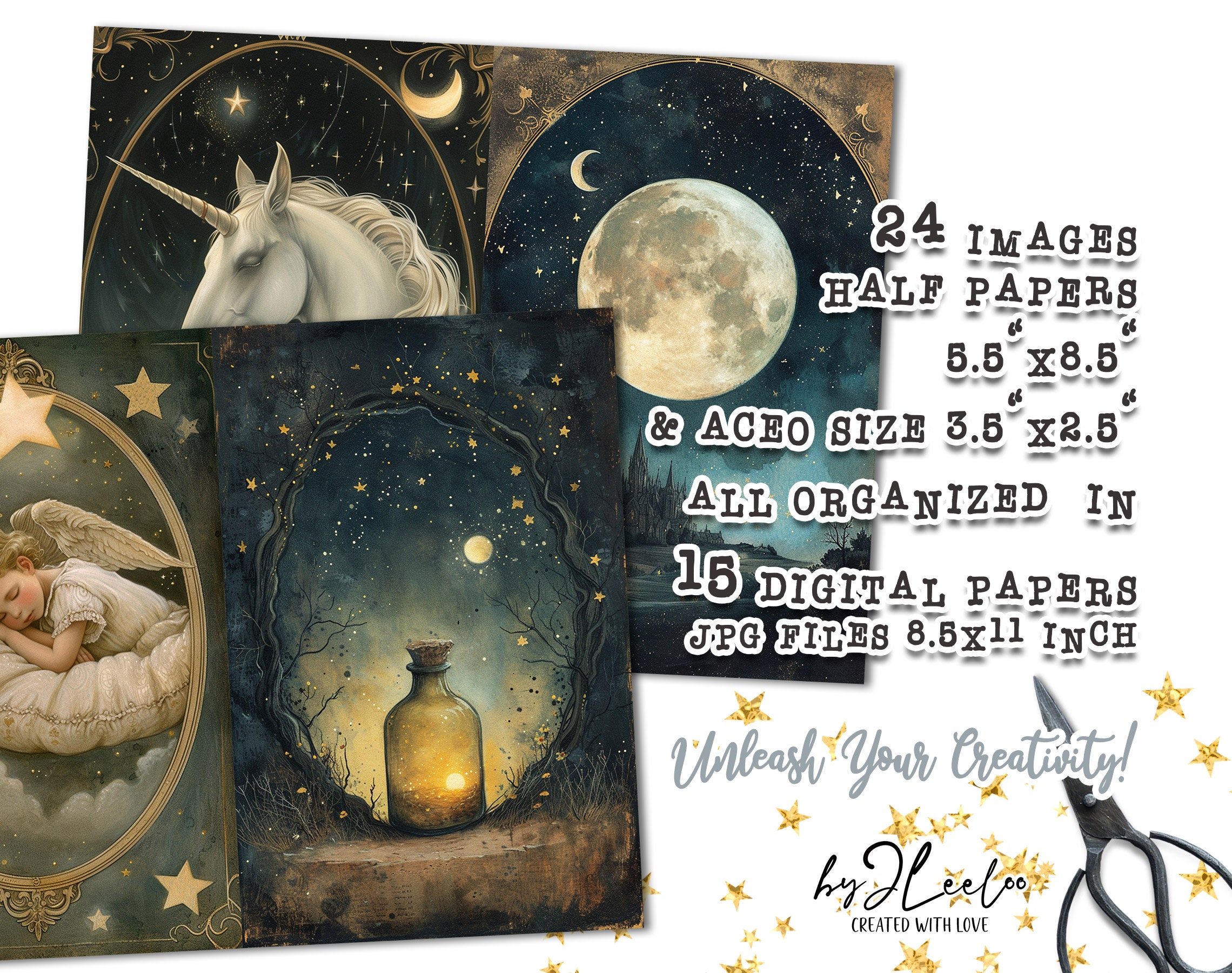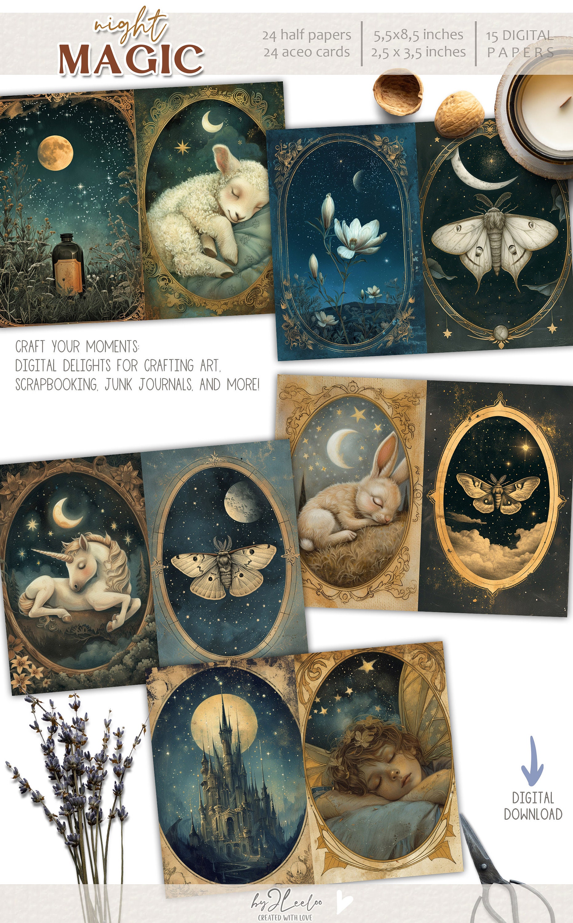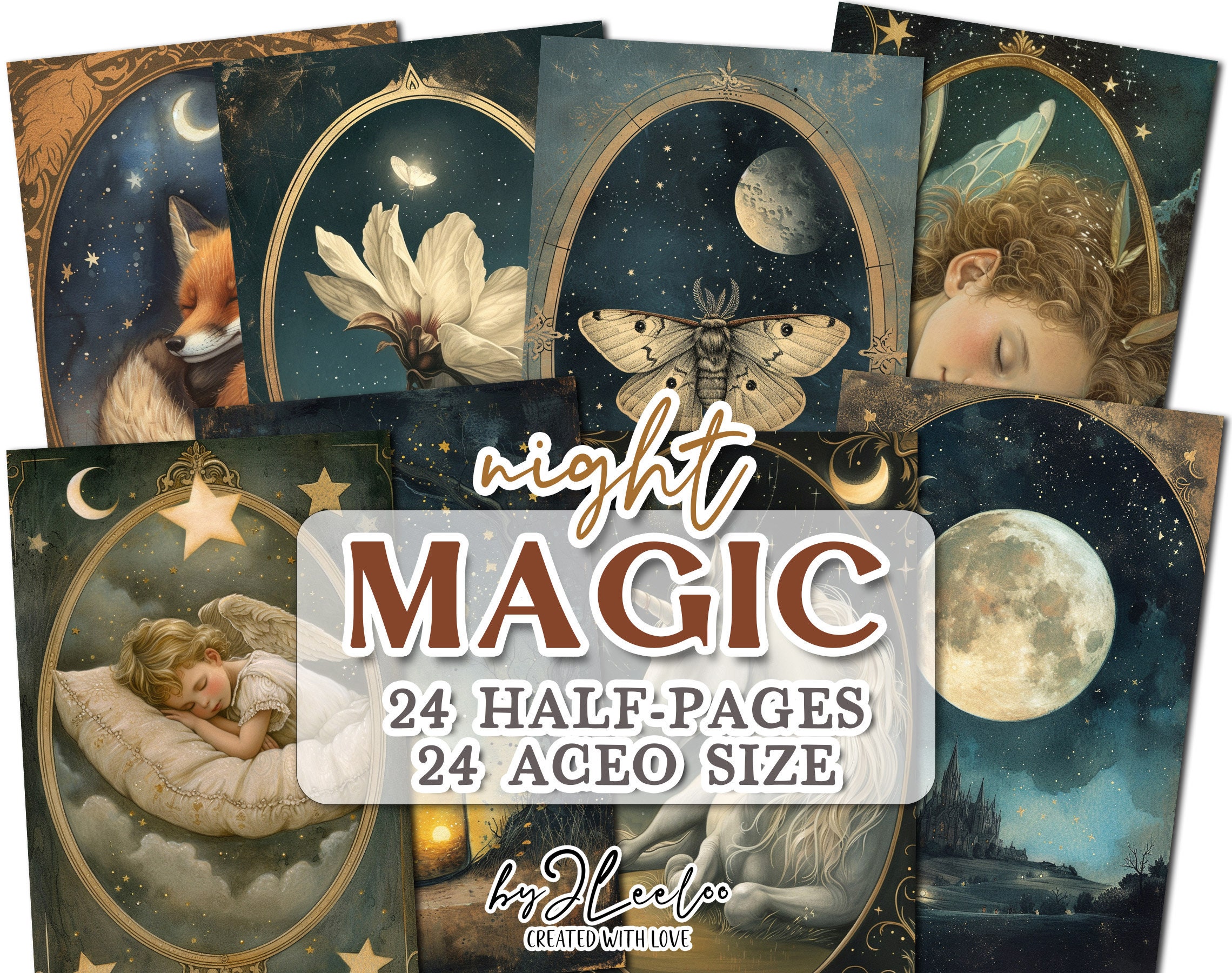 MAGIC NIGHT half pages print for junk journal Mixed Media | Aceo mini book vintage supplies card making collage diary stationery DiY | pp718