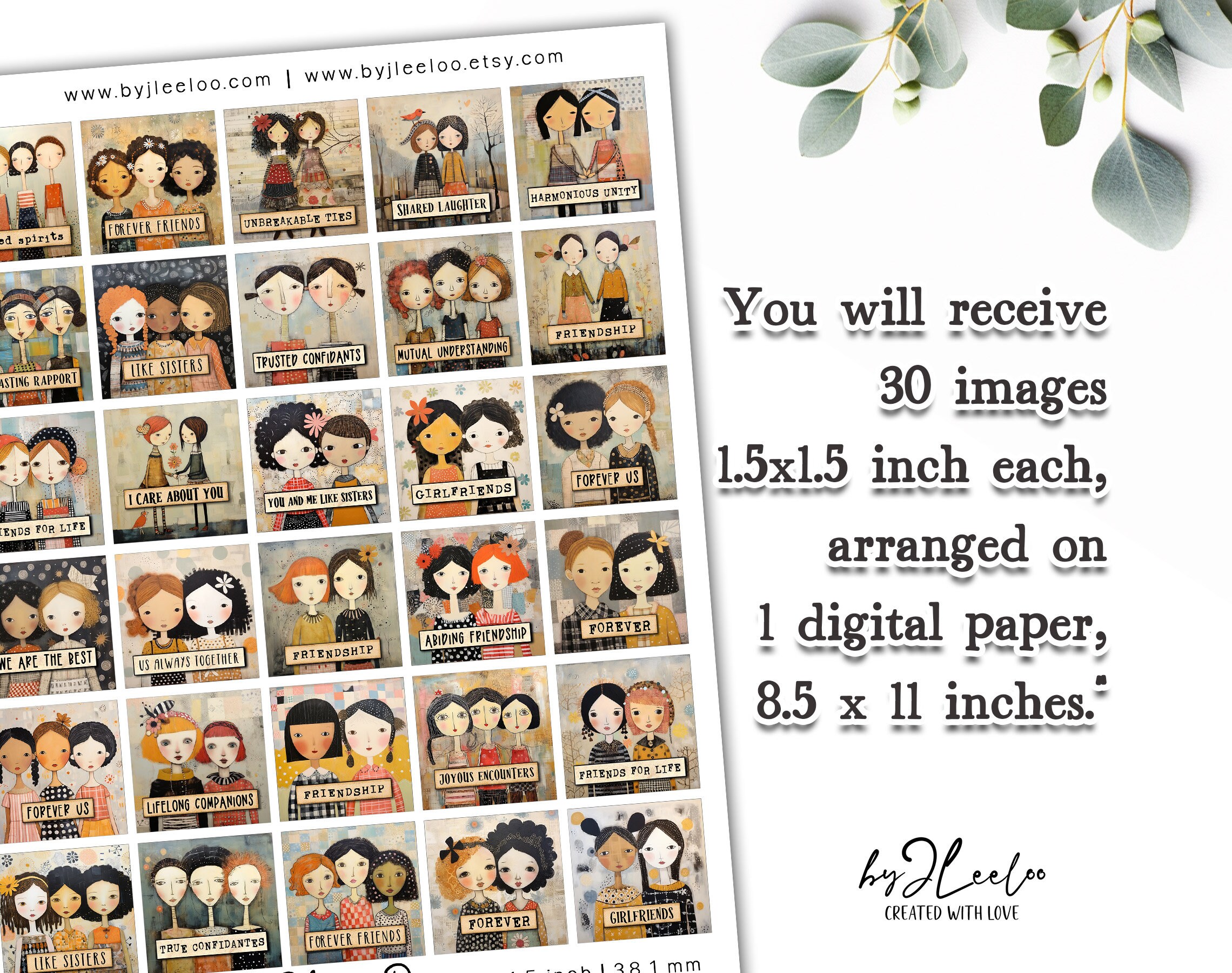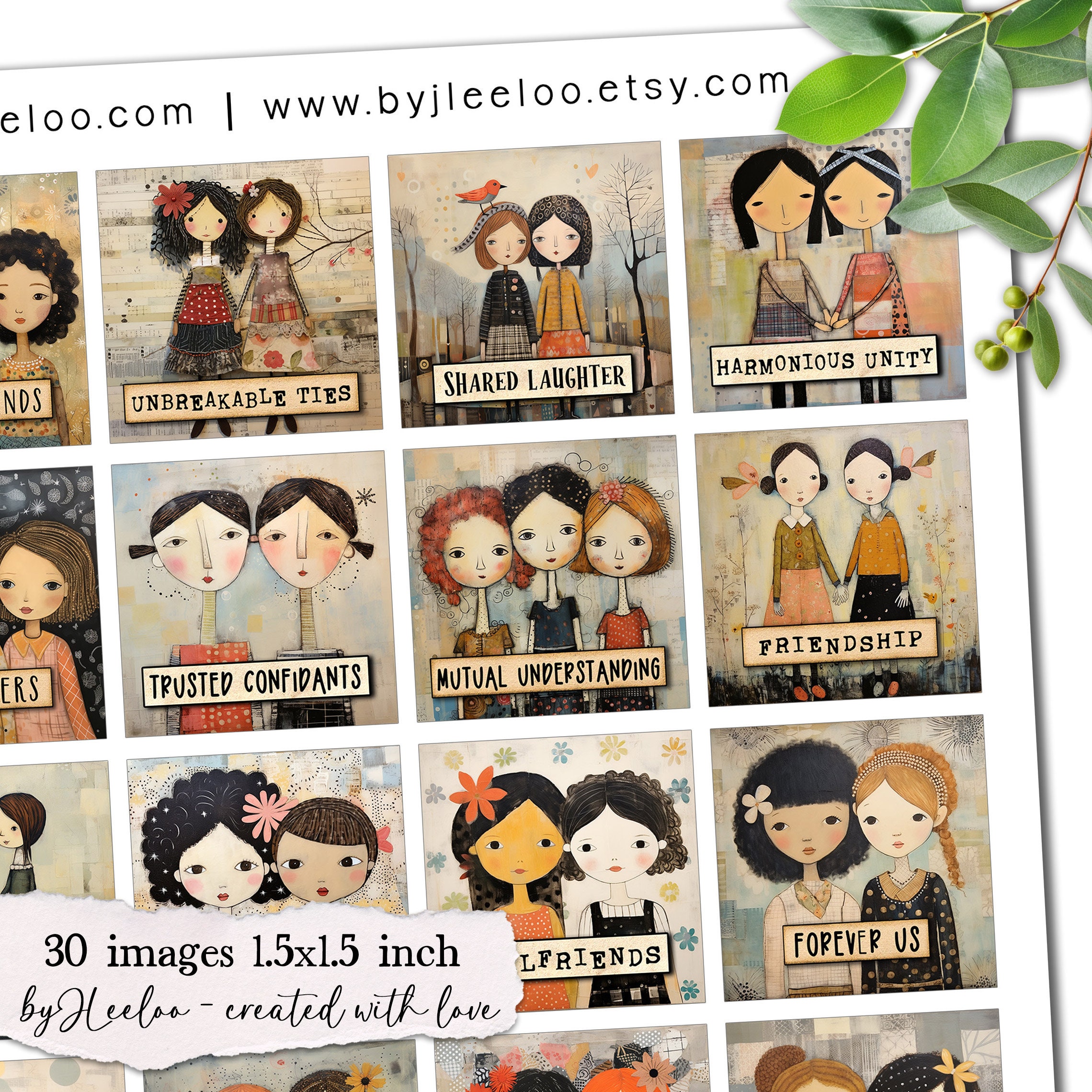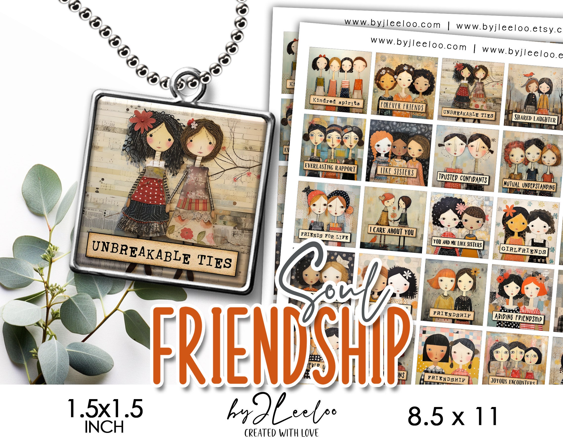 SOUL FRIENDSHIP 1.5x1.5 inch printable illustration | supplies square pendant, charm, gift for friend girlfriend, magnet, altered art |qu581
