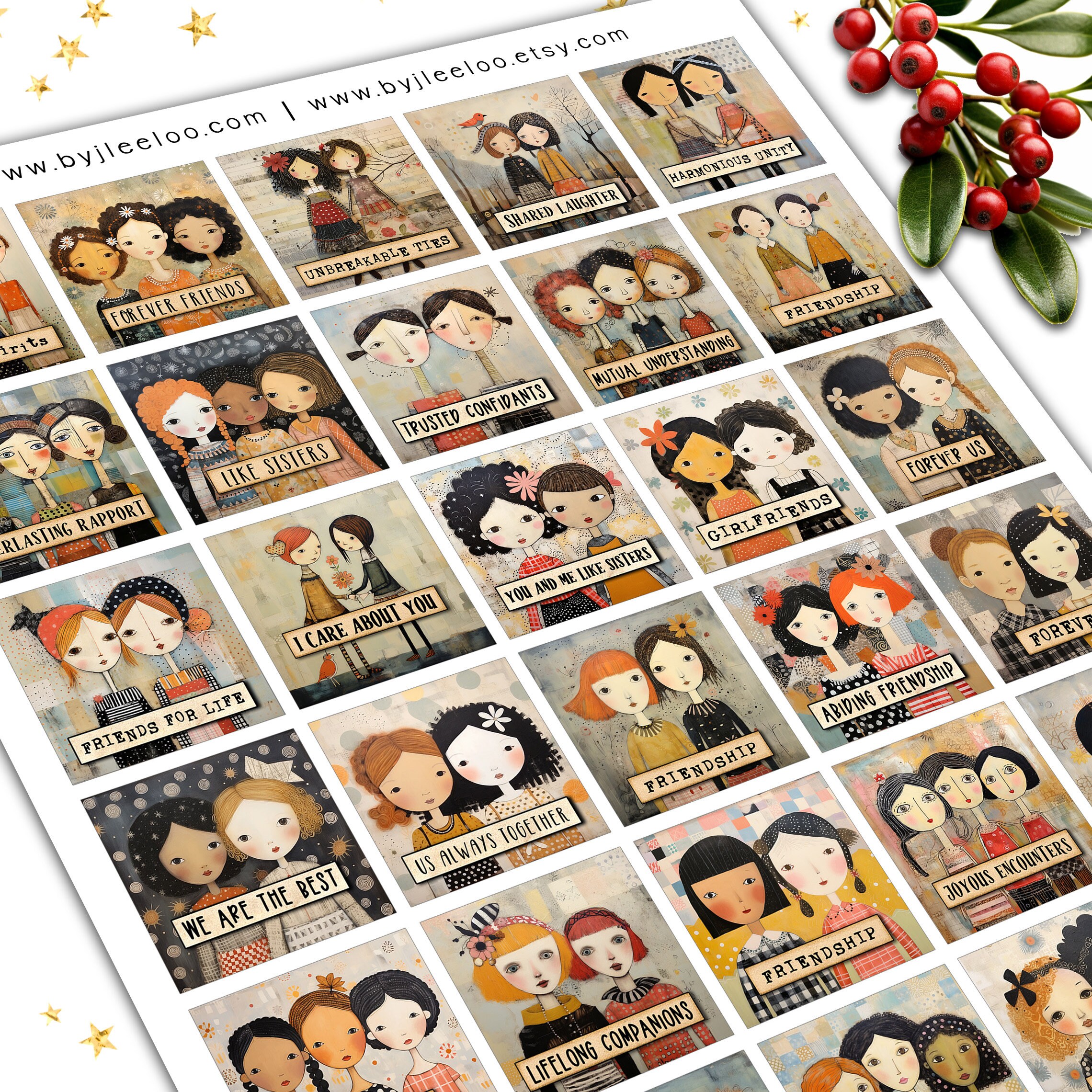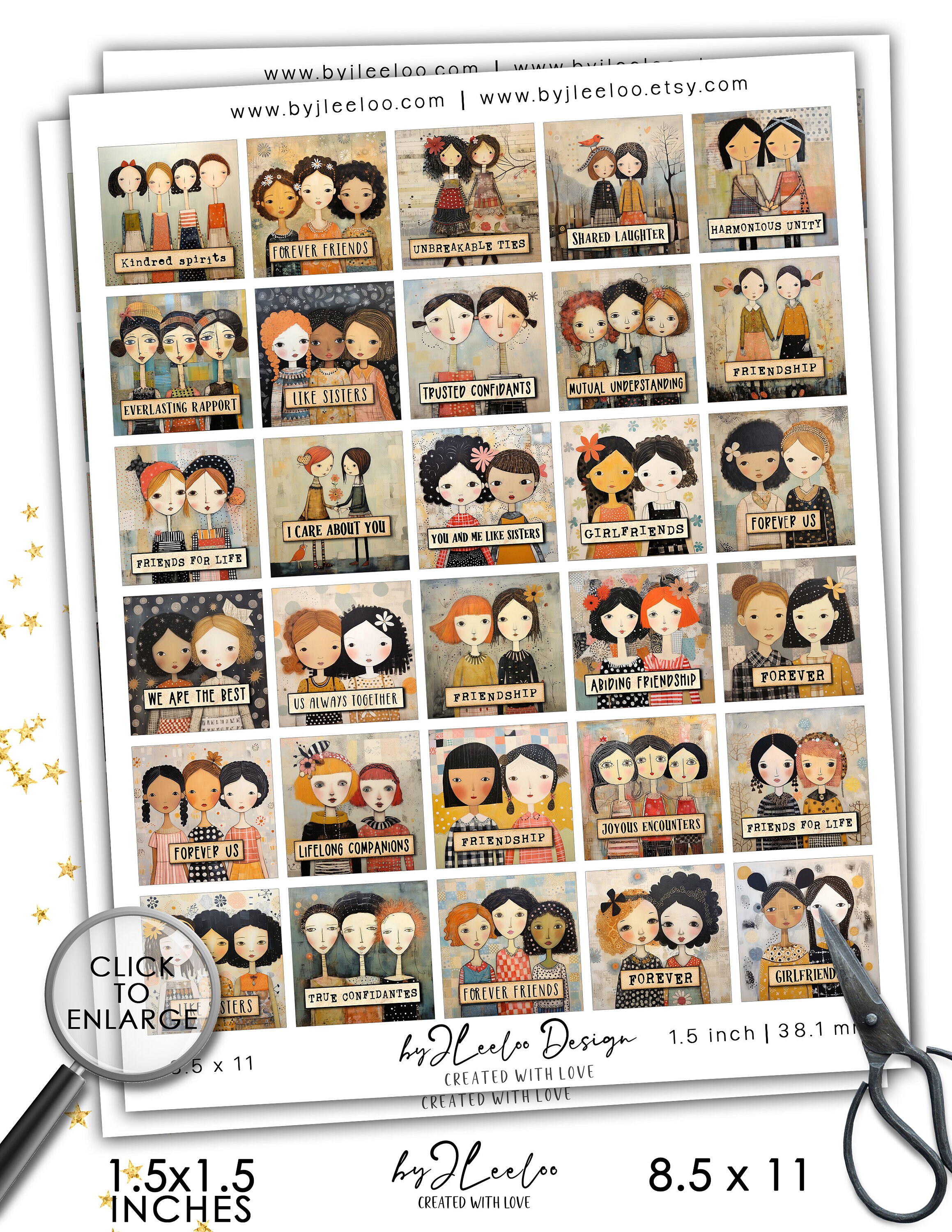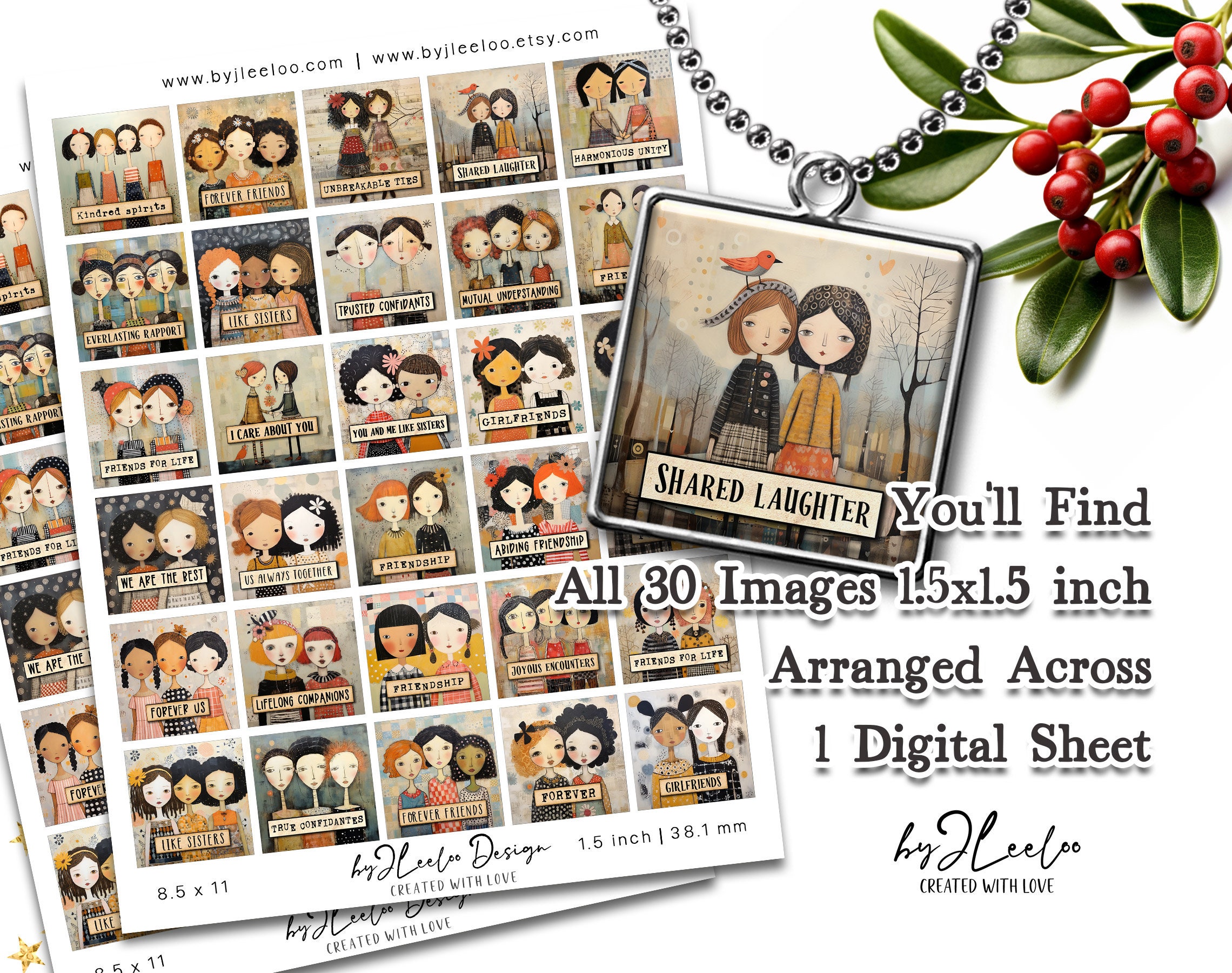 SOUL FRIENDSHIP 1.5x1.5 inch printable illustration | supplies square pendant, charm, gift for friend girlfriend, magnet, altered art |qu581