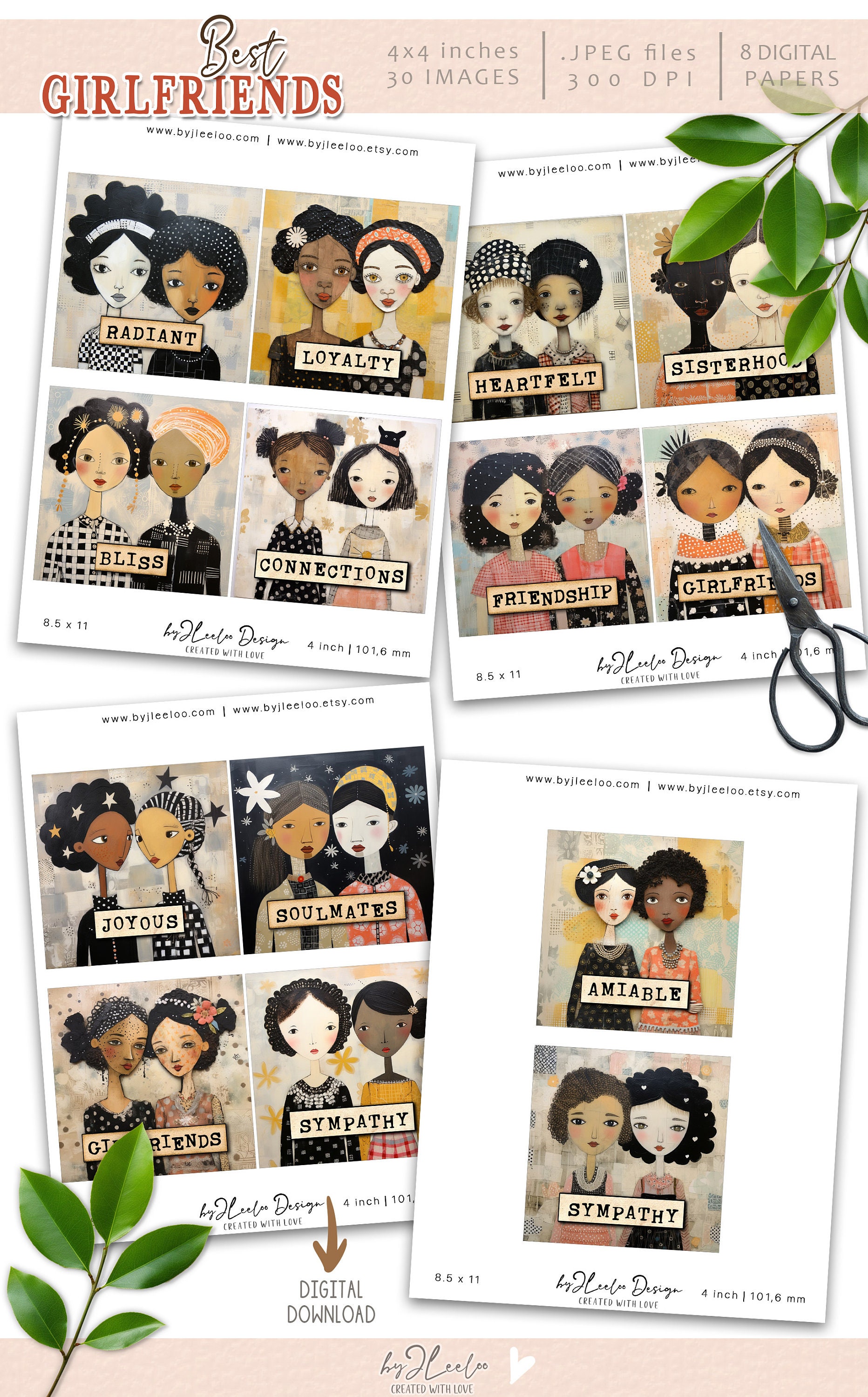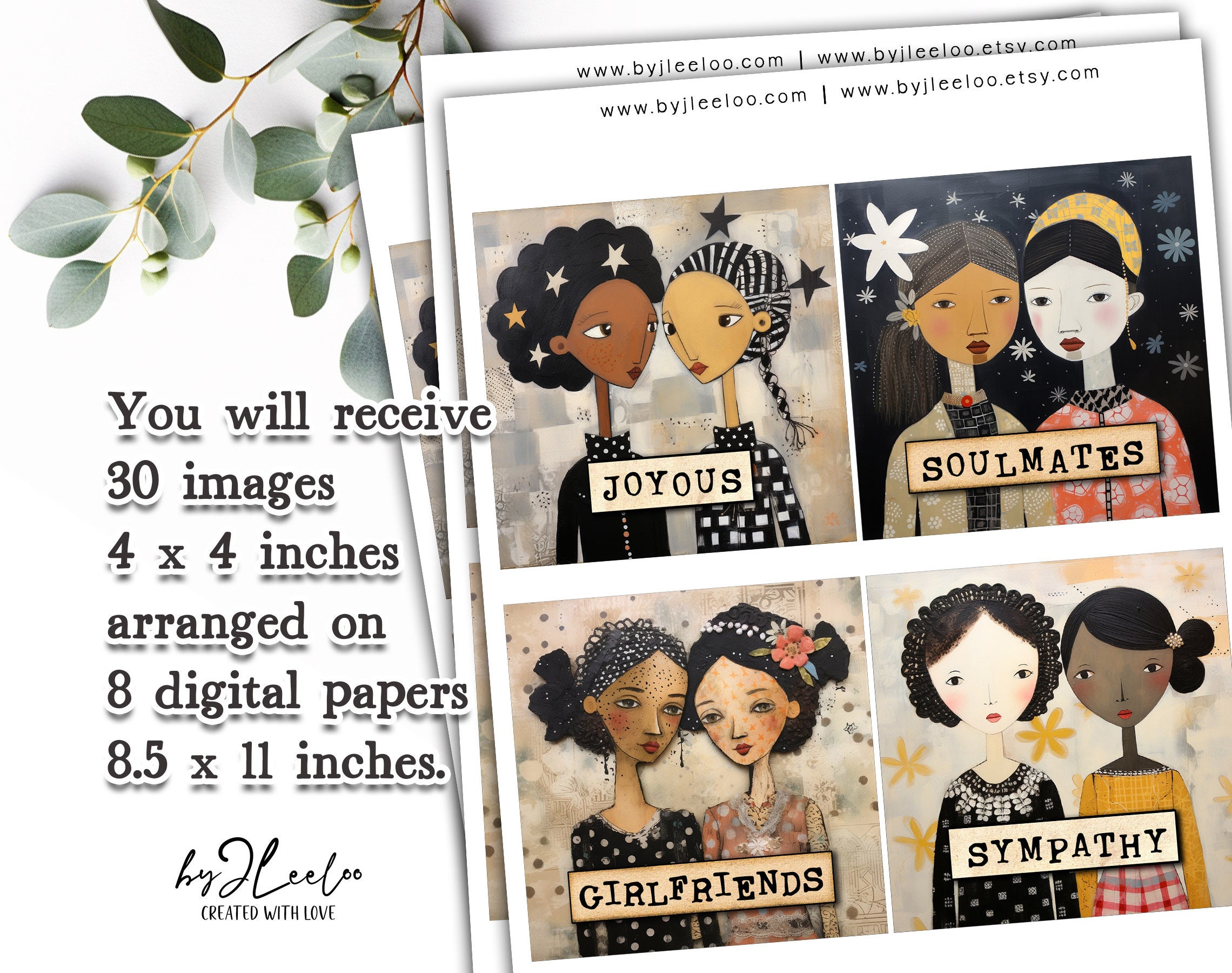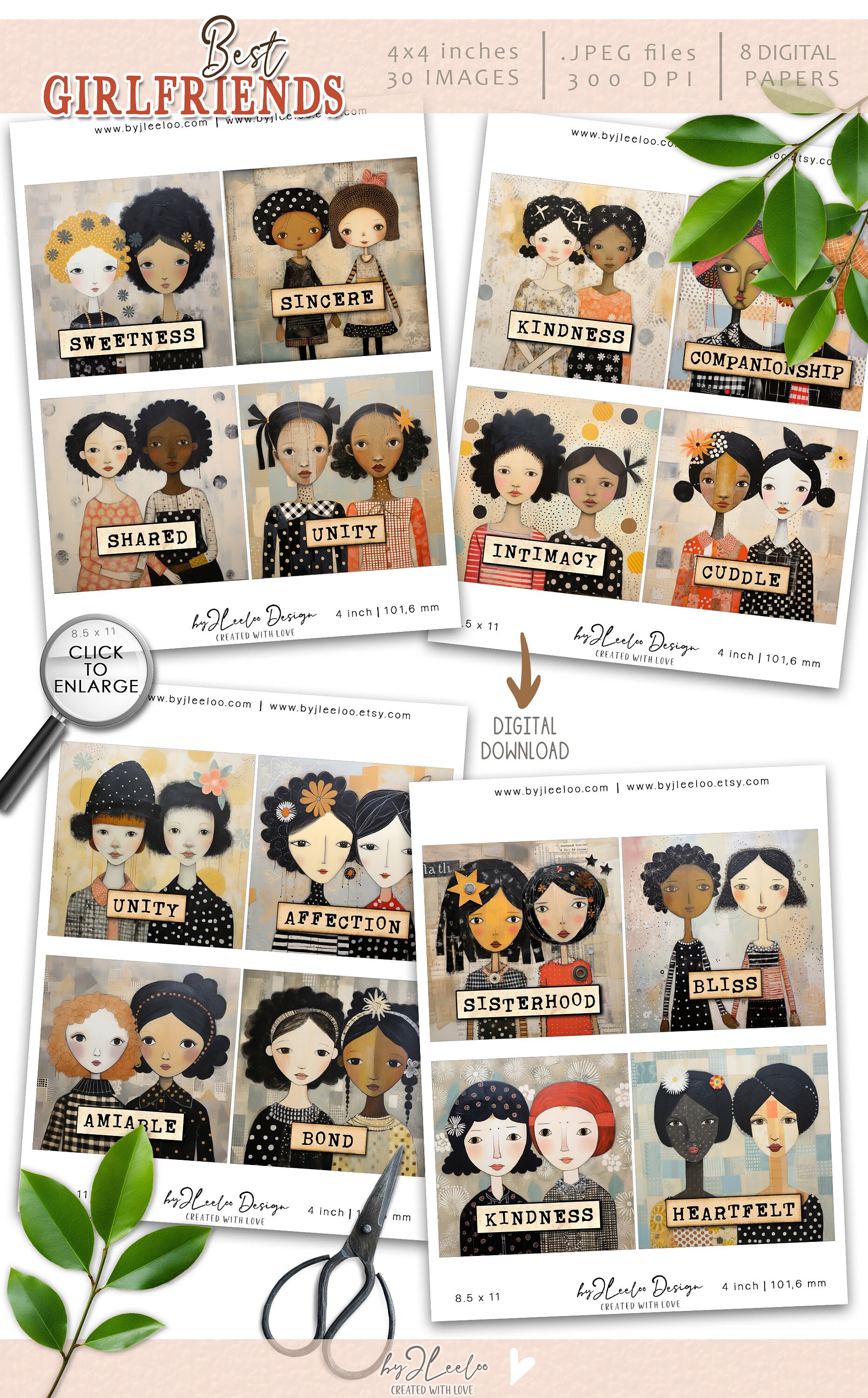 BEST GIRLFRIENDS 4x4 inch printable | Folk art supplies for coaster home decoration mirror magnet and craft | junk journal digital | qu591