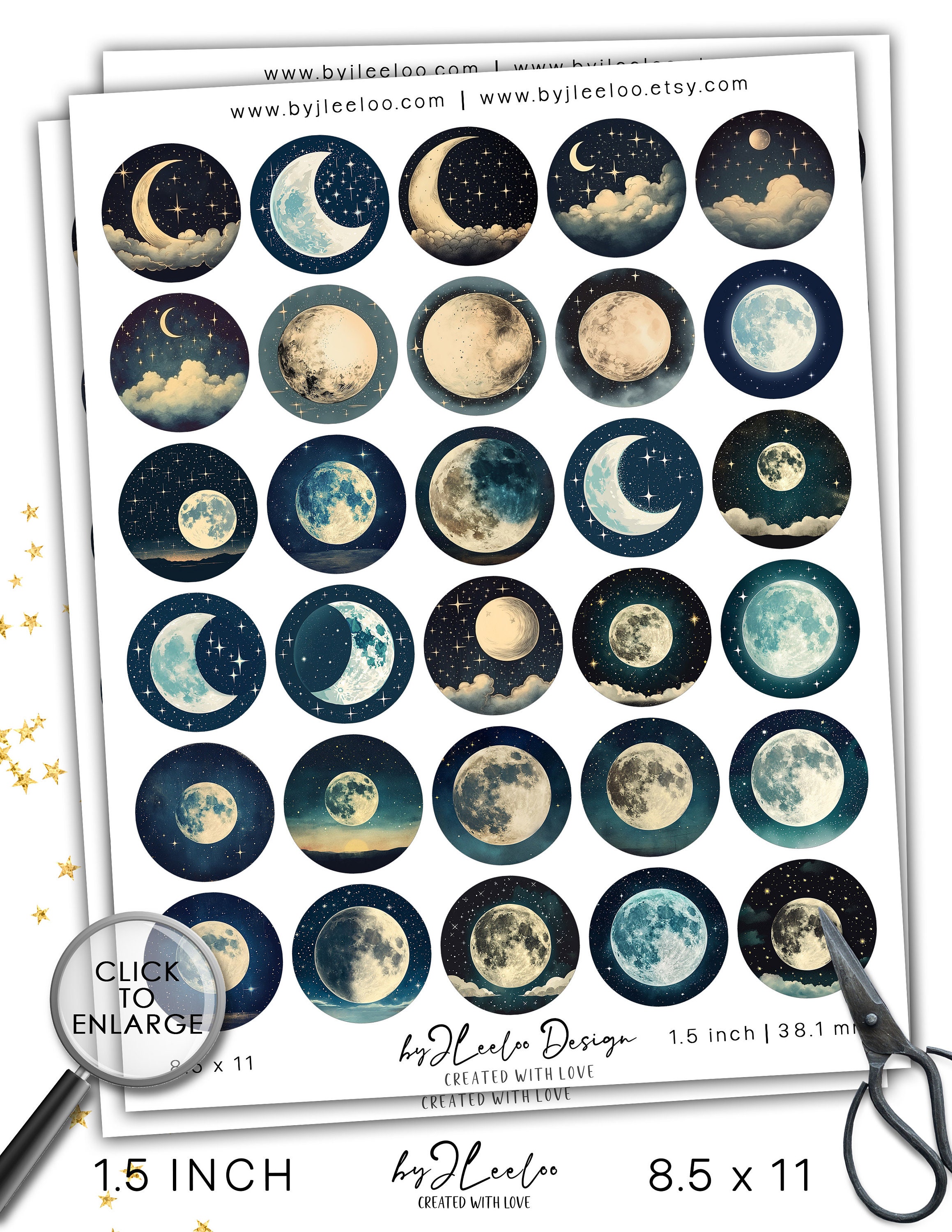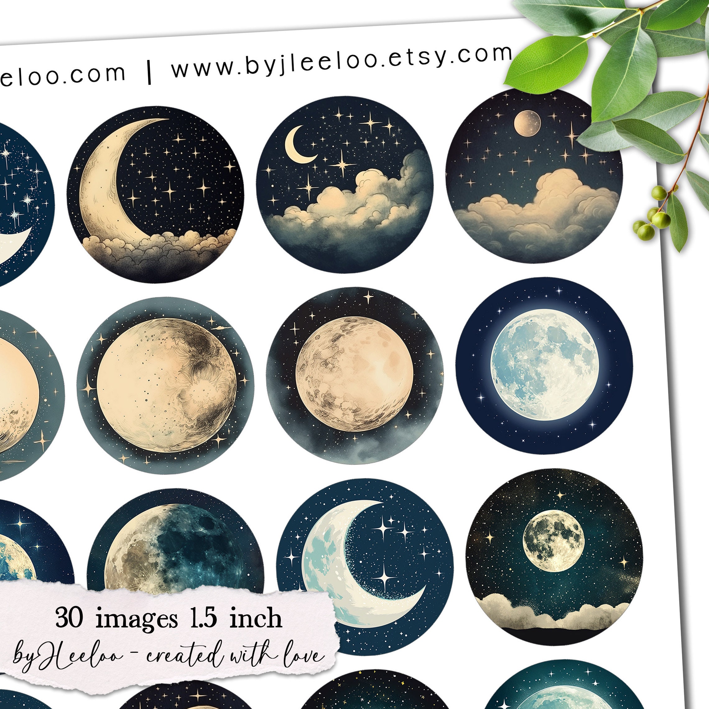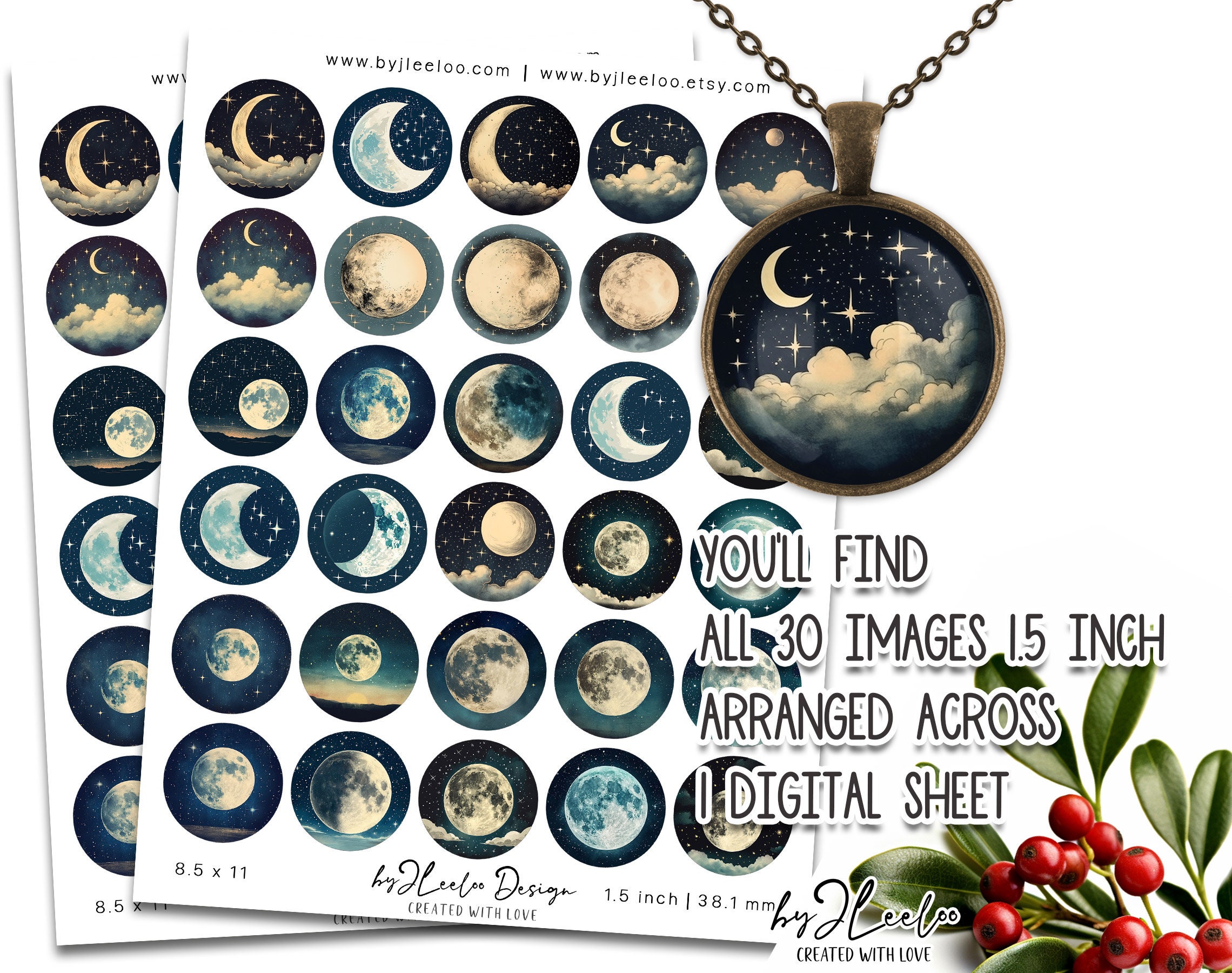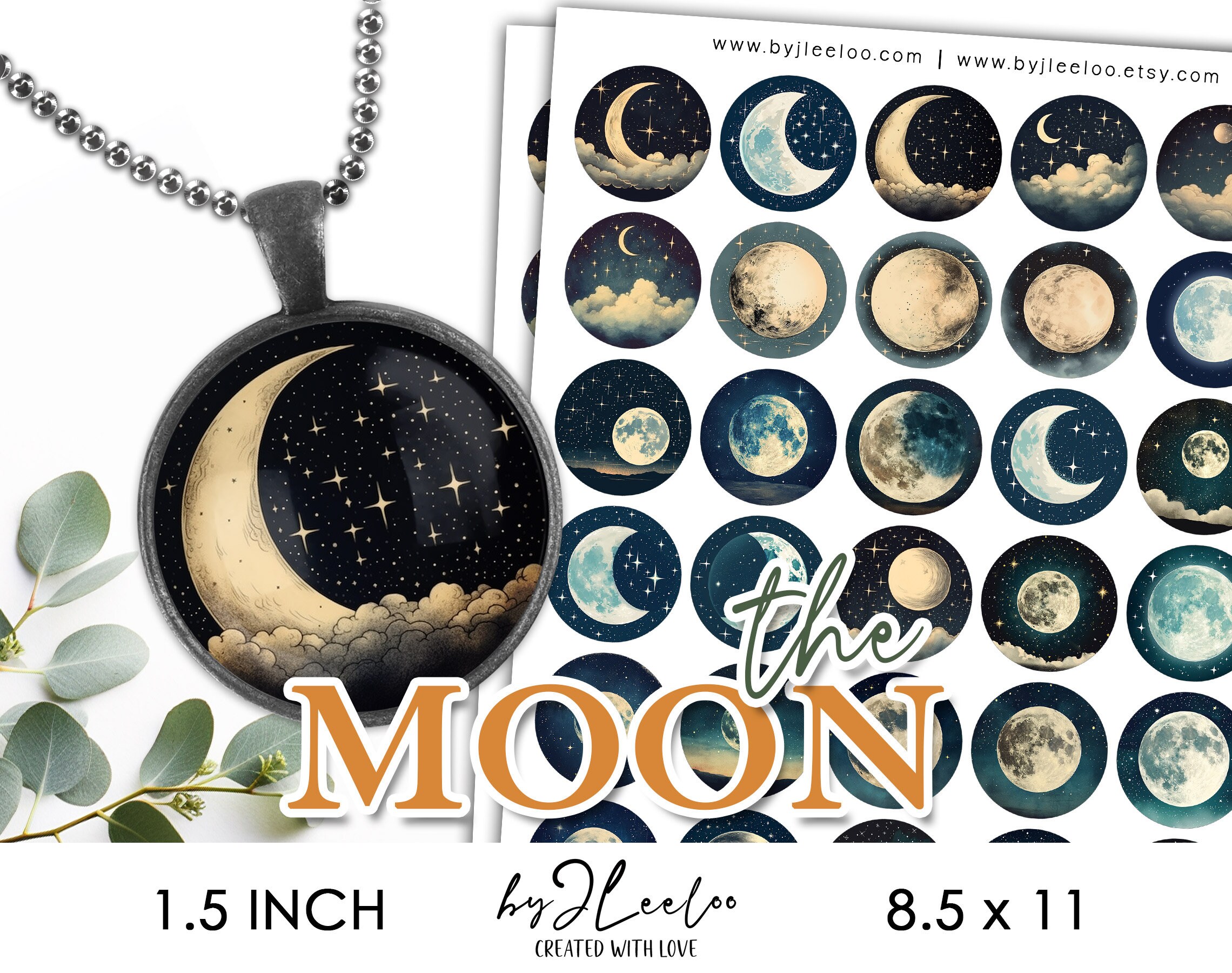 THE MOON 1.5 inch printable illustration starry night | supplies round pendant, bezel trays, glass cabochon mounting, cameo setting | tn735