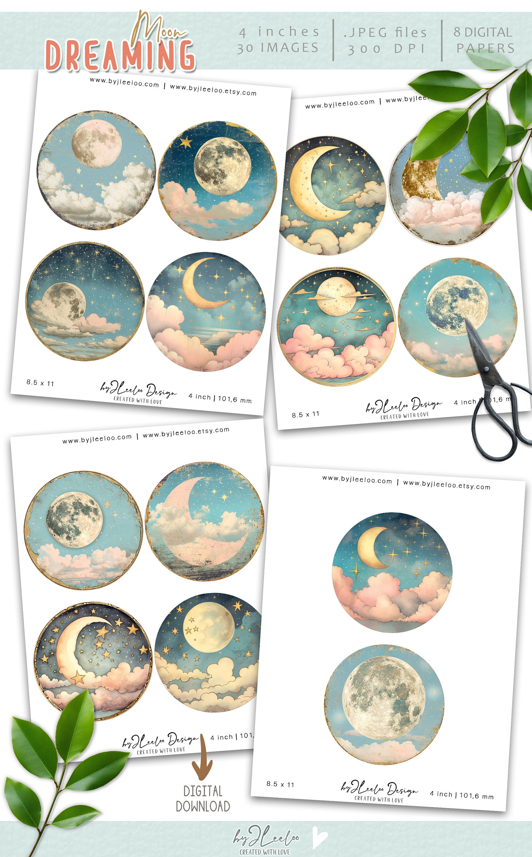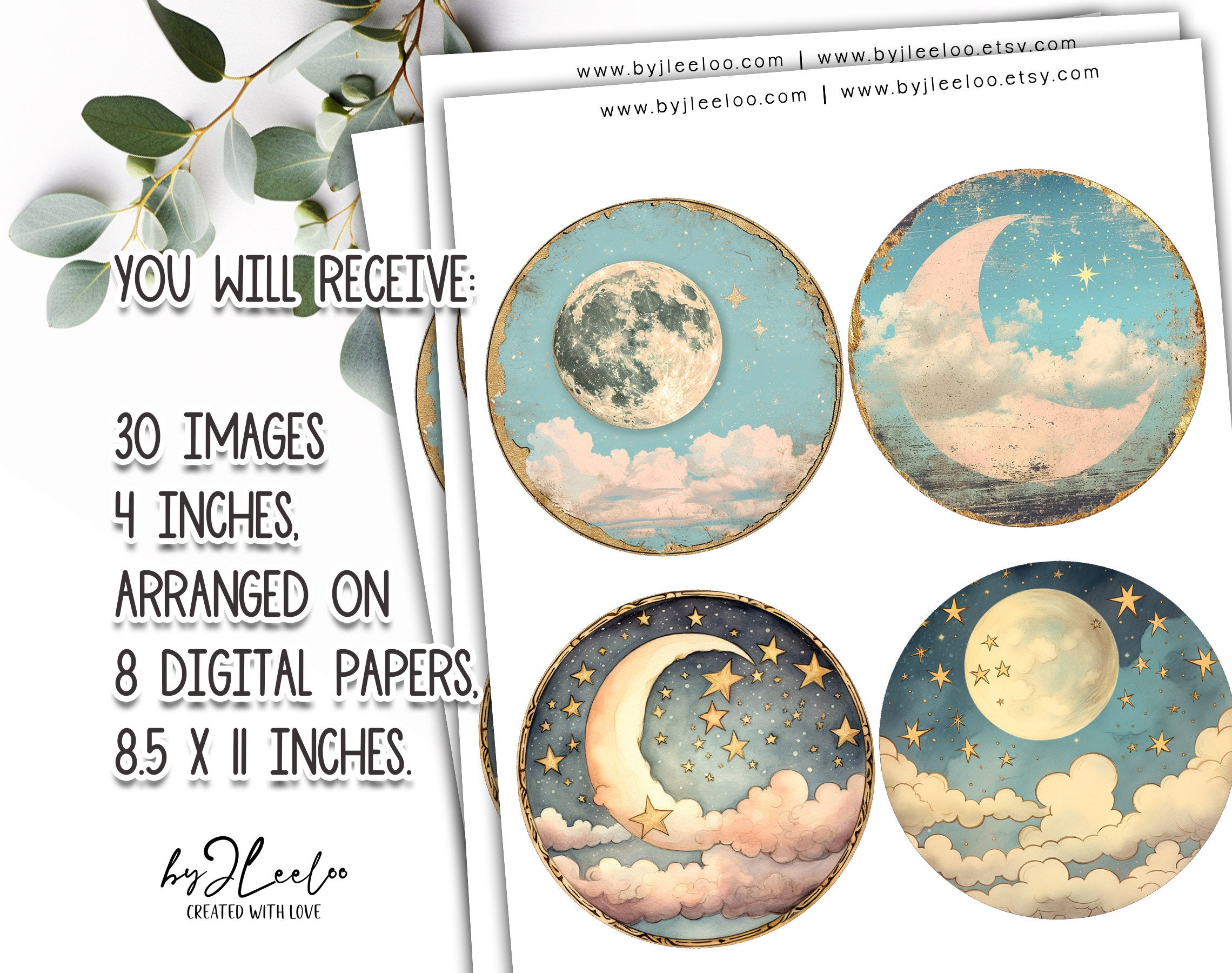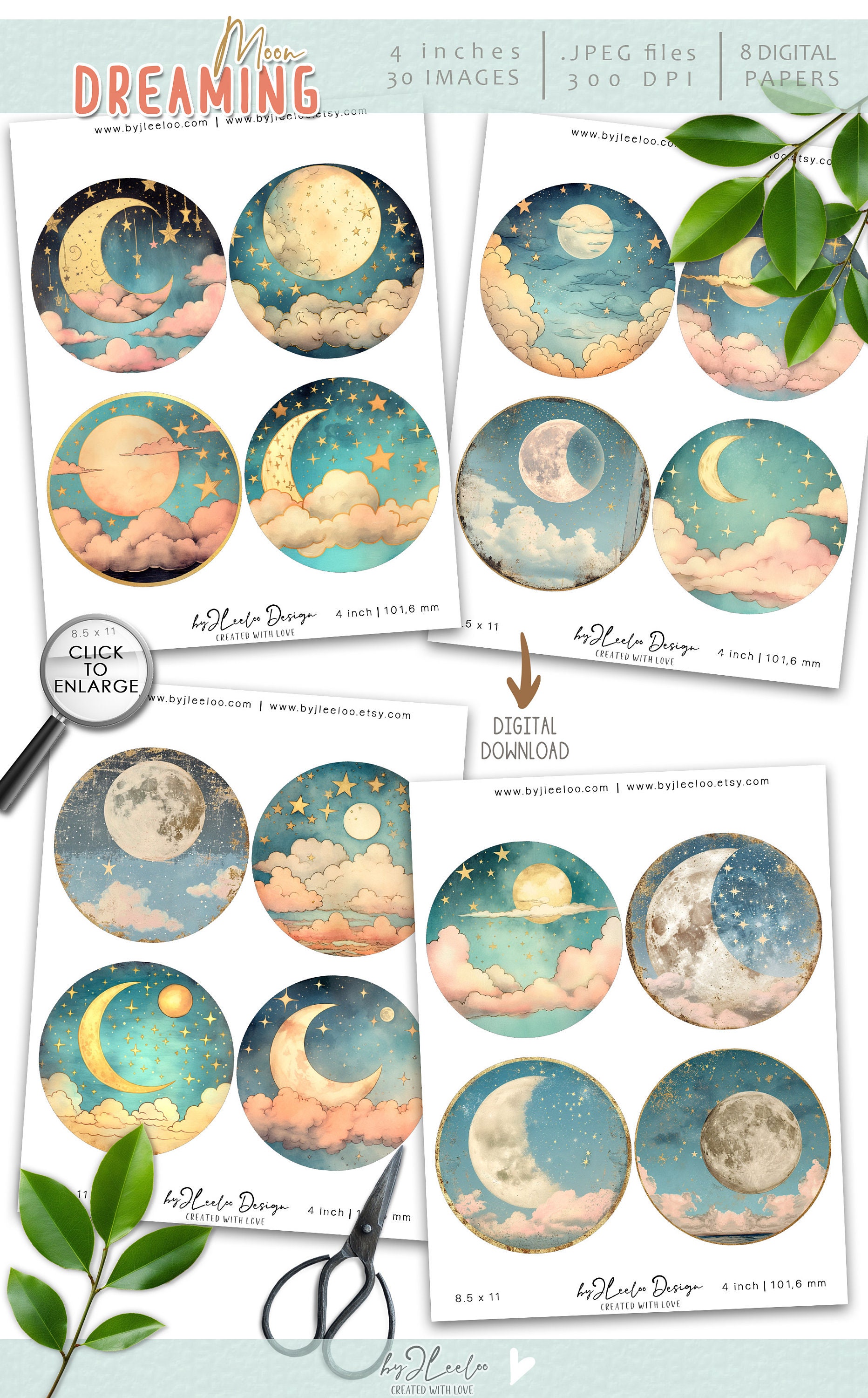 DREAMING MOON 4 inch circle printable | supplies for coaster decoration mirror magnet and craft instant download diy | Circle Labels | tn733