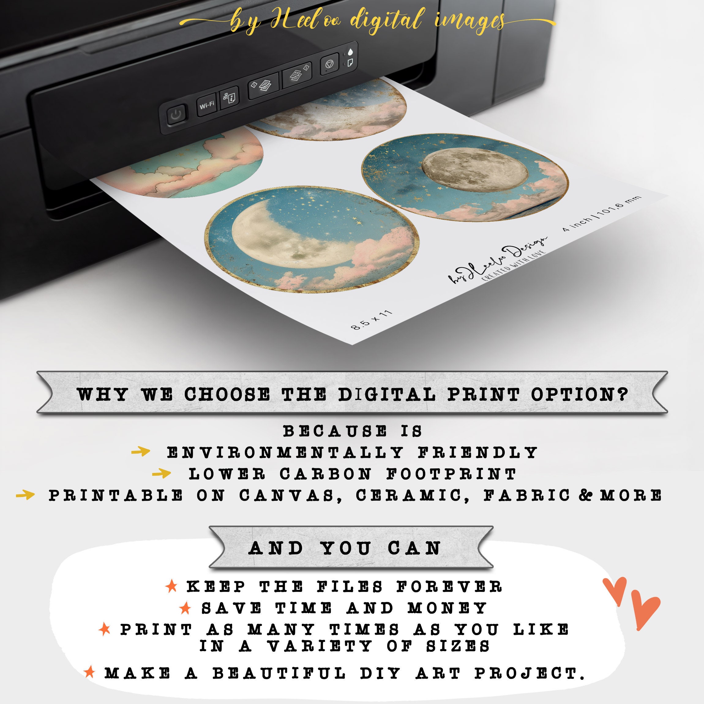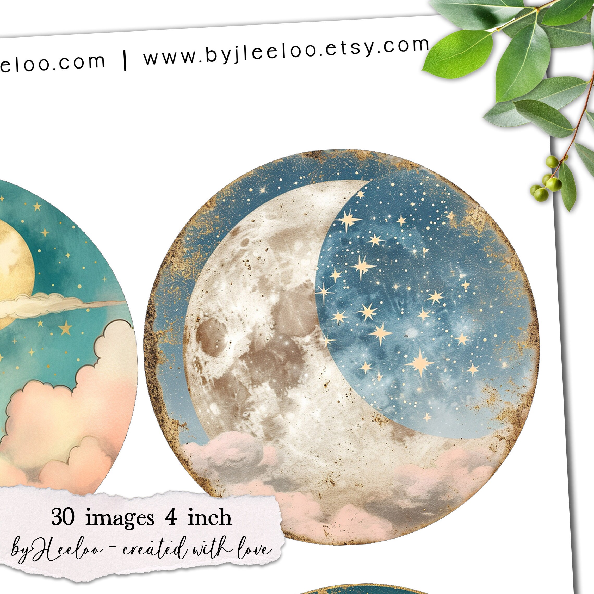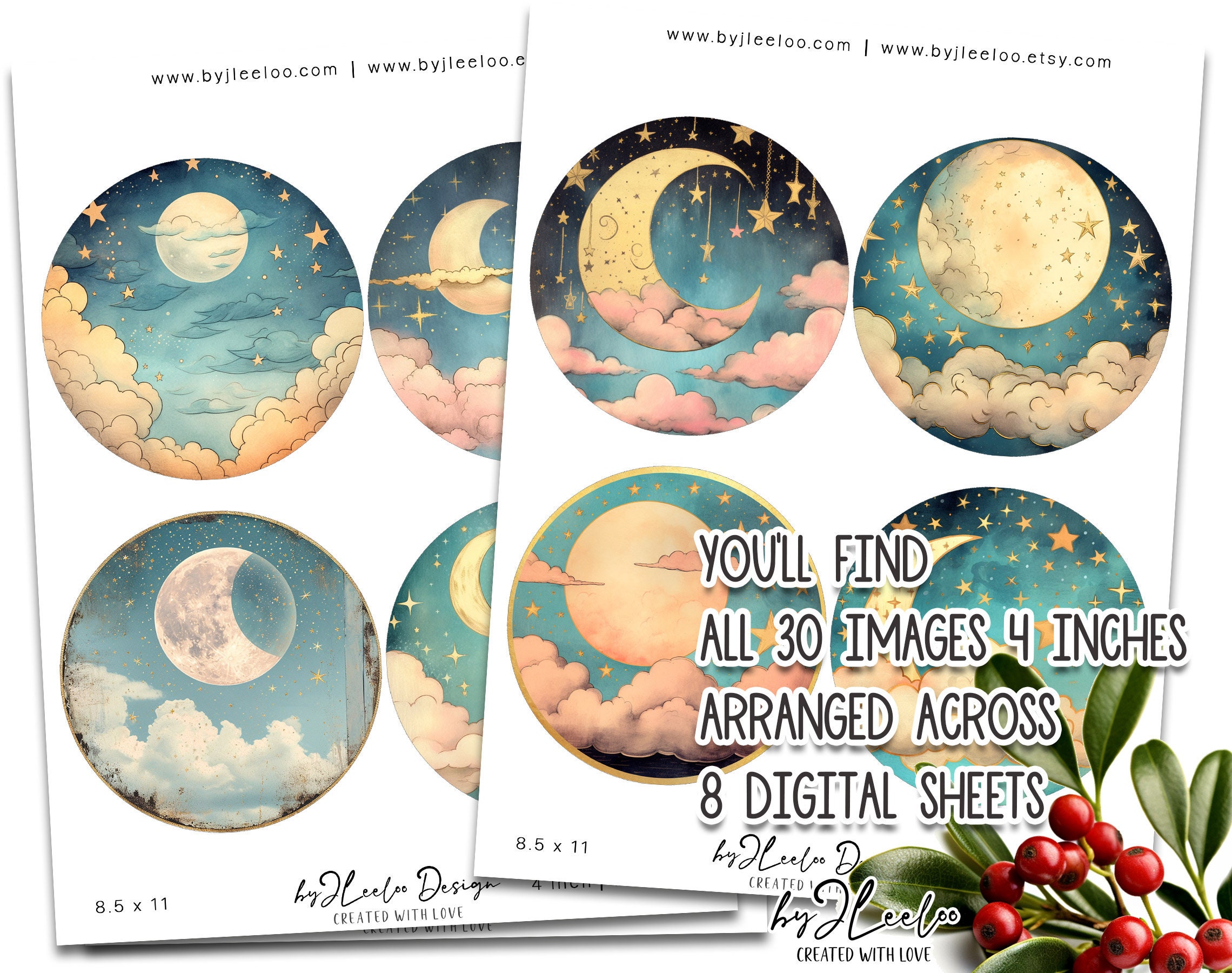 DREAMING MOON 4 inch circle printable | supplies for coaster decoration mirror magnet and craft instant download diy | Circle Labels | tn733