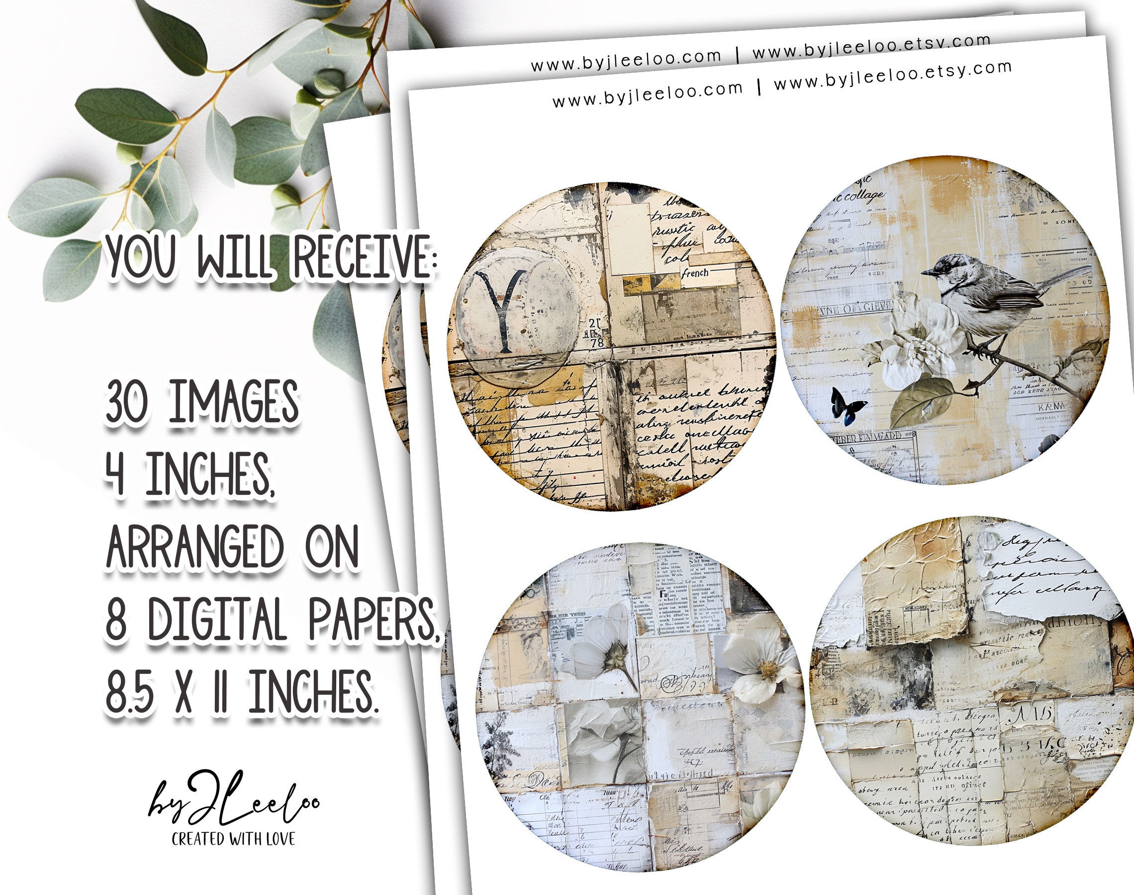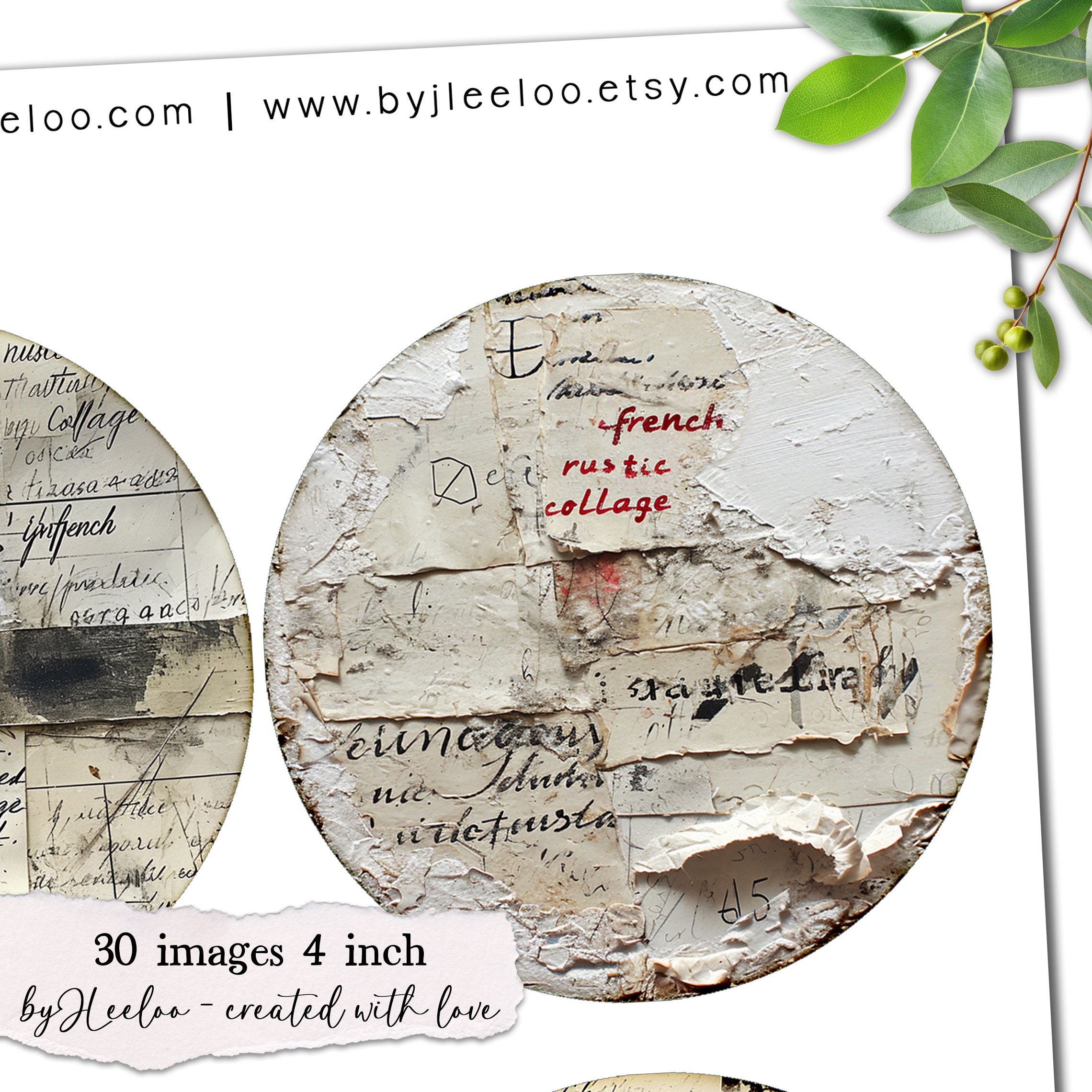 ๐ Embrace the enchanting allure of French rustic charm with my latest collection of round-shaped collages. These unique artworks, created on canvas without primer, boast a full-page design featuring carefully chosen aged papers in ivory and white hues. Titled 'French Rustic Collage' each piece is adorned with fragments of script and subtle hints of old letters, exuding a timeless aesthetic. Perfect for digital art, junk journaling, scrapbooking, and crafting various items like pendants, cards, stickers, magnets, and mirrors. Elevate your creative projects with the vintage-inspired elegance of these distinctive collages.